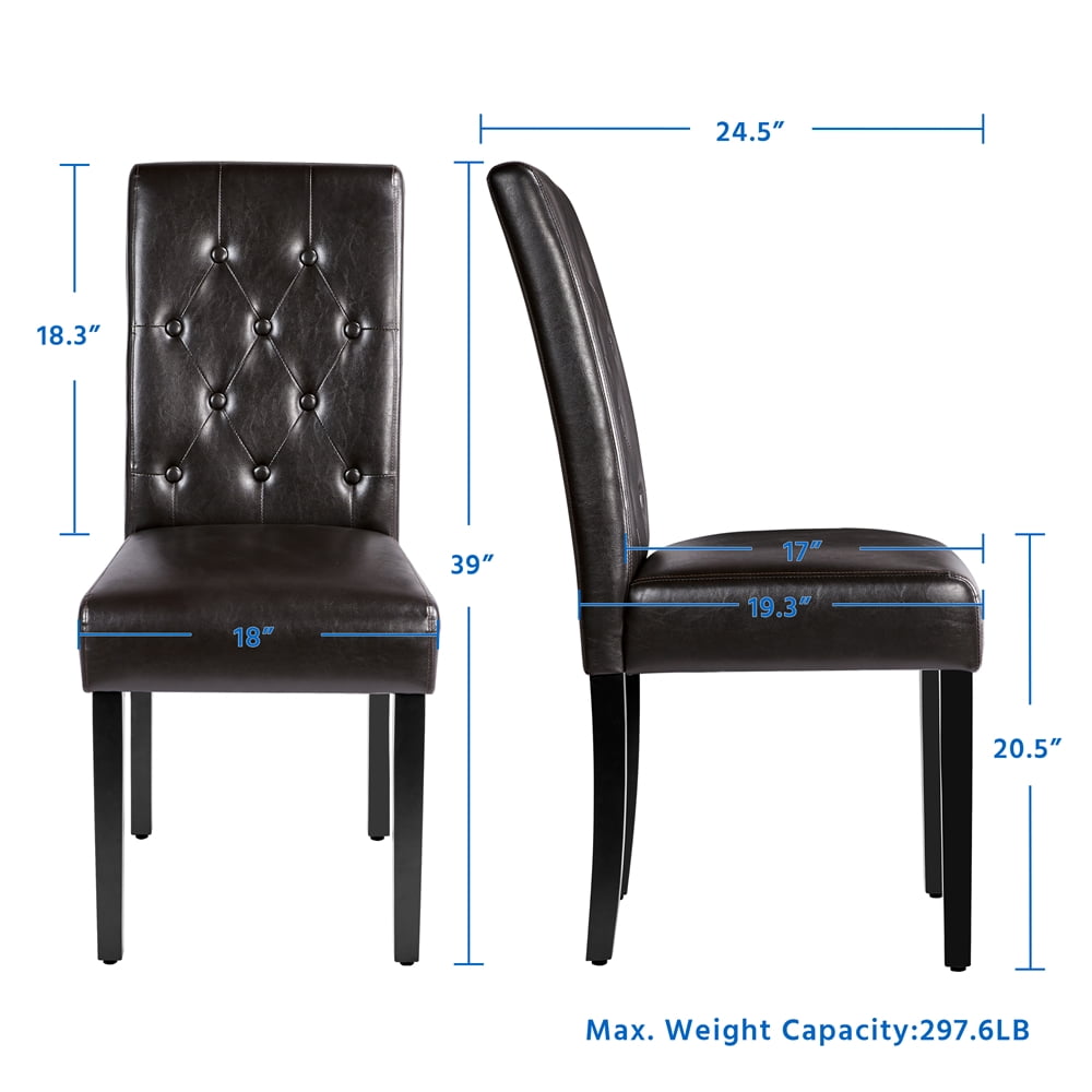Alden Design Tufted Upholstered Parson Faux Leather Dining Chair with Solid Wood Legs, Set of 2, Brown Dimensions: 18W x 24.5D x 39H inches Seat depth is 17 inches High density foam filling in the seats and back Set of 2 chairs Contructed with a strong wooden frame and high quality rubber wood legs Upholstered in waterproof PVC leather Weight Capacity: 297.6 lbs Button tufted back details Easy assembly required