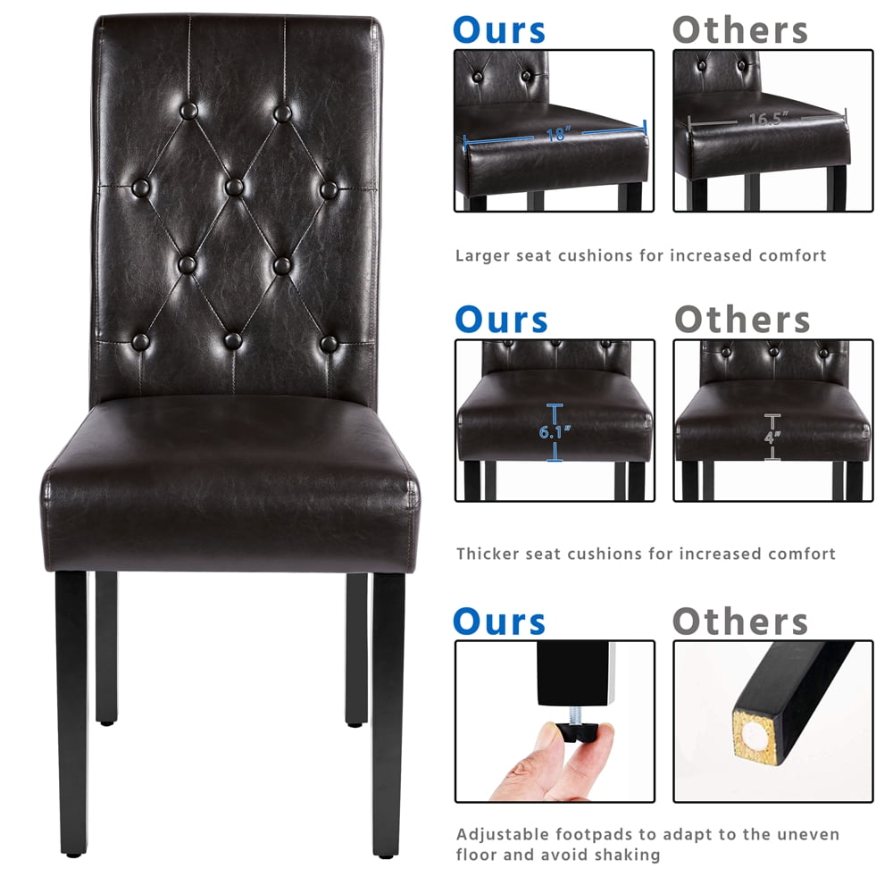 Make every long-time sitting comfortable. The dining chair is constructed with a solid wood frame, decent size seat, and tall backrest. Durable PVC leather seats filled with extra high-density foam and decorated with button tufting on the back. Simple style and elegant color perfectly fit your unique space and atmosphere. The front legs are designed with adjustable feet caps to keep the chairs height balance. We provide all the necessary hardware and tool, and an illustrated installation manual to help you set up this chair.
