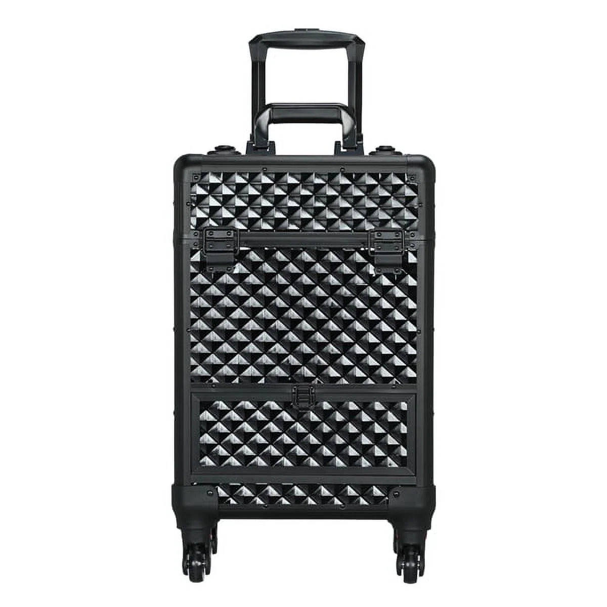 This sleek makeup train case is constructed of top-grade materials ensuring long-term durability. With a contemporary minimalist style combined with a small embossed argyle pattern, this makeup case is not only a practical tool but also a fashionable accessory. This makeup case sits on four high-quality wheels for quiet and effortless rolling. Detachable wheels can be easily removed or replaced if needed. Retractable trays allow for storing and organizing items like polish, lipstick, essential oil, hair pins, and more. This amazing makeup case is a must-have piece for professional beauticians.