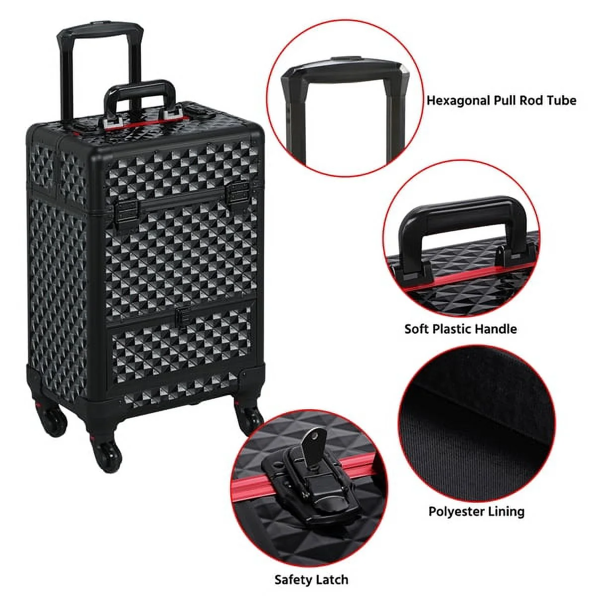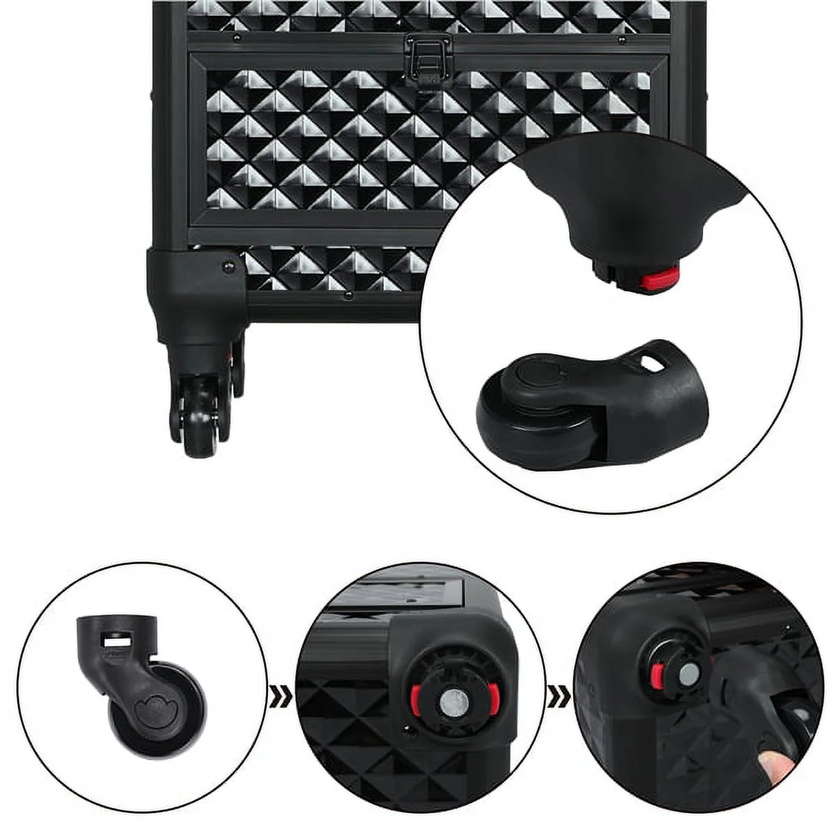 SmileMart Professional Makeup Case, 4 Retractable Trays & 1 Drawer, All Black: Material: ABS Plastic, aluminum, MDF, metal, polyester Case Dimension (wheel height included): 13.5″ L x 9.5″ W x 21.9″ H Pull Handle Maximum Height: 39.4″ Retractable Tray Size: 8″ L x 5.7″ W x 1.4″ H Upper Compartment Inner Size: 12.7″ L x 9″ W x 8.7″ D Bottom Drawer Inner Size: 10.6″ L x 8.3″ W x 3.9″ D Max. weight capacity: 22 lb G.W.: 16.7 lb N.W.: 13.9 lb