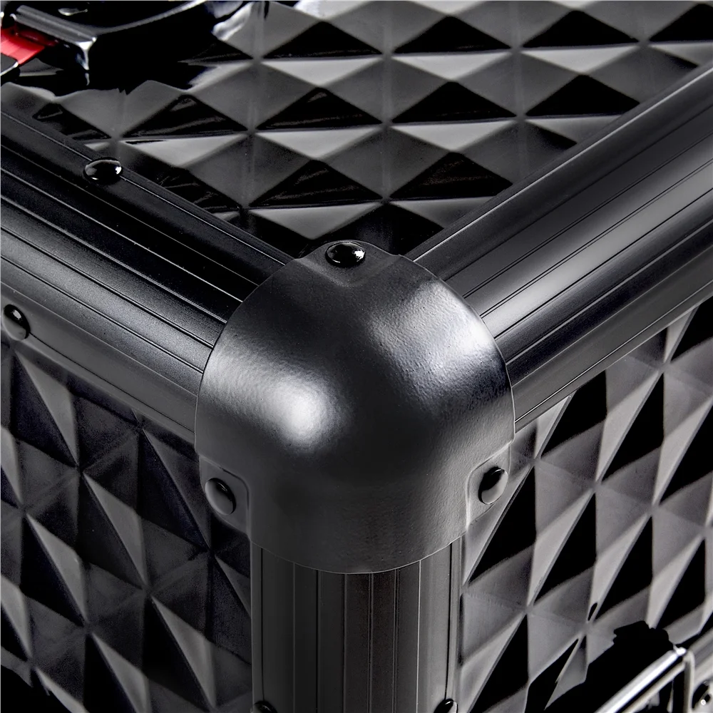 Our durable cosmetic case is made from high quality ABS and metal, with a sturdy aluminium alloy frame to ensure a long life. Constructed from CARB P2 compliant wood, this make-up trolley is equipped with a waterproof plastic surface and a sturdy aluminium alloy frame, ensuring excellent strength and durability. This professional make-up case has a 3-part design with exclusive compartments in different sizes and arrangements to keep all your make-up items organised. It also features a convenient aluminium telescopic handle that extends up to 39.4â³ and four universal wheels for effortless mobility.