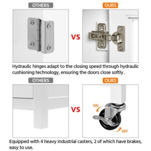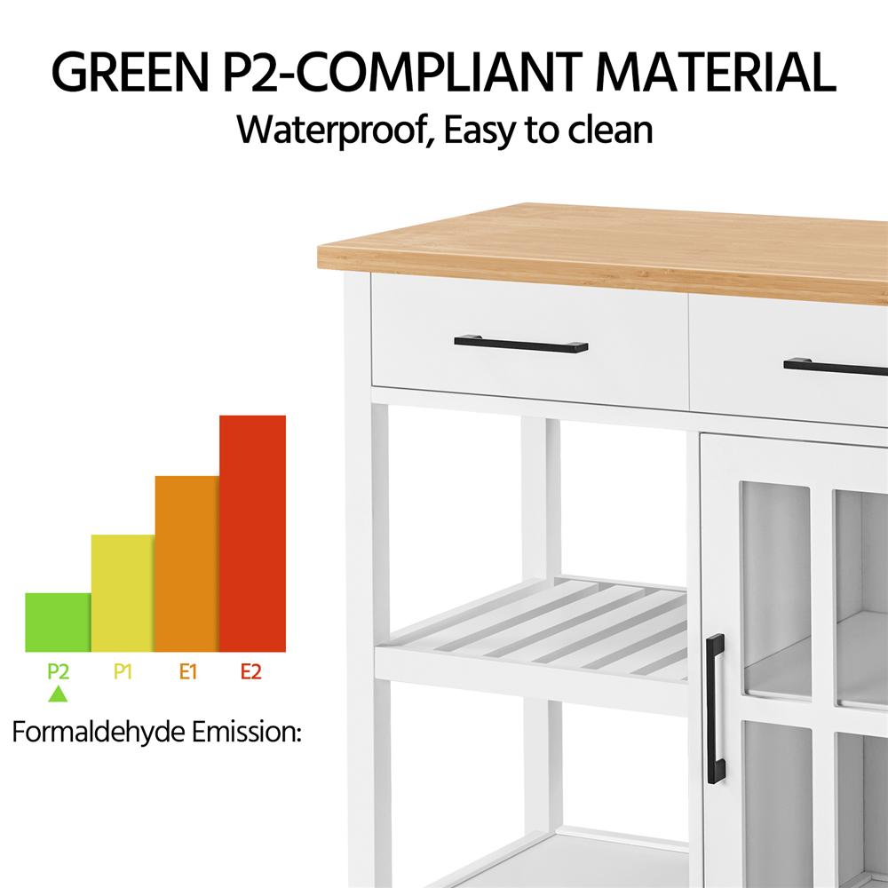 This space-saving kitchen cart has plenty of places to store all kitchen essentials. There are two storage drawers under the bamboo top, two open shelves on one side, and a 2-tier glass tempered cabinet on the other side. The interior shelf can be adjusted to different heights. Additionally, there is a towel holder on the side for kitchen towels or paper towels. All of these places are perfect for keeping kitchen essentials tucked away. The materials are high quality, sturdy and durable, guaranteeing this piece will last a long time. The white finish and light oak blend in perfectly with any home decor style.