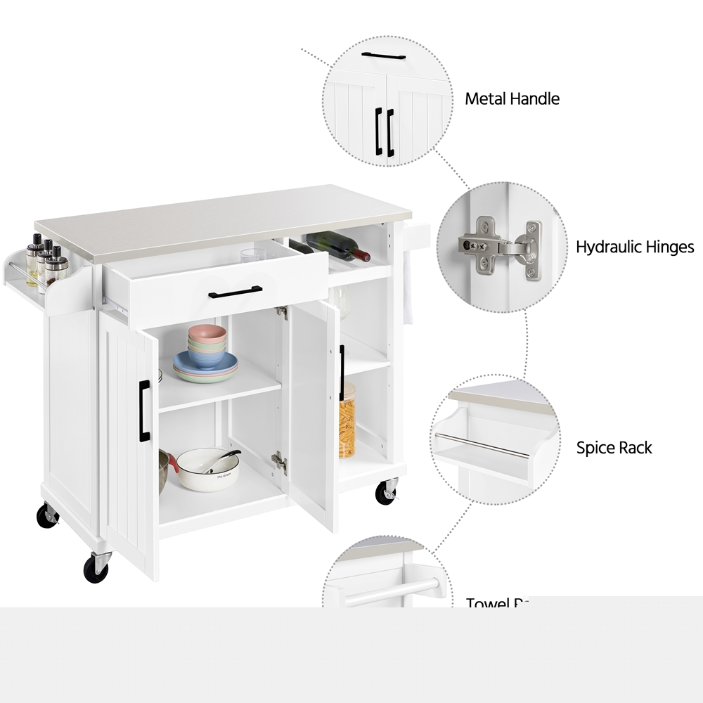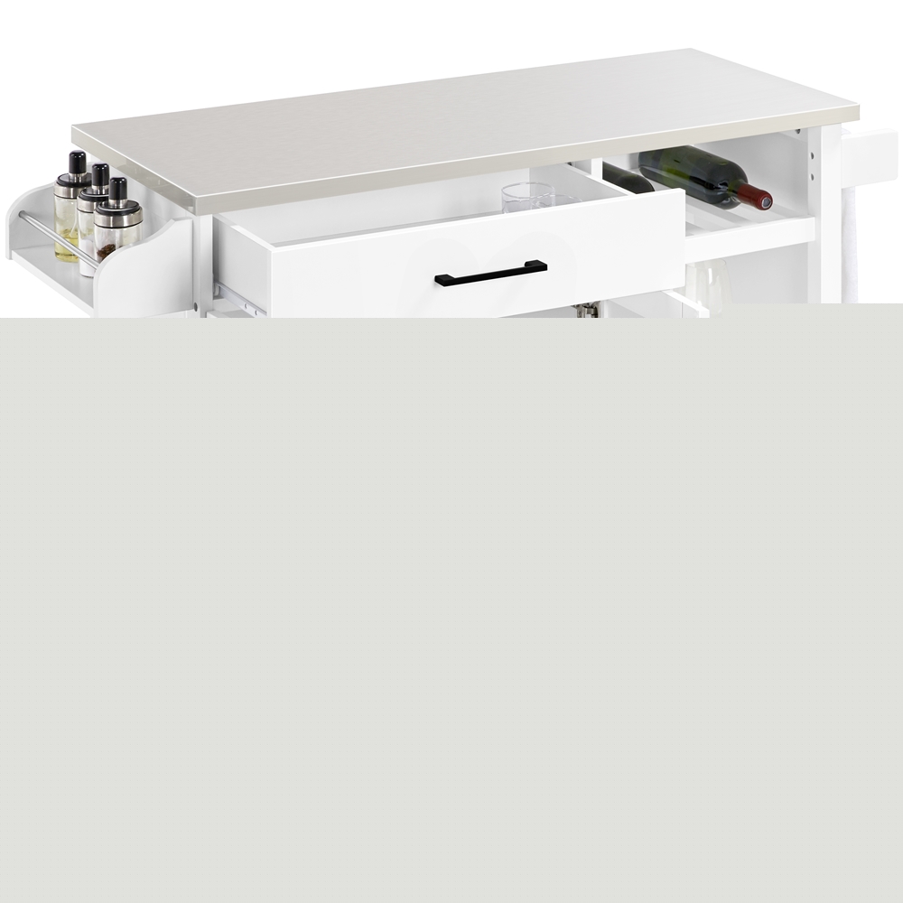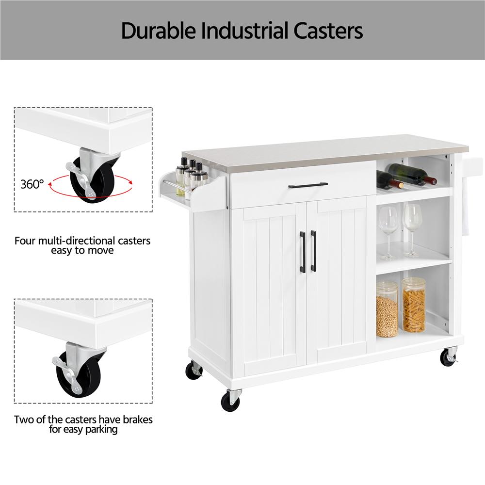 This kitchen cart is the perfect staple piece for any dining room. The rolling, mobile wheels allow you to customize the positioning of it in your kitchen. Two of the four wheels are lockable, so once you found the perfect spot you can lock it in place! The cart is made from strong engineered wood with a thick, stainless steel countertop. The sturdy and durable materials guarantee that this kitchen island cart will last a long time. We have included a towel bar, wine rack, spice rack, and cabinet space so you can store all the essentials! The shelving is adjustable in case you have accessories at different heights. Simple assembly is required and detailed instructions are included.
