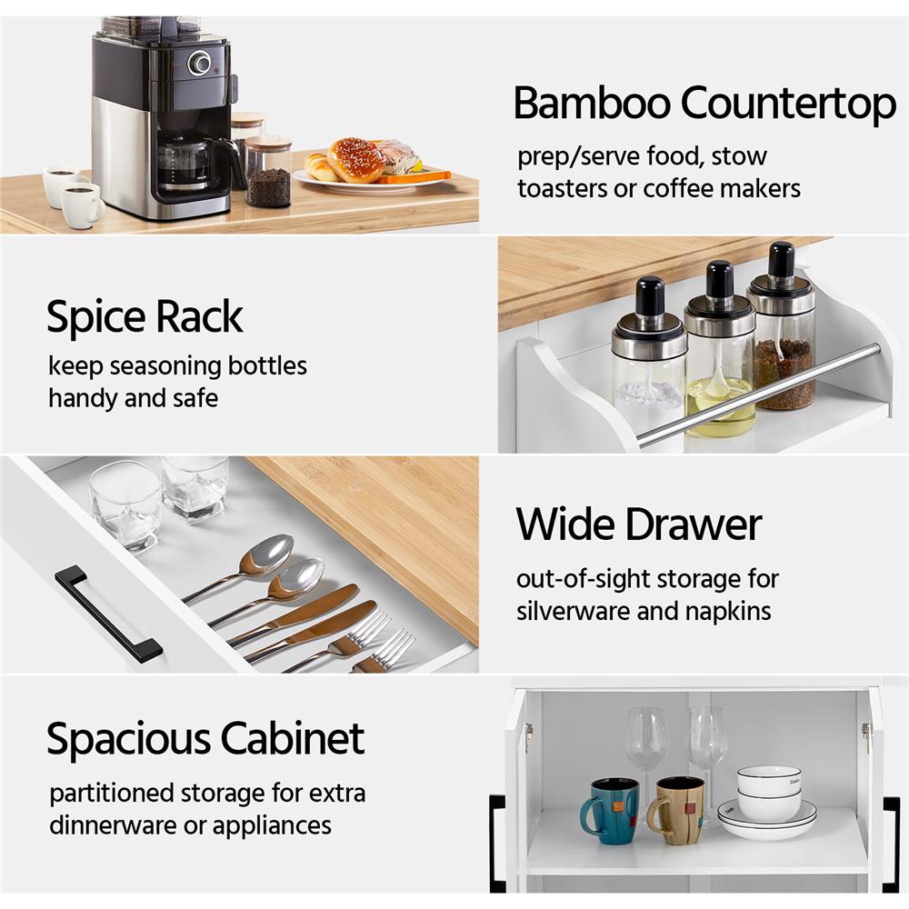 – Weight capacity: tabletop: 42kg/99lb; drawer: 5Kg/8Lb; shelf: 15kg/33lb; bottom shelf: 15kg/33lb; spice rack: 3kg/6.6lb