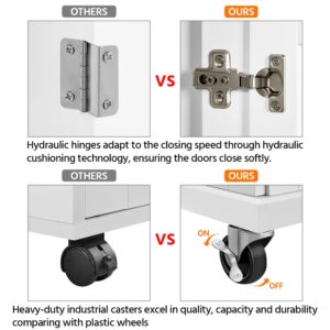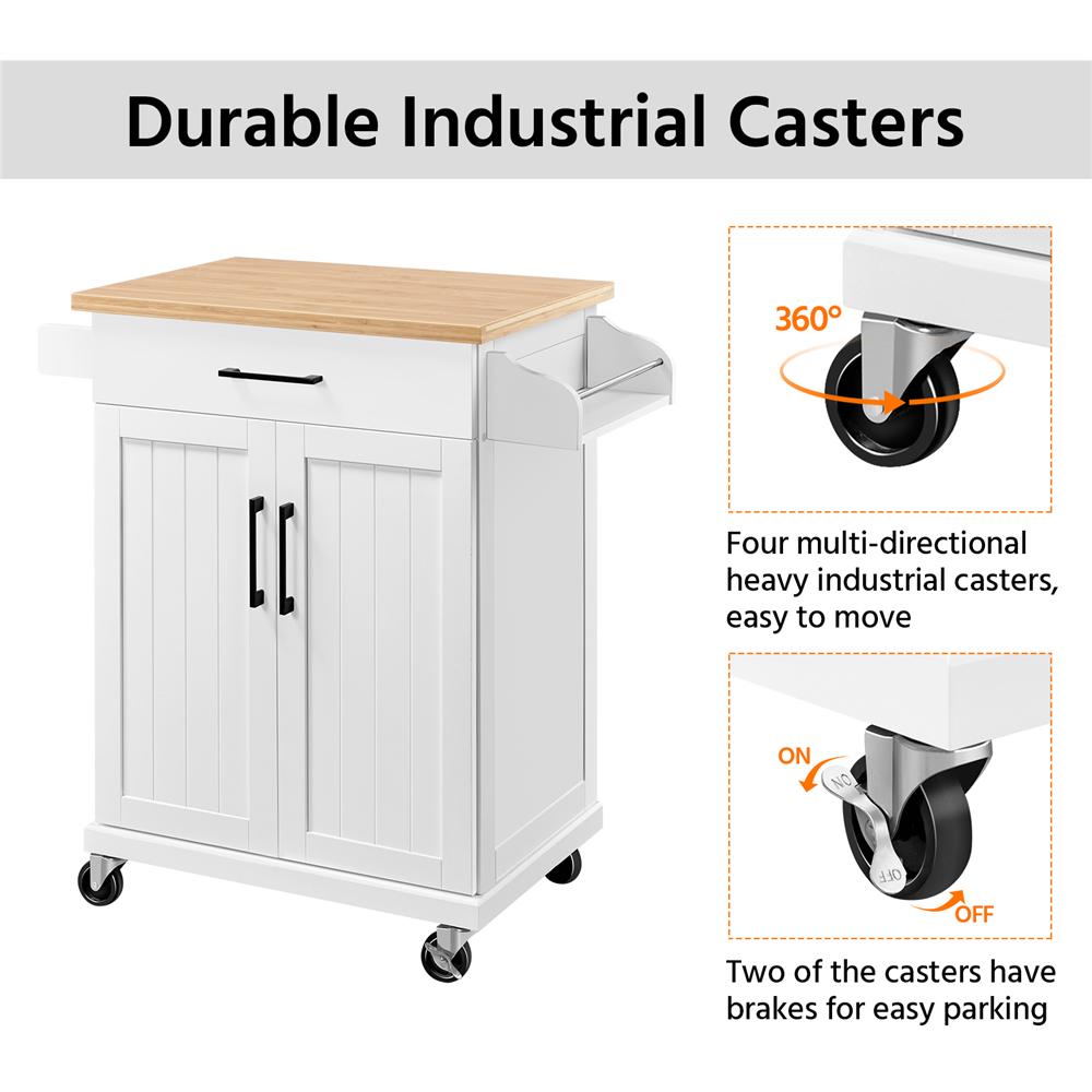 This kitchen cabinet has four 360 degree swivel wheels, two of which are lockable. This allows the cart to move flexibly around the room and take advantage of the space. The cart features a slide-out drawer under the top and a storage cabinet with two doors on the bottom. The bottom cabinet features an adjustable shelf so you can customize your storage space. This is a great piece to store kitchen accessories, utensils, plates, toaster, spice, dishes, etc. There is also a spice rack and a towel holder. It is made of high quality materials that are water-resistant and durable, guaranteeing the product will last a long time. The modern white and oak look blends perfectly with any home decor style.