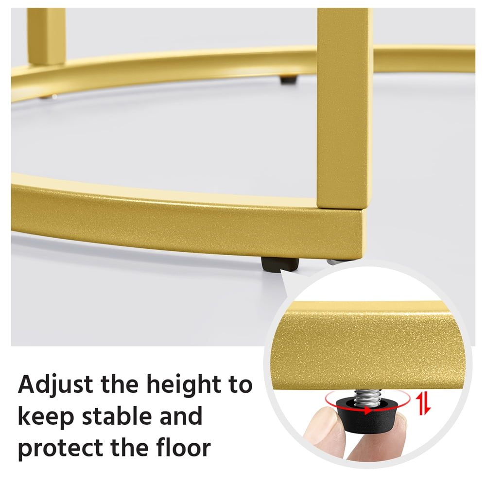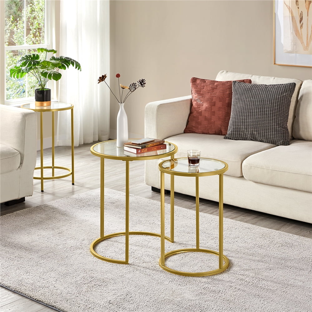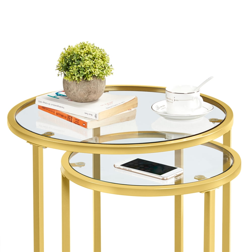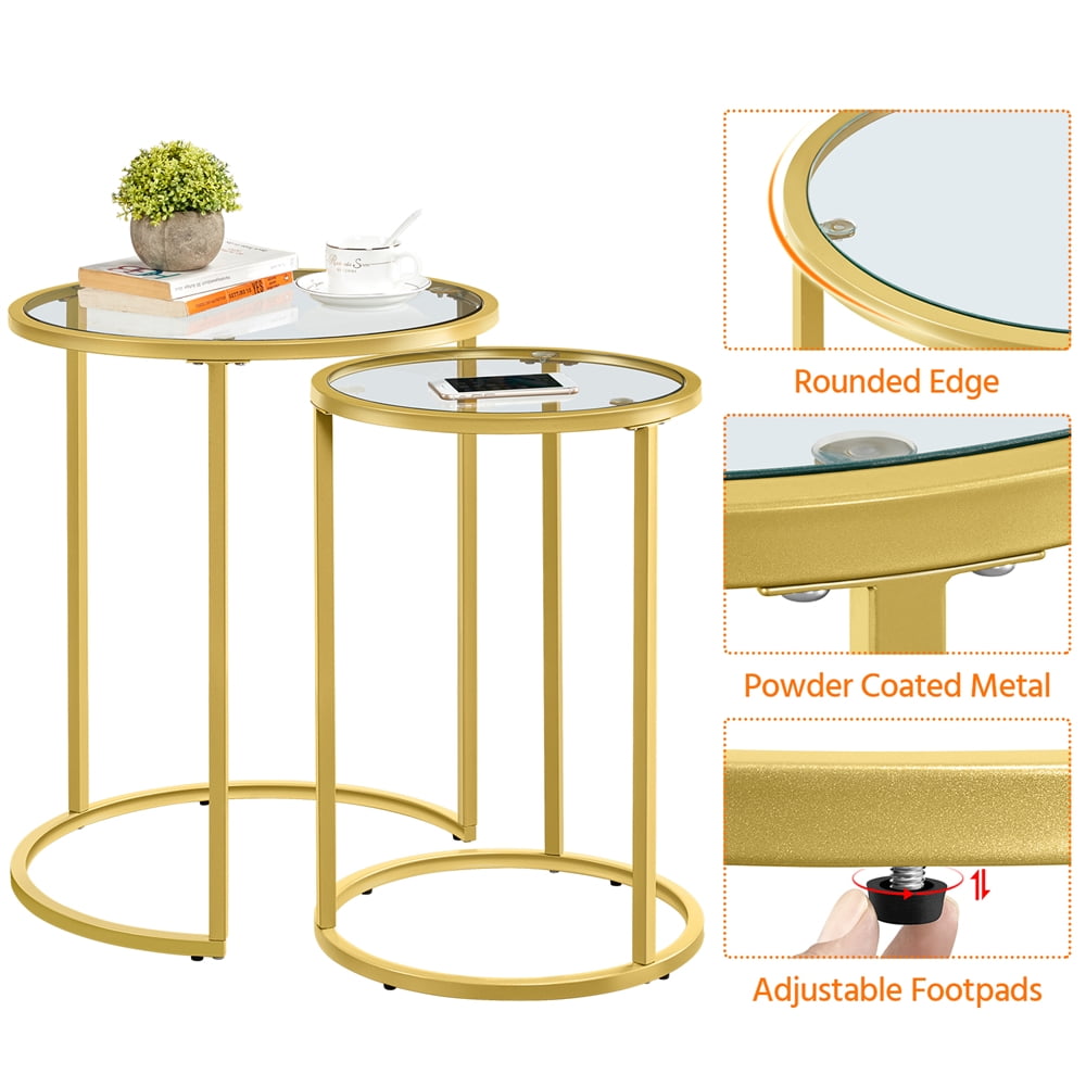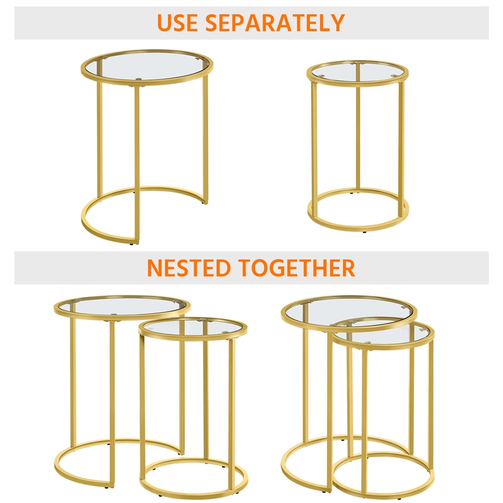 SmileMart Metal Round Nesting End Table Set with Glass for Small Space, Gold Top: STURDY&SAFE: Crafted of premium iron frame and strong tempered glass, these chic accent tables are sturdy and stay on all kinds of floors. With the smooth surface and round shape,safe for family use. NESTING DESIGN: This set of nesting end tables can be nested together to match different sized space and gives you a beautiful feeling. The smaller table fits neatly under the larger table, so you can save space when they are not in use.It can be used for the living room, bedroom, guestroom, office, apartment and small space. QUICK ASSEMBLY: It is super easy to put this nesting table set together. All necessaries and instructions are accompanied in the package and the table has been well-packaged for better protection.Specifications: Color: Gold Material: Iron, tempered glass Overall dimension: Big: 49.5 x 49.5 x 59 cm/19.5 x 19.5 x 23.5” (LxWxH); Small: 37.5 x 37.5 x 54 cm/15 x 15 x 21.5” (LxWxH) Maximum weight capacity: Big: 27kg/60lb; Small: 16kg/35lb N.W.: 7.3kg/16.1lb G.W.: 8.4kg/18.5lb Please allow ±1cm/0.5” error due to manual measurement.