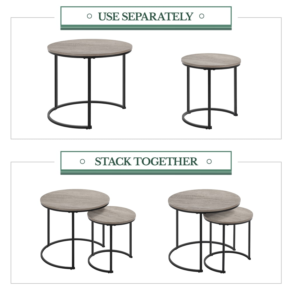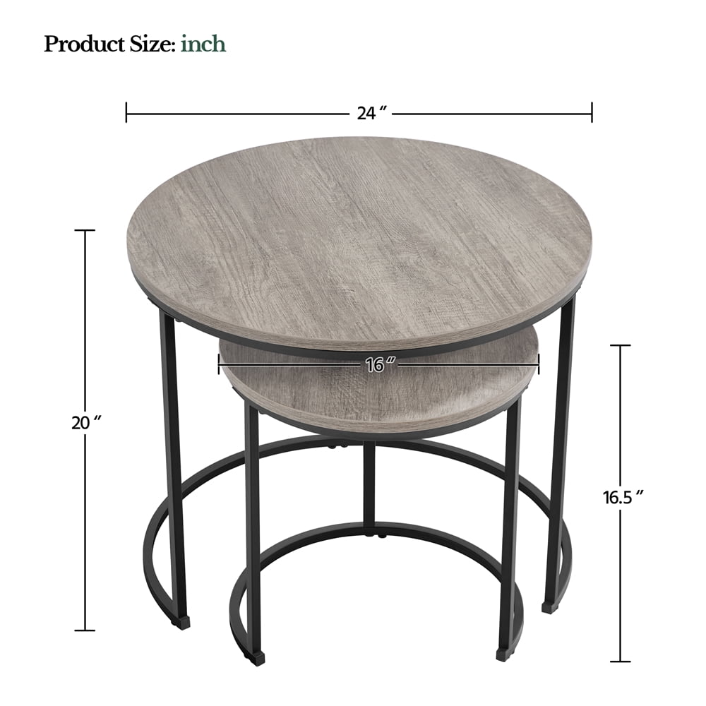 Alden Design Rustic Nesting Coffee Table Set with Round Wooden Tabletop, Gray: Color: Gray Material: MDF&Iron Overall dimension: Large: 60 x 60 x 50.5cm/ 24 x 24 x 20” (LxWxH); Small: 40 x 40 x 41.5cm/ 16 x 16 x 16.5” (LxWxH) Maximum weight capacity: Large: 45kg/ 99lb; Small: 40kg/ 88lb N.W.: 6.5kg/ 14.3lb G.W.: 8.4kg/ 18.5lb Note: Please allow ±1cm/0.5” error due to manual measurement.