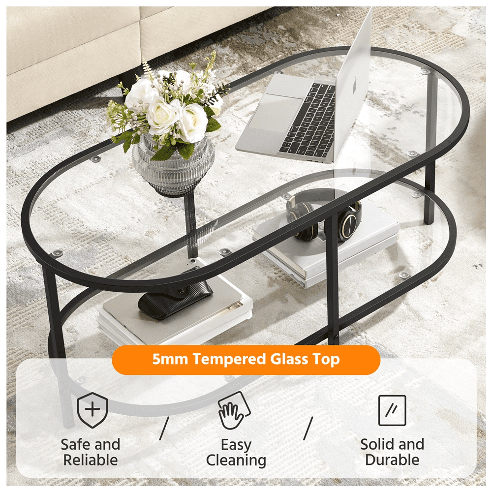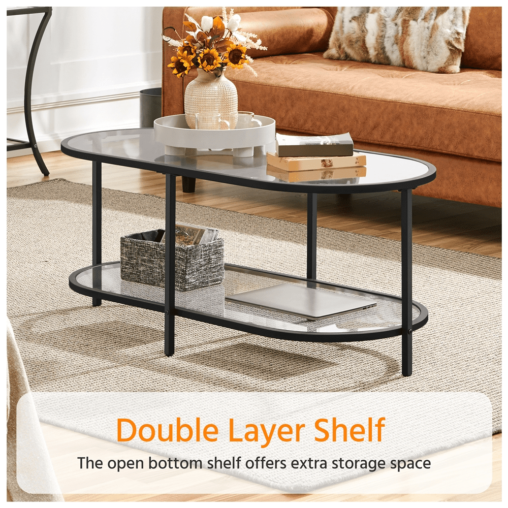 Alden Design Two-layer Modern Oval Glass Coffee Table for Living Room, Black Color: Black Material: tempered glass, iron Dimension: 41.7″ L × 19.7″ W × 17.3″ H Tabletop: 41.7″ L × 19.7″ W Shelf: 40.3″ L × 18.3″ W Max Weight Capacity: top/ shelf: 99 lb Item Weight: 31 lb Shipping Weight: 37.5 lb Note: Please do not stand on this coffee table. Please allow ±1/12″ measurement tolerance. Robust Materials Stable Structure Double-layer Structure