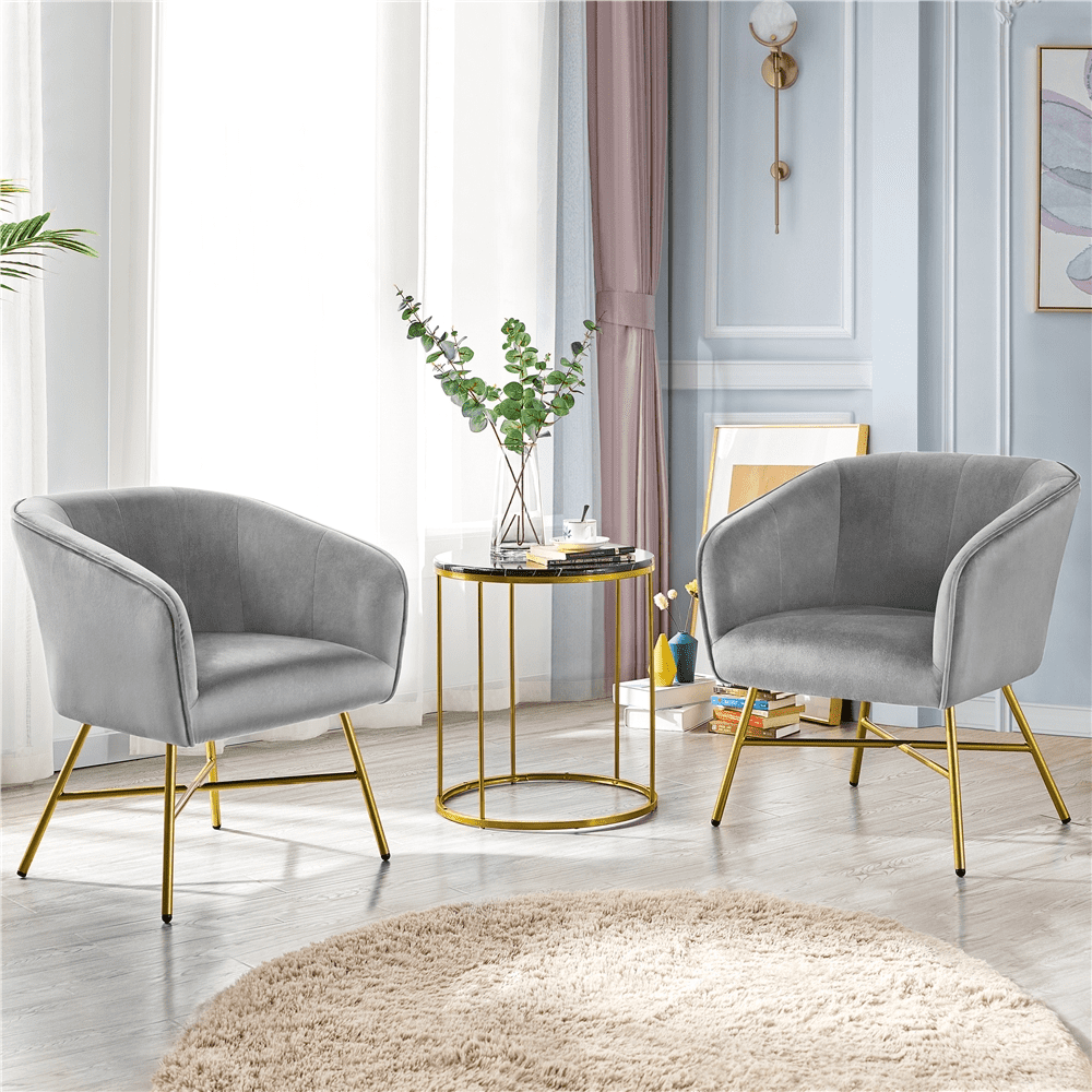 The accent chair is made of durable plywood, foam, metal, and non-woven fabrics, which provide ample support while seated. This sleek velvet club chair is the perfect accent piece for any living room space. The slim, black metal legs and the velvet barrel back are both modern and transitional, so this chair blends in perfectly with any home decor. The rounded back makes it the perfect spot to curl up and feel cozy sitting in any style. The soft velvet fabric is smooth to the touch and elegant in appearance. We have included adjustable footpads so this chair is sure to be stable and not damage the floors. Simple assembly is required and detailed instructions are included.