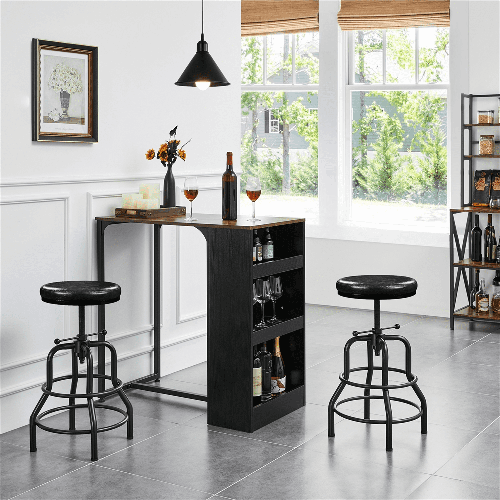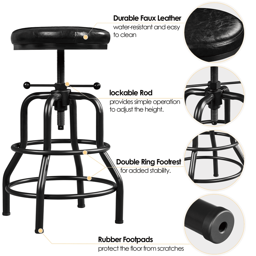 Need a rustic industrial bar stool for your kitchen island or dining room? This bar stool may be ideal for you. Crafted with water-proof faux leather and powder-coated metal, the stool is strong and long-lasting for kitchens, dining rooms, home bars, restaurants, etc. The soft foam-padded seat also brings you a comfortable seating experience. It weighs 13.2lb but can hold up to 300lb. The stool with an adjustable height ranging from 21.5-28″, serving you well from breakfasts to midnight drinks. The double-ring footrest not only provides an extra degree for holding your legs but also enhances stability and helps secure the stool legs. No installation is required!