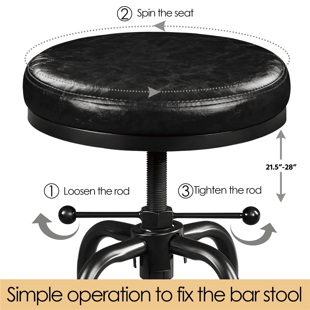 Smile Mart Vintage Faux Leather Counter-Height Bar Stool with Metal Legs for Kitchen Restaurant, Black Color: Black Material: PVC Leather, Metal, Foam, Composite Board Assembled Dimensions: 17.5″ × 21.5-28″ (Dia × H) Seat Size: 13.6″ × 2″ (Dia. × Thickness) Max. Weight Capacity: 300 lb Item Weight: 13.2 lb Shipping Weight: 16 lb Note: 1. Please allow a 1/2″ measurement tolerance. 2. For your safety, please do not stand on the stool. Soft Foam-padded Top Free & Easy Height Adjustment