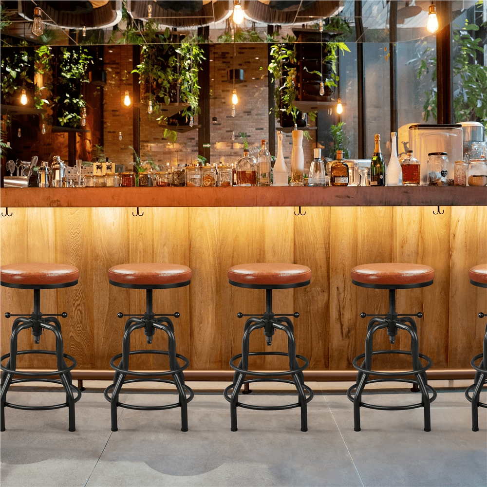 Need a rustic industrial bar stool for your kitchen island or dining room? This bar stool may be ideal for you. Crafted with water-proof faux leather and powder-coated metal, the stool is strong and long-lasting for kitchens, dining rooms, home bars, restaurants, etc. The soft foam-padded seat also brings you a comfortable seating experience. It weighs 6kg/13.4lb but can hold up to 136kg/300lb. The stool with an adjustable height ranging from 21.5-28″, serving you well from breakfasts to midnight drinks. The double-ring footrest not only provides an extra degree for holding your legs but also enhances stability and helps secure the stool legs. No installation is required!