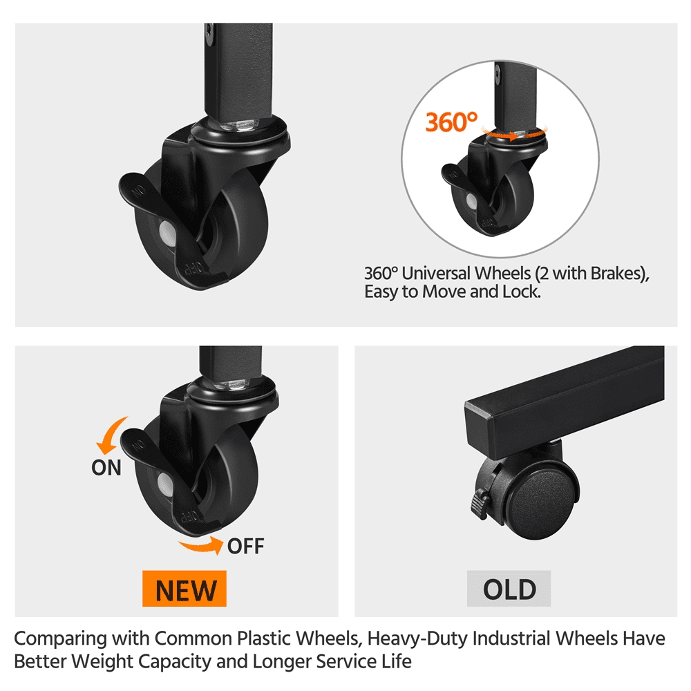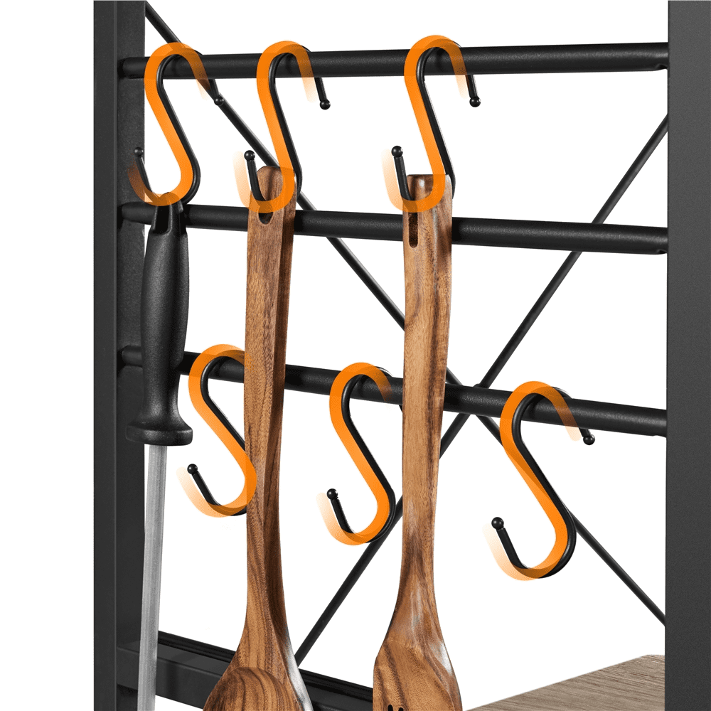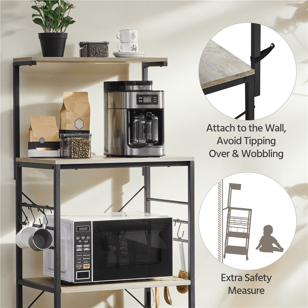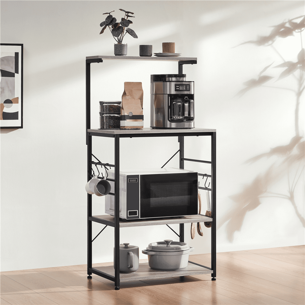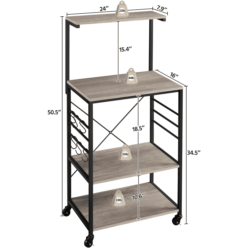 Still having trouble tidying up your messy kitchen and looking for a practical but stylish kitchen organizer to gather all of the kitchen utensils? Keep all your kitchen necessities close at hand while adding a touch of rustic but stylish appeal with this 4-tier microwave stand cart. The rolling 4 tires wooden rack is crafted of a sturdy metal frame and the shelves use premium thick particle board. This utility kitchen island offers four multi-sized shelves to organize your go-to kitchen needs like kitchenware or spice jars and some smaller appliances like microwaves, coffee makers. The classic gray color can coordinate with a variety of styles, especially rustic barn-style and industrial design, it will not only be a good helper but also be a unique décor in your kitchen.It’s a good choice to own this storage shelf unit in your kitchen. You can keep your spice jars and bottles on the top shelf, and fill up the rest three lower shelves with a microwave oven, pots and other appliances. Kitchenware like spoons, scoops, knives can be hung on the 6 S hooks.
