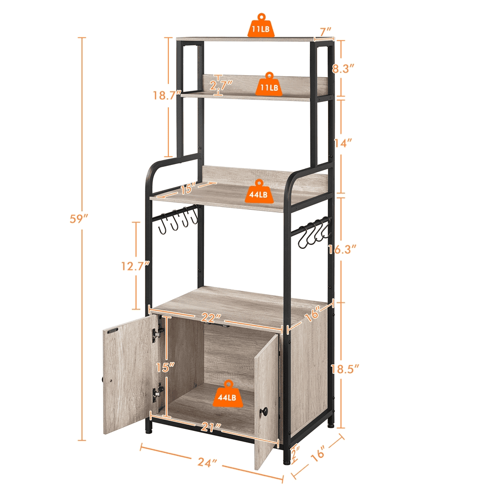 SmileMart Wooden Kitchen Baker’s Rack Utility Storage Shelf Unit Microwave Stand, Gray Color: gray Material: particle board, steel Overall dimension: 60cm L x 40cm W x 149cm H/24″ L x 16″ W x 59″ H Countertop: 56cm L x 38.4cm W/22″ L x 15″ W Shelf (top-down): 60cm L x 18cm W/24″ L x 7″ W, 56cm L x 16.4cm W/22″ L x 6.5″ W Bottom cabinet interior size: 53.5cm W x 40cm D x 37.5cm H/21″ W x 15.7″ D x 15″ H Maximum load capacity: shelf (ea.): 5kg/11lb; countertop & cabinet: 20kg/44lb Gross weight (product in the box): 20.1kg/44.4lb Note: 1. Please don’t stand on this item. 2. Please allow a ±1cm/0.5″ measurement tolerance.