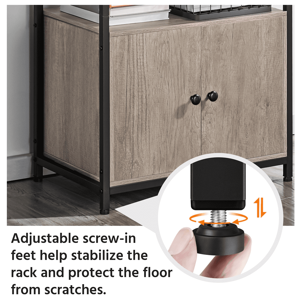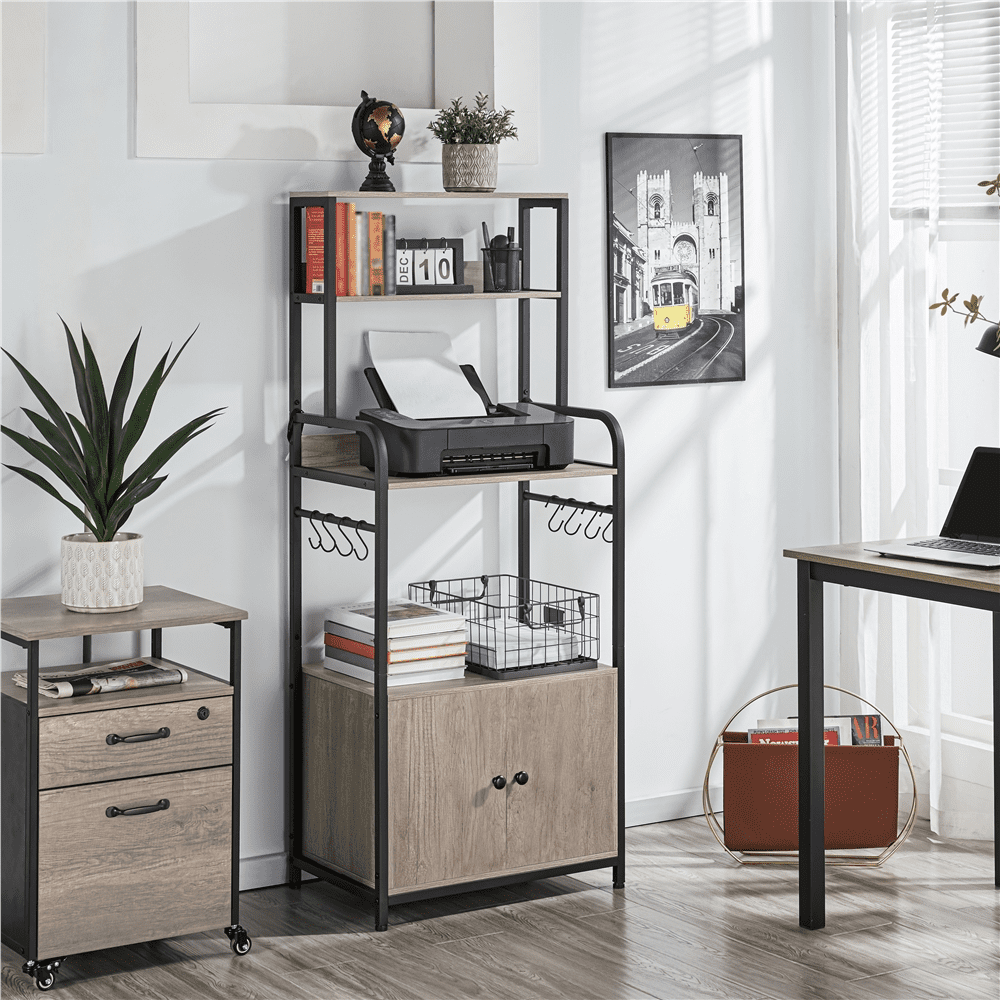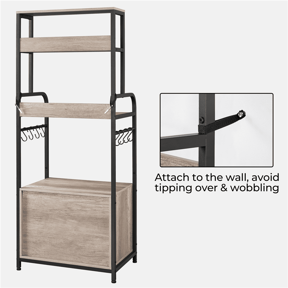 Declutter your kitchen or living room with this chic utility storage shelf with a cabinet. Founded atop four legs in a matte black finish, this piece features a quality iron frame, CARB P2 compliant manufactured wood, and water- and heat-resistant veneer that’s very easy to clean. Offering 3 multi-sized open shelves and a roomy storage compartment, you can put go-to kitchen needs and smaller appliances like microwaves, and coffee makers corralled and handy. Eight ball-end S-hooks keep potholders, mugs, and dishcloths dry and clean. The weather-worn look contrasts nicely against the black metal frame, which makes this baker’s rack a perfect addition to a variety of styles, especially rustic barn-style and industrial design.