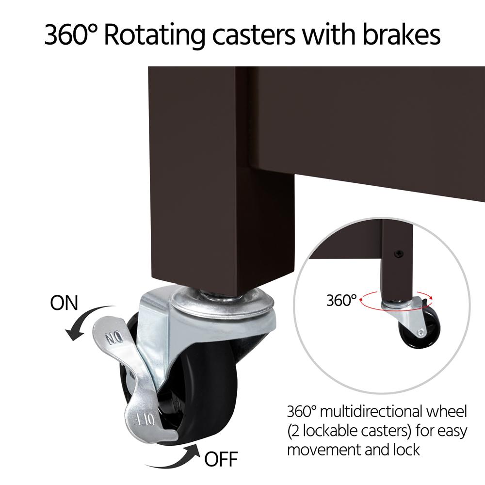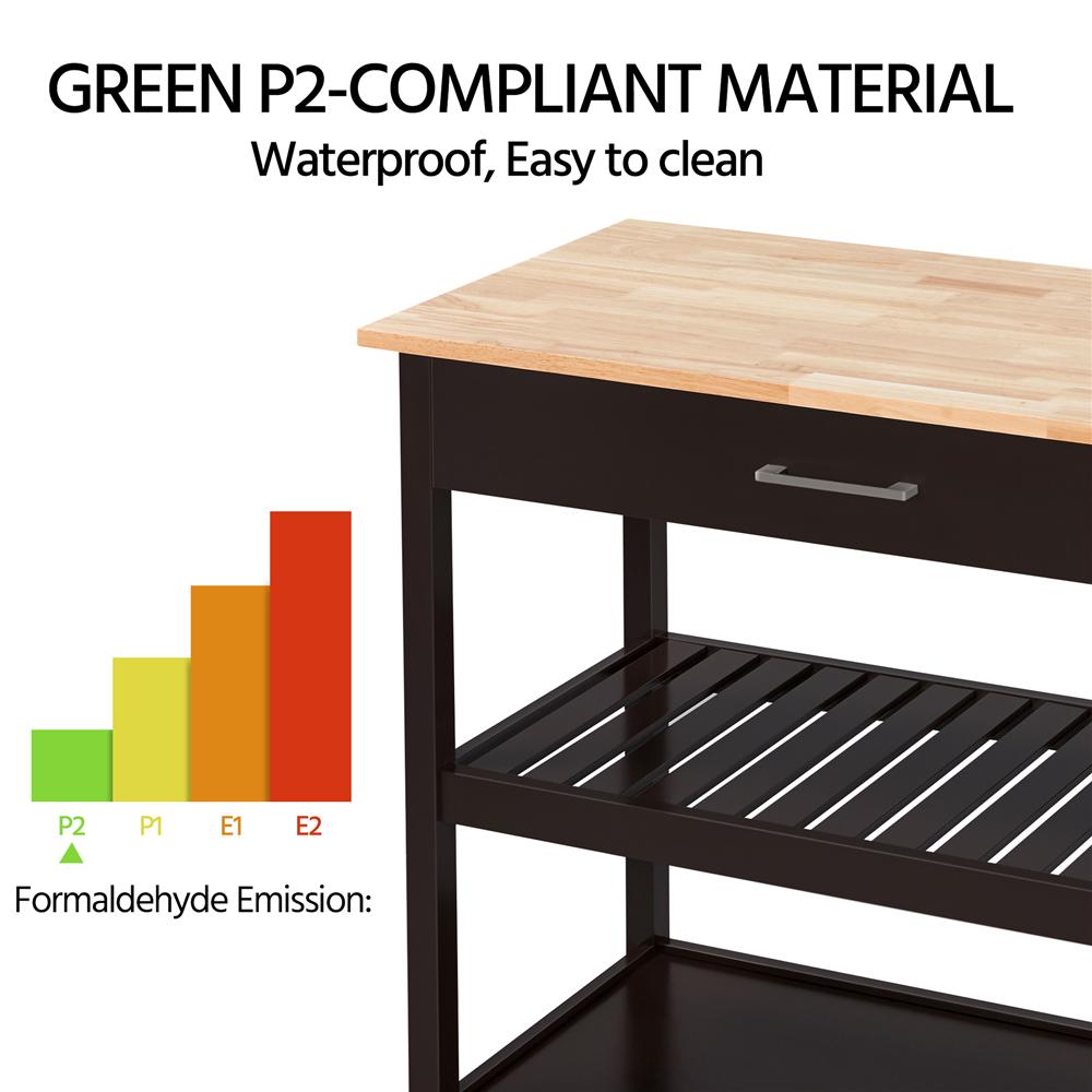 The 40 by 20 inch countertop of this kitchen cart provides plenty of space for you to prep and dine. The wide drawer allows kitchen essentials to be neatly organized and the bottom two shelves expand you kitchen storage space even further. The best feature of this kitchen island is the four industrial rolling casters. Combined with the easy-to-grip handle, you can roll this kitchen cart to where you need it. There are brakes on the wheels so you can lock the cart in place while in use. The high quality material will make this kitchen cart last a really long time. Finished with water-resistant paint, simply wipe down the surface with a damp cloth to clean. The minimalist and simple style seamlessly matches almost any home decor!
