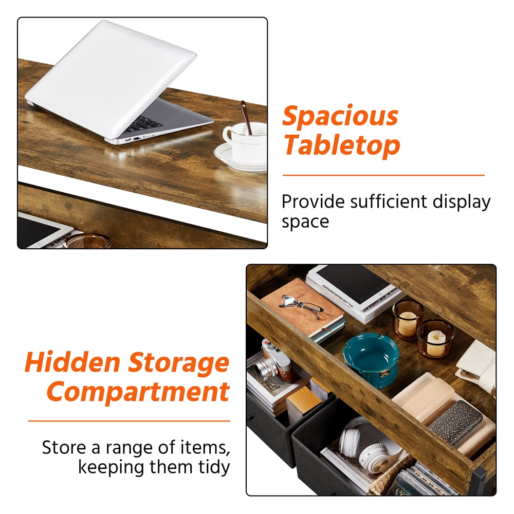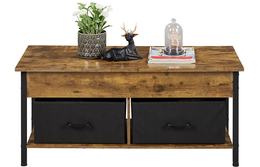 Alden Design Wooden Lift Top Coffee Table with Storage Baskets for Living Room, Rustic Brown: Color: Rustic Brown Material: MDF, steel, non-woven fabric Overall Dimension (with tabletop down): 41.5 x 20 x 18.5″ (L x W x H) Extended Dimension (with tabletop up): 41.5 x 20 x 24.5″ (L x W x H) Hidden Compartment Inner Size: 36.5 x 16 x 4″ (L x W x D) Fabric Storage Basket Inner Size (each): 16.5 x 14 x 8″ (L x W x D) Ground Clearance: 3.7″ Max. Weight capacity: tabletop: 198 lb; hidden storage: 66 lb; fabric storage basket (each): 22 lb N.W.: 42 lb G.W.: 46 lb Note: 1. Please allow ±1 cm / 0.5″ errors due to manual measurements. 2. For your safety, please do not stand on the tabletop. 3. Please be careful with your fingers when lifting/lowering the tabletop.
