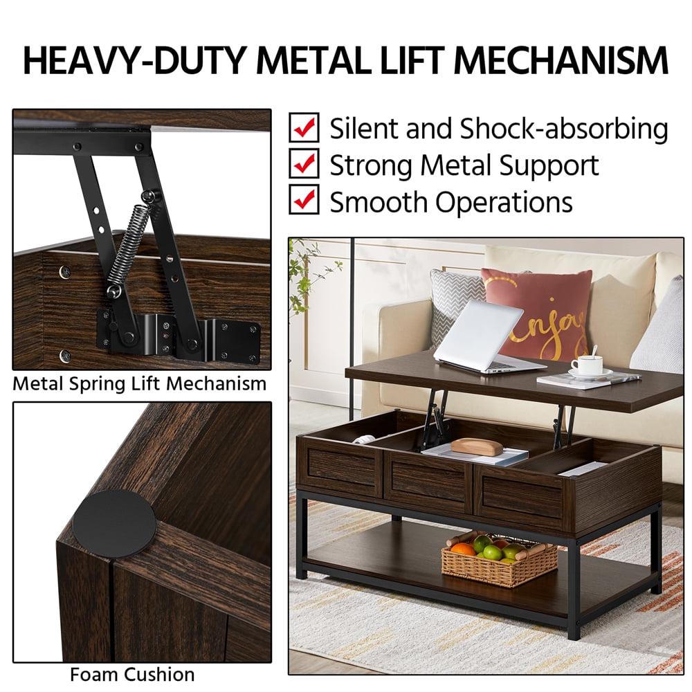 This lift-top wood and metal coffee table is the perfect anchor piece for any living room. It made of high quality wood and metal, guaranteeing that it will last a long time. The lift-top function is essential for long workdays on the couch or TV dinners. If you are looking to transform your space, this is the coffee table for you! The distressed coloring is sleek and elegant, blending in with any and all home decor styles. The shelving underneath and the room within the liftop space provides ample storage area. This is the perfect coffee table for your living room, bedroom, family room, etc.