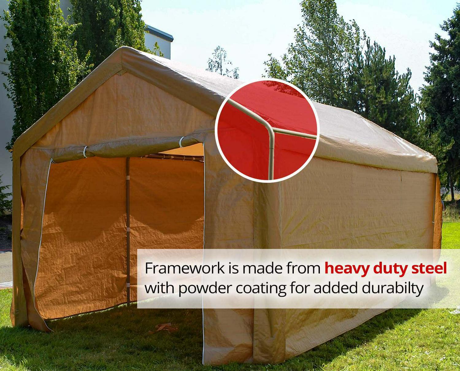This Heavy Duty outdoor tent is made to be able to withstand rain and sunshine. Simply set up and disassemble for an ideal outdoor storage tent. Perfect for recreational use or commercial use. Our outdoor gazebo top is made specially to protect your storage from sun rays and weather fluctuations. Measures at 10 x 20 feet when set up, offering plenty of room for your storage like boats, cars, BBQ grills or anything you need to keep safe from rain/sunshine. Our product comes with sidewalls for all around protection.