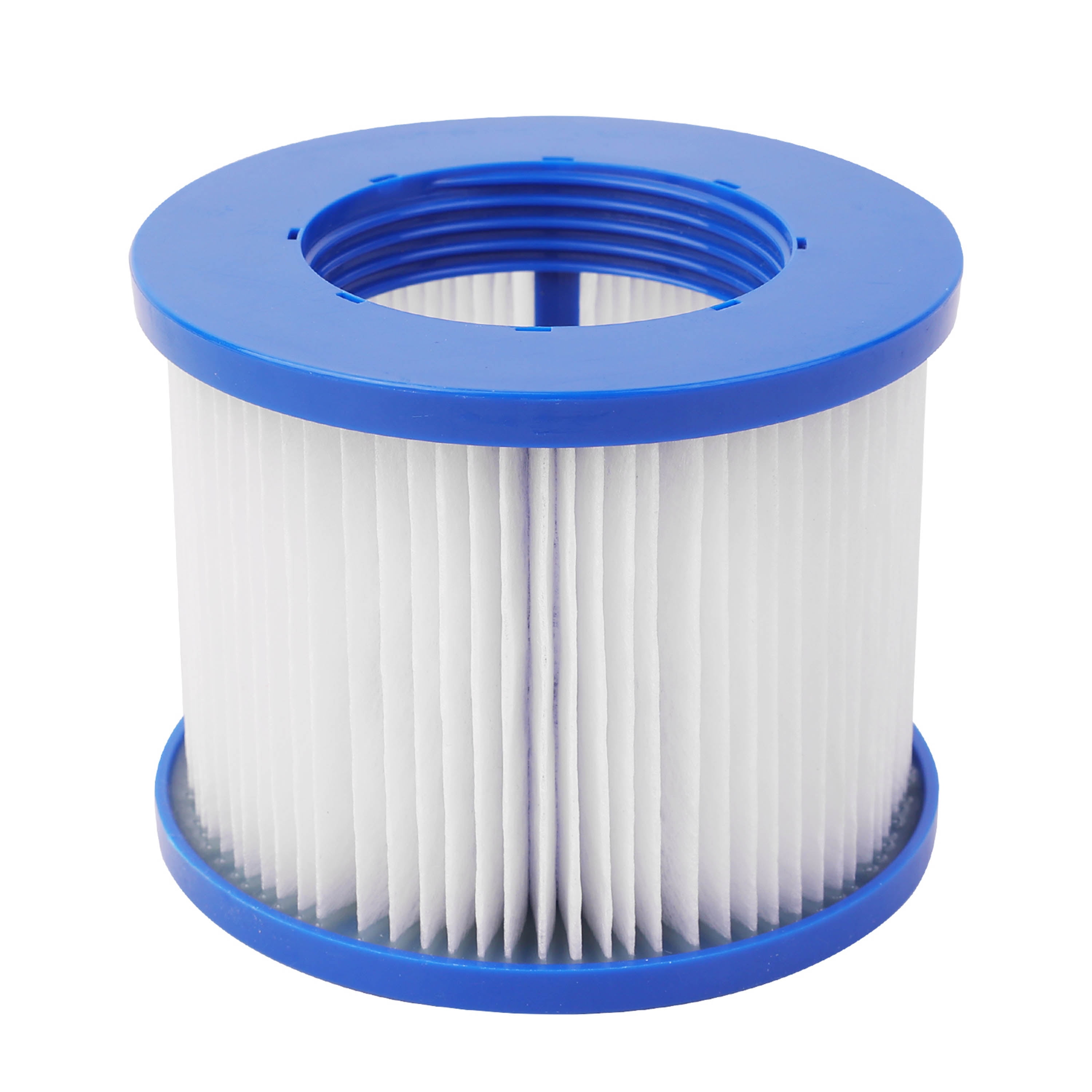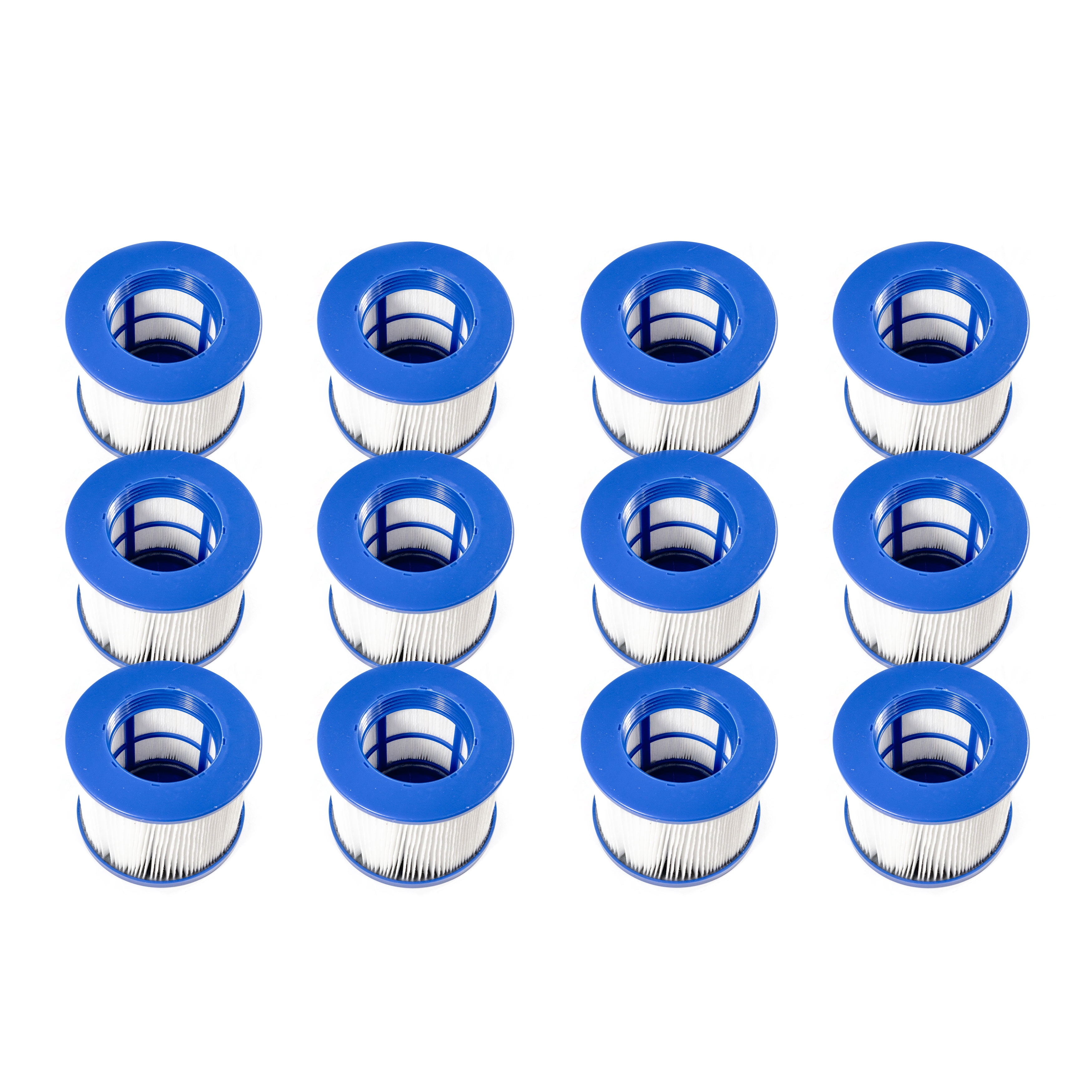 This water filter cartridge keeps spa water clean and heightens your inflatable hot tub performance; hot tub sold separately Traps additional dirt and particles within its filter paper Lot of 12 Hot Tub Filters Easy to replace; changing the filter once per month is recommended Clean the filter every 120 hours with an overnight soak Material: Paper and plastic Dimensions: 4 x 4 x 4 inches Color: Blue