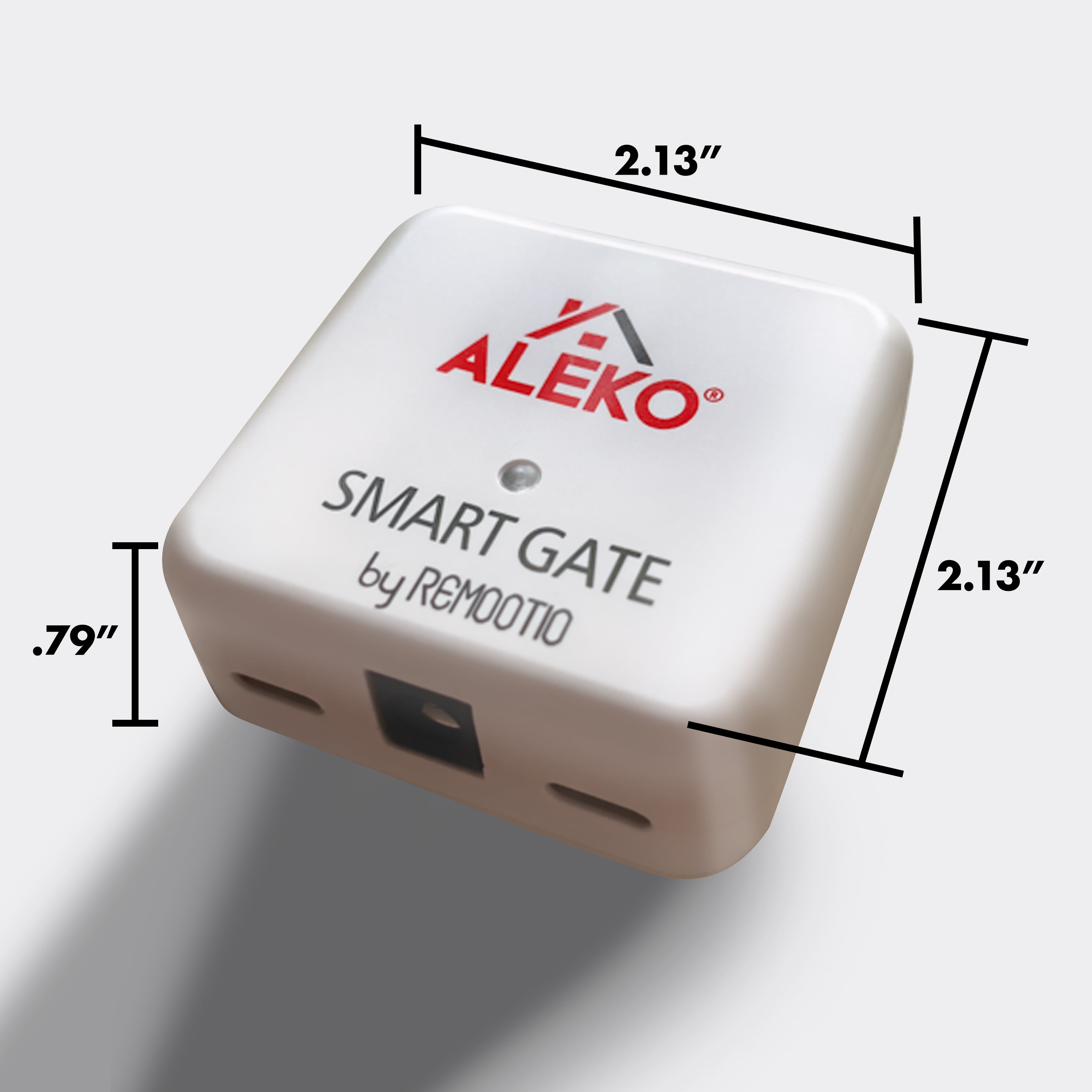 Smartphone app lets you open/close your garage door and gate using Wi-Fi, Bluetooth, or internet Bluetooth operates gate and garage when Wi-Fi is not available Internet connection mode allows you to access your gate and garage from anywhere in the world Smart gate and garage door opener can be integrated with smart home systems including Amazon Alexa, Google Home Assistant, and Samsung SmartThings Control gate and garage with iOS and Android Smartphones, Apple Watch, or Open API App offers 20 virtual keys; keys can be easily shared via QR code or text message Unit can be powered directly from gate opener or with included USB charger Device is easy to install and only requires a crosshead screwdriver and smartphone 256-bit authenticated end-to-end encryption provides security for peace of mind App allows you to check gate or garage door status any time to ensure your home is secure App allows you to set up automations to open close your gate at the same time every day Access right management allows you to provide or remove access rights easily from the app Technical Specs: Dimensions: 2.13L x 2.13W x 0.79H in. Voltage Range: 5-32VDC & 12-24VAC Smart Home Integrations: Amazon Alexa; Google Assistant; Samsung SmartThings Control Devices: iOS and Android Smartphones; Apple Watch; Open API Connection Method: Bluetooth; Wi-Fi; Internet Compatible With Most Gates, Garage Doors, and Electric Strikes; ALEKO Sliding Swing Gate Openers