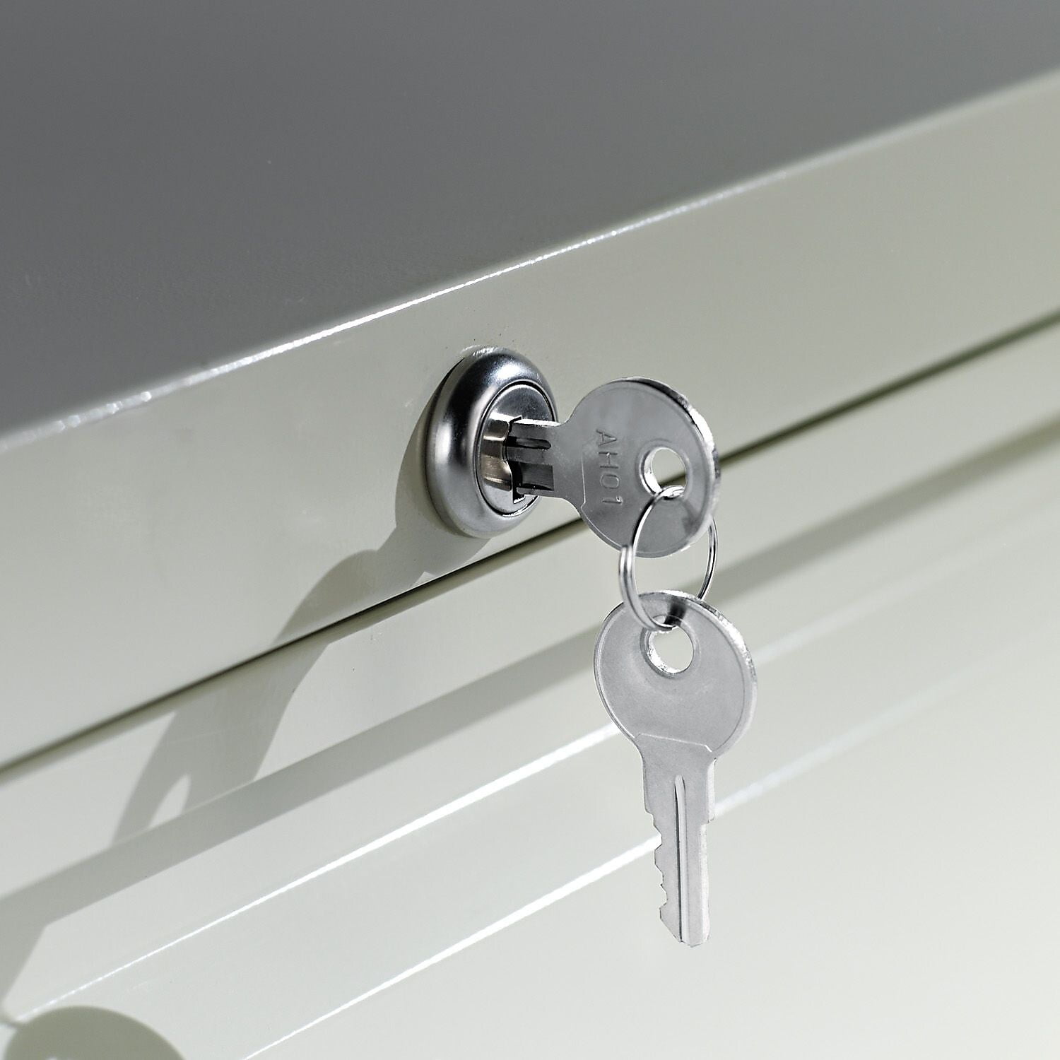 Sold as 1 Each. Drawers with side-to-side hang rails to accommodate letter/legal hanging files. Single key core removable lock with two keys. Anti-tipping interlock system allows only one drawer to open at a time, single key core removable lock with two keys. Full drawer extension on steel ball bearing telescoping slide suspension. Four adjustable leveling glides. Durable powder-coated finish helps prevent scratches. Stylish full-width radius edge recessed pulls. Durable powder coated finish helps prevent scratches. Anti-tipping interlock system allows only one drawer to open at a time. Caster/glide/wheel type: Adjustable leveling glides.