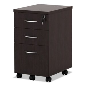 Alera mobile file cabinet is ready to go anywhere you need it to go. Full-extension ball bearing slides on file drawer for easy access to files. The drawers lock for securing contents. Durable 3 mm edge banding protects against bumps and dings. Five casters, two locking. Center caster prevents tipping. Fully assembled, just attach casters. Two, fold-away keys which provide a slimmer profile are included. Drawer Quantity: 3; Drawer Configuration: Box/Box/File; Anti-Tip Mechanism Indicator: Yes; Anti-Tip Mechanism: Fifth Wheel.