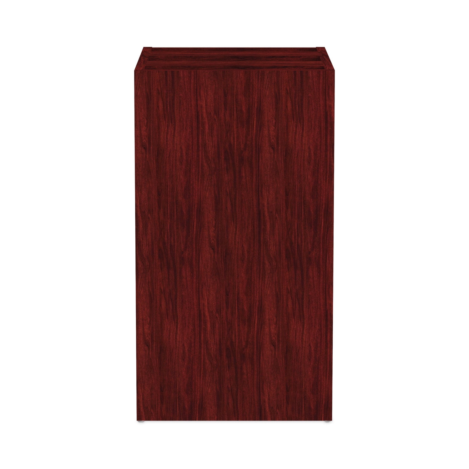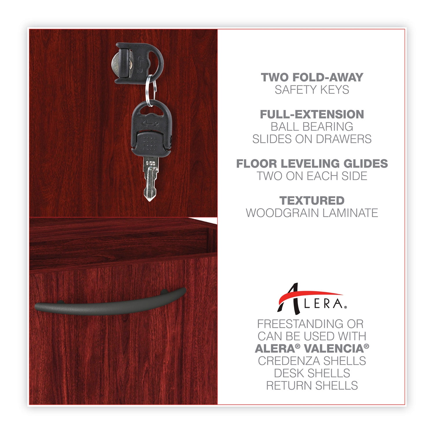 Alera freestanding pedestal file cabinet that attaches under worksurface. Sturdy, four-sided drawer construction with separate front panel. Full-extension ball bearing slides on file drawer. Drawers lock for securing contents. Durable 3 mm edge banding protects against bumps and dings. Two, fold-away safety keys for a slimmer profile are included. Drawer Quantity: 3; Drawer Configuration: Box/Box/File; Anti-Tip Mechanism Indicator: No; Color: Mahogany.