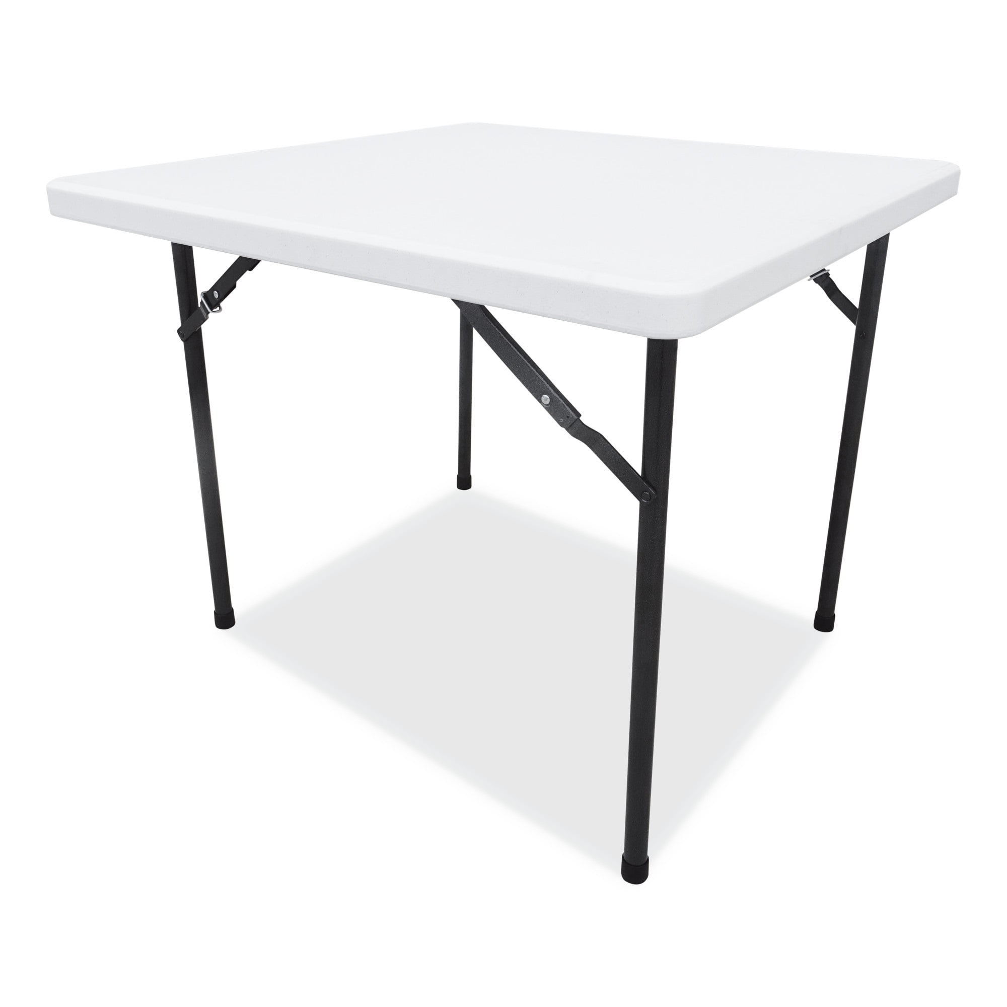Alera’s versatile folding table is perfect for indoors or outdoors. Convenient square, folding table sets up quickly when you need an extra table and space is limited. Blow-molded polyethylene top is water and stain resistant to ensure it won’t crack or stain. Strong, durable, powder-coated metal construction withstands dents and scratches. Slide lock feature enhances table stability once opened. Legs fold flush into table creating a flat surface for easy storage and stacking. Non-marring foot caps prevent floor damage. The table supports up to 600 lbs. of evenly distributed weight.