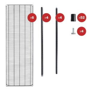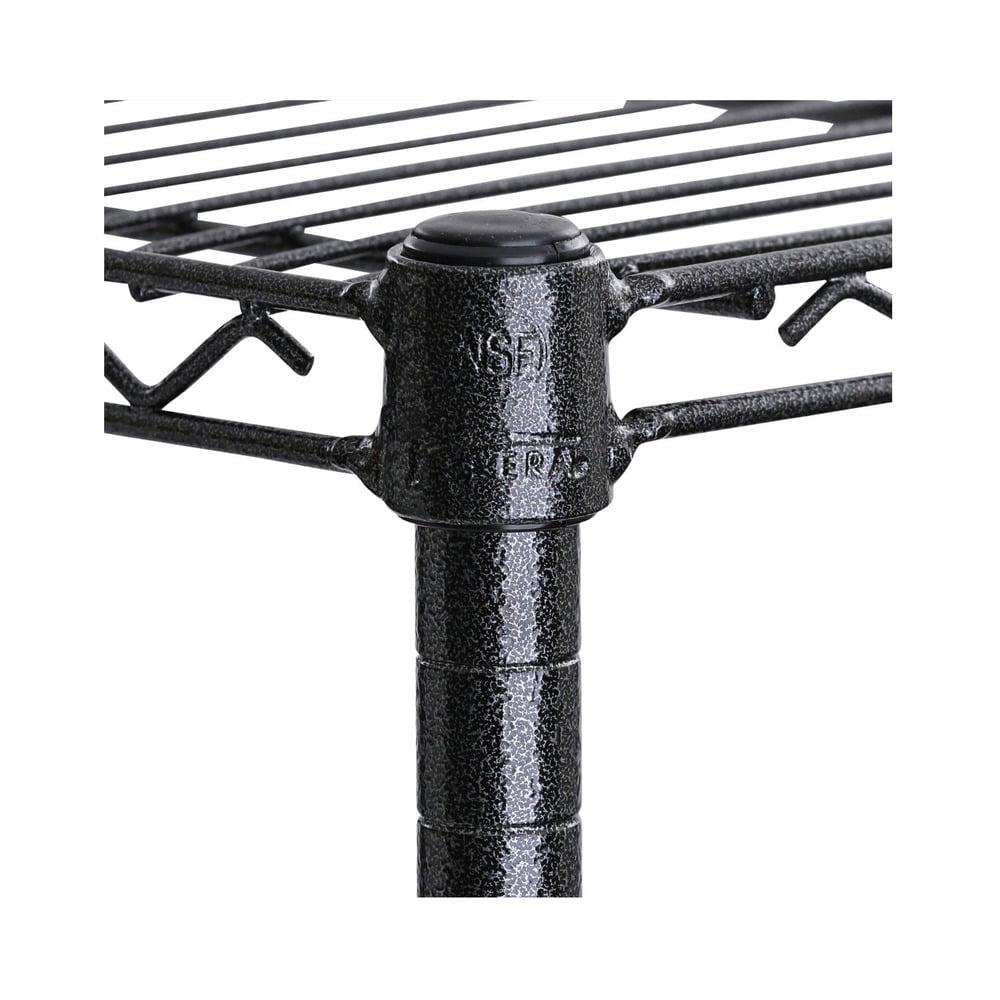 Ideal storage solution for commercial use. Snap-together design assembles in minutes. Strong welded wire construction provides exceptional strength and stability. Open design allows air circulation and reduces dust build-up. Includes six shelves, posts, shelf clips and leveling glides. Up to 600 lbs. per shelf (evenly distributed) when used without casters. Casters (2 locking) provide mobility and can be omitted to increase weight capacity of unit. Up to 600 lbs. per shelf (evenly distributed). Color: Black Anthracite; Overall Width: 48″; Overall Depth: 18″; Overall Height: 72″.