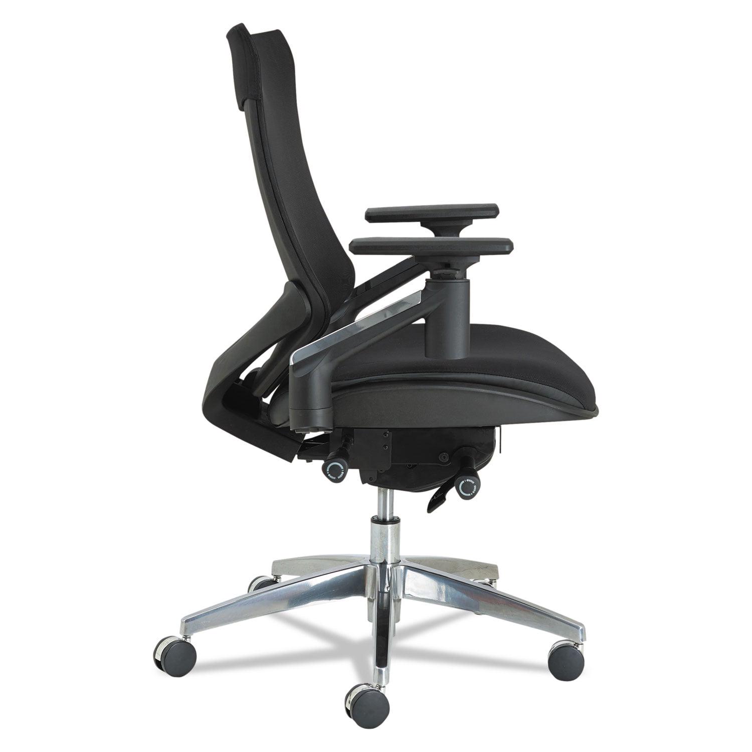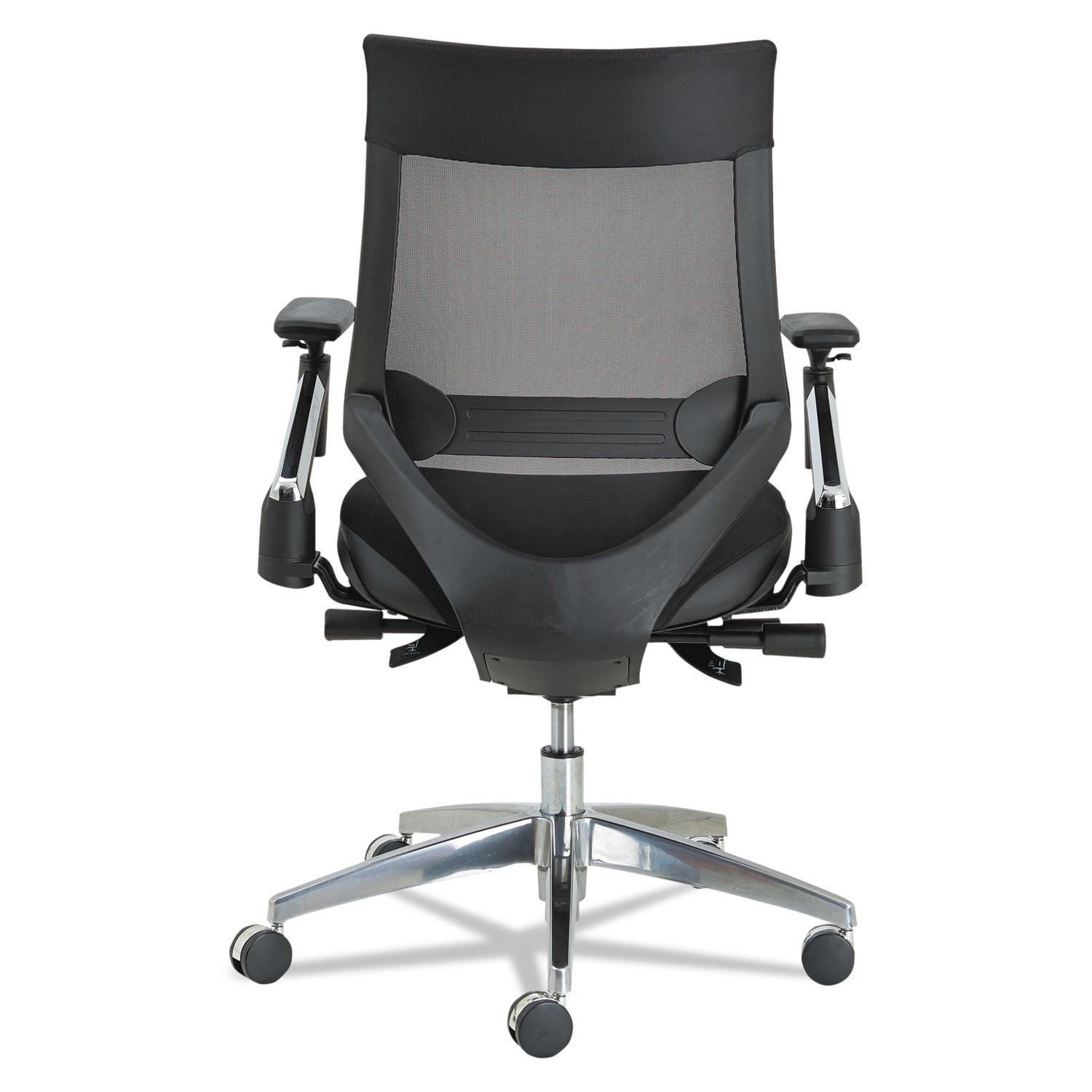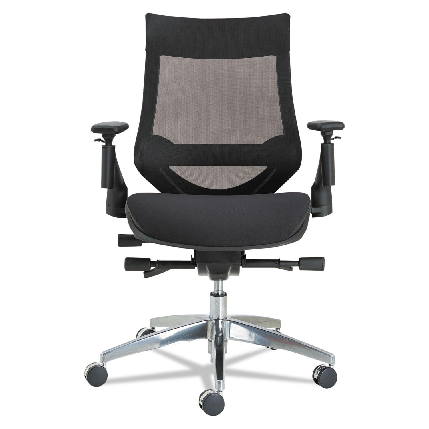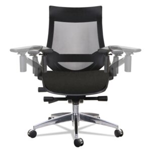 Advanced ergonomics combined with intelligent Alera design fits most any user. Pivoting swing arms adjust inward when leaning forward for close-in tasks or swing out to accommodate the wingspan. Arms also adjust up or down and front and back. Synchro-tilt and seat incline controls adjust seat to back ratio for the most optimal ergonomic seating position. Advanced micro-mesh back fabric is both comfortable and cooling with durable molded foam fabric seat for the perfect sit. Waterfall seat edge helps prevents pressure points at the back of the legs. Luxurious aluminum base and chrome accents. Integrated lumbar support for ideal back posture. Arm Adjustability: Height; Horizontal Angle; Arm Height From Seat: 8.25″; Arm Type: Padded T-Bar; Armrest Color: Black; Armrest Material: Chrome; Polyurethane; Arms Included: Yes; Asynchronous Control: No; Back Color: Black; Back Height Adjustment: No; Back Height Maximum: 22.24″; Back Surface Material: Mesh; Back Surface Material Family: Mesh; Back Width Maximum: 19.29″; Back Width Minimum: 18.89″; Base/Frame Color: Aluminum; Base/Frame Material(s): Aluminum; Caster/Glide Details: Five 2″ Dual-Wheel Casters; Caster/Glide Surface Texture: Hard; Color Family: Black; Compatible Flooring Type(s): High-Pile Carpet; Low-Pile Carpet; Distance Between Arms: 19.29″; Dual-Action Tilt: No; Dual-Clutch Posture Control: No; Integral Lumbar Support: Yes; Knee Tilt: No; Multi-Task Control: No; Overall Depth Maximum: 28.34″; Overall Height Maximum: 42.51″; Overall Height Minimum: 38.58″; Overall Width Maximum: 28.14″; Pneumatic Seat Height Adjustment: Yes; Posture Lock: No; Recommended Application Area(s): Conference & Meeting; Executive & Management; General Office & Task; Seat Color: Black; Seat Depth Maximum: 19.68″; Seat Depth Minimum: 18.11″; Seat Glide Mechanism: Yes; Seat Height Maximum: 22.32″; Seat Height Minimum: 18.62″; Seat Surface Material: Fabric; Seat Surface Material Family: Fabric; Seat Width Maximum: 19.88″; Synchronized Knee Tilt: No; Tilt Tension/Tilt Lock: Yes; Variable Synchro-Tilt: Yes; Weight Capacity: Supports Up to 275 lb Compliance Standards: CAL TB117-2013 Compliant; Meets or Exceeds ANSI/BIFMA Standards. Warranty: Manufacturer’s limited five-year warranty. Post-Consumer Recycled Content Percent: 5%. Pre-Consumer Recycled Content Percent: 25%. Recycled Comments: Contains 5% post-consumer recycled content, 30% total recycled content.