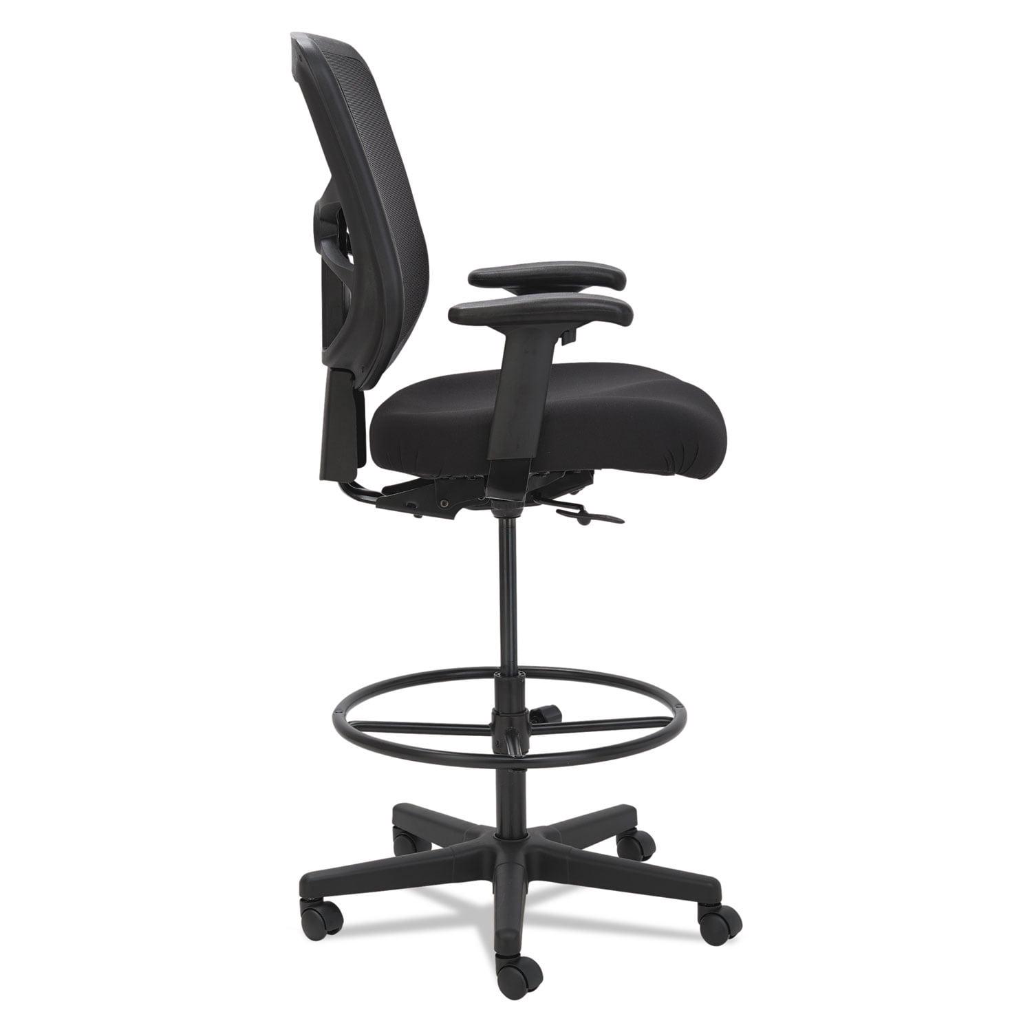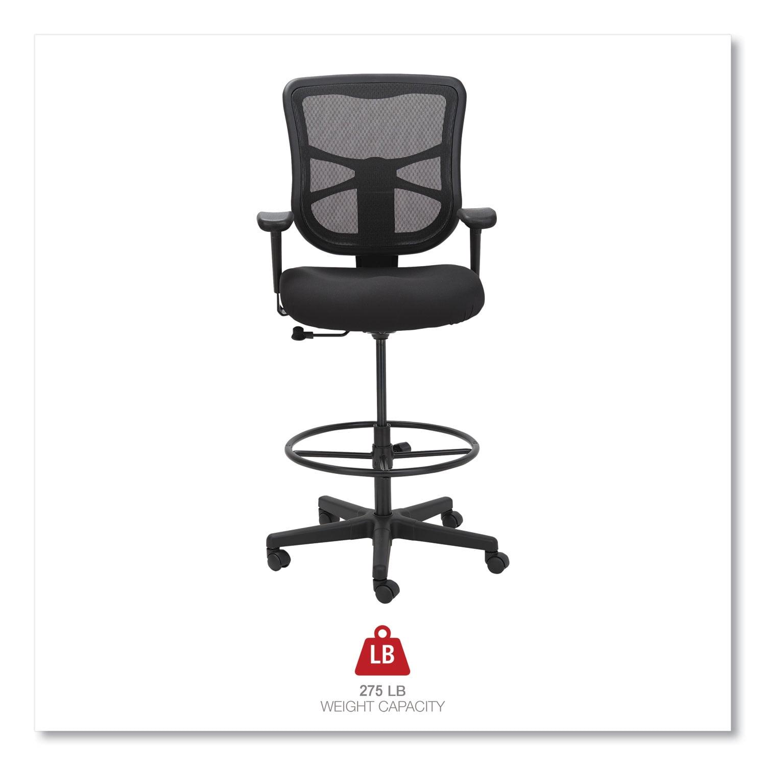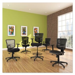 The Alera ergonomically designed stool adjusts to fit multiple users. Cool, breathable mesh back. Contoured seat cushion with waterfall edge to help relieve pressure on knees. Adjustable foot ring for leg support. Weighted steel reinforced five-star base with casters and also compatible with glides, which are sold separately. Height adjustable ratchet back for optimal lumbar support. Height- and width-adjustable arms with soft pads. Arm Adjustability: Height; Width; Arm Height From Seat: 6.75″ to 9.25″; Arm Type: Padded T-Bar; Armrest Color: Black; Armrest Material: Polypropylene, Polyurethane; Arms Included: Yes; Asynchronous Control: No; Back Color: Black; Back Height Adjustment: Yes; Back Height Maximum: 24.4″; Back Height Minimum: 22.3″; Back Surface Material: Mesh; Back Surface Material Family: Mesh; Back Width Maximum: 15.04″; Base/Frame Color: Black; Base/Frame Material(s): Nylon; Caster/Glide Details: Five 2″ Hooded Dual-Wheel Casters; Caster/Glide Surface Texture: Hard; Color Family: Black; Distance Between Arms: 16.2″ to 17.9″; Dual-Action Tilt: No; Dual-Clutch Posture Control: No; Integral Lumbar Support: No; Knee Tilt: No; Multi-Task Control: No; Overall Depth Maximum: 27.9″; Overall Height Maximum: 54.4″; Overall Height Minimum: 42.5″; Overall Width Maximum: 27.72″; Pneumatic Seat Height Adjustment: Yes; Posture Lock: No; Recommended Application Area(s): Assembly/Repair & Technical Task; General Office & Task; Seat Color: Black; Seat Depth Maximum: 19.3″; Seat Glide Mechanism: No; Seat Height Maximum: 31.6″; Seat Height Minimum: 22.6″; Seat Surface Material: Fabric; Seat Surface Material Family: Fabric; Seat Width Maximum: 19.7″; Synchronized Knee Tilt: No; Tilt Tension/Tilt Lock: No; Variable Synchro-Tilt: No; Weight Capacity: Supports Up to 275 lb Compliance Standards: Meets or Exceeds ANSI/BIFMA Standards. Warranty: Manufacturer’s limited five-year warranty. Post-Consumer Recycled Content Percent: 5%. Pre-Consumer Recycled Content Percent: 10%. Recycled Comments: Contains 5% post-consumer recycled content, 15% total recycled content.