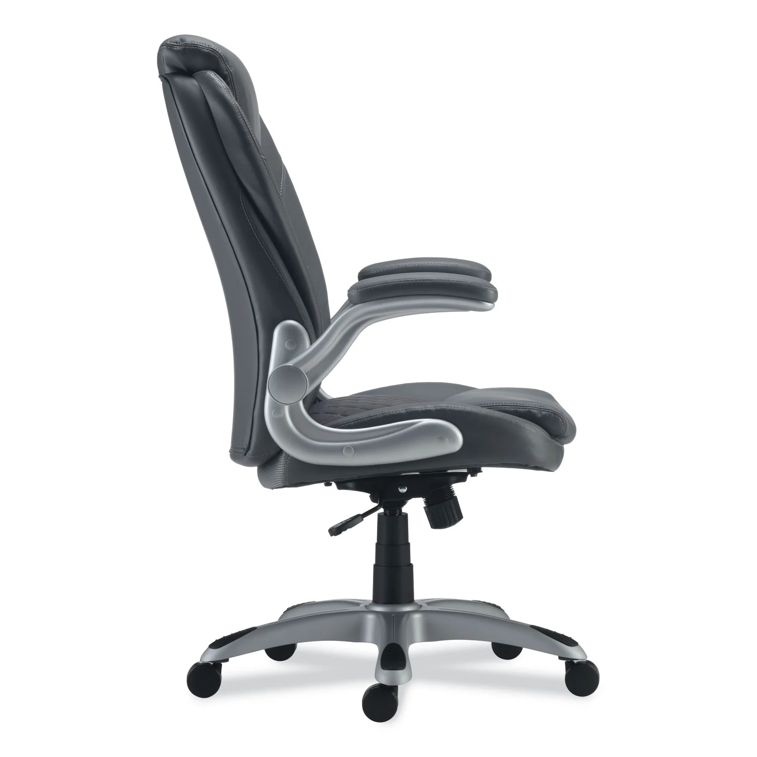 Alera Leithen Bonded Leather Midback Chair, Supports Up to 275 lb, Gray Seat/Back, Silver Base Settle into this Leithen bonded leather and quilted fabric midback chair for added comfort throughout the workday. Designed for luxurious comfort, it supports your head, neck, back, and shoulders with height-adjustable, padded arms and built-in recliner. Further customize your working position with adjustable seat height and locking tilt tension. Mobile design features a stable, five-star base with rolling casters which work on carpet or hard floors. Supports up to 275 lbs. Assembly required. Smooth, bonded leather and quilted fabric task chair. Ergonomic chair with seat height and tilt adjustment. Built-in reclining mechanism for position adjustment. Flip-up, height-adjustable, padded arms for comfort and support. Supports up to 275 lbs. Assembly required.