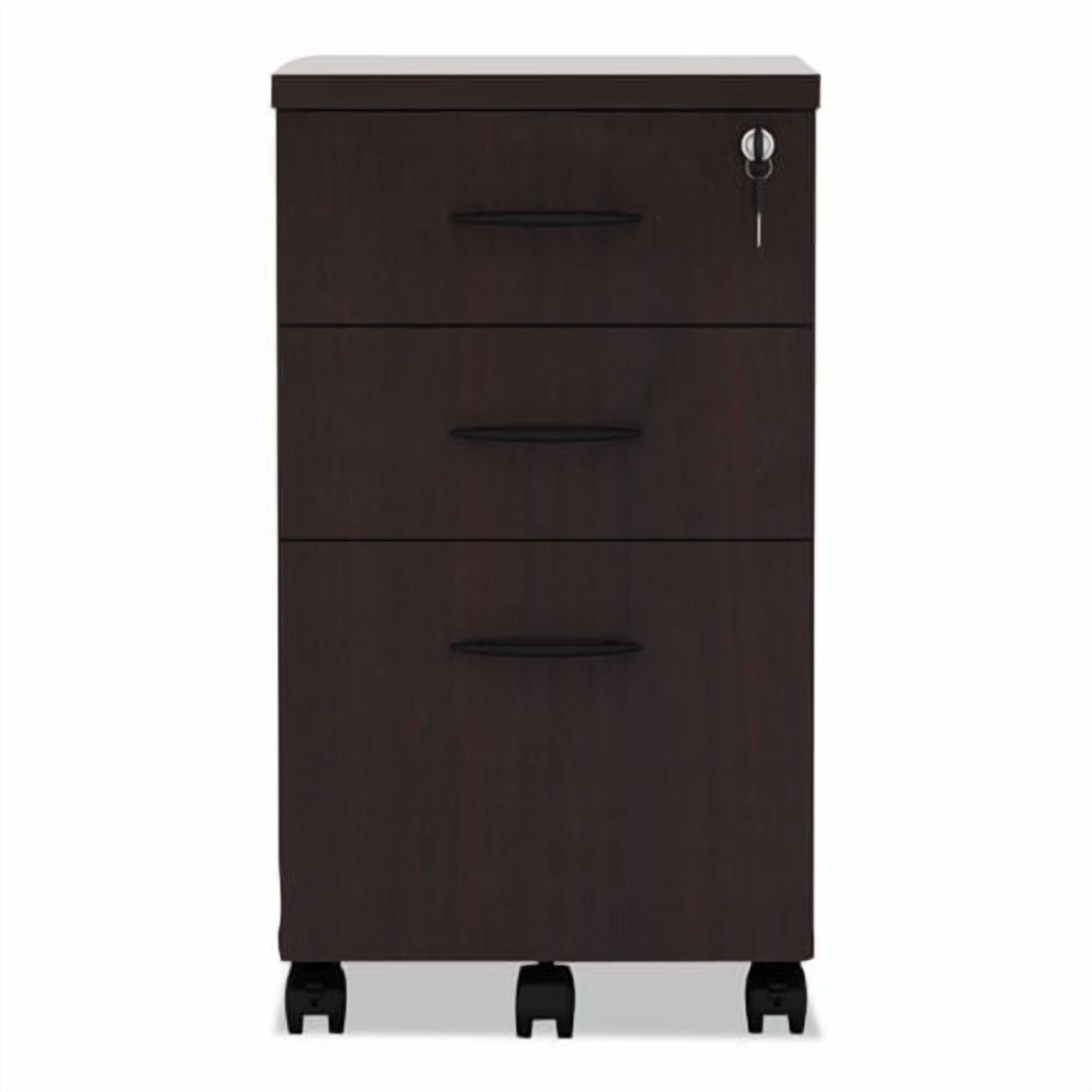 Mobile to go anywhere you need it to go. Full-extension ball bearing slides on file drawer for easy access. Drawers lock for securing contents. Durable 3 mm edge banding protect against bumps and dings. Five casters, two locking. Center caster prevents tipping. Fully assembled, just attach casters. Keys (included) fold-away 90? for slimmer profile. Color: Mahogany; Overall Width: 15 7/8″; Overall Depth: 20 1/2″; Overall Height: 28 3/8″.
