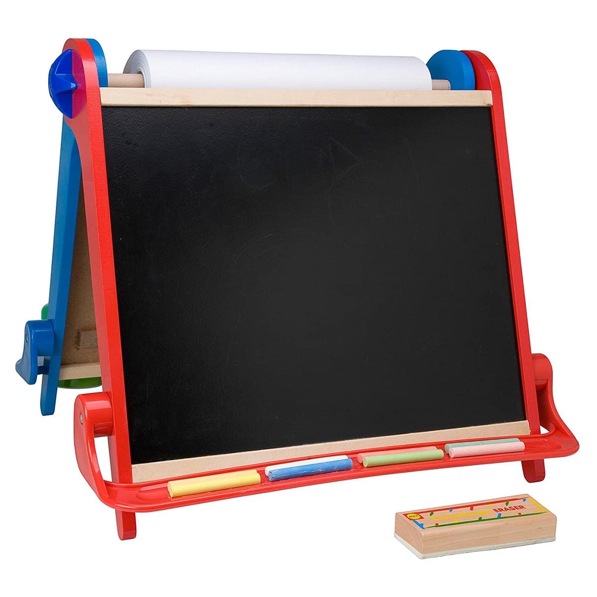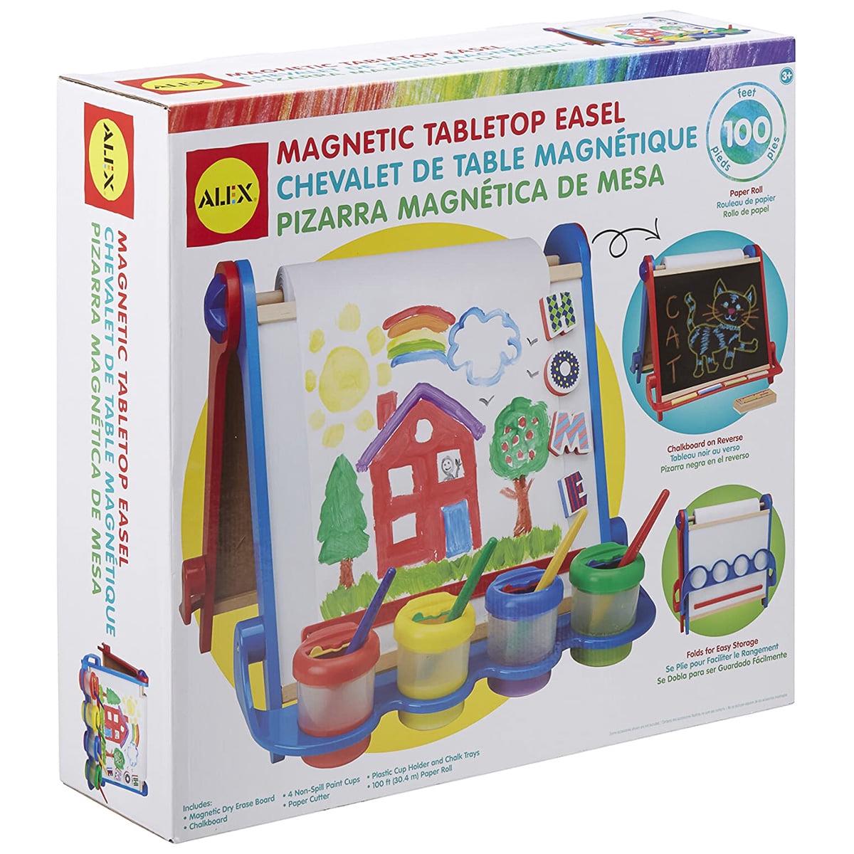 The ALEX Art Magnetic Tabletop Easel will have your pint-sized Picasso creating masterpieces in no time! This easel features a chalkboard on one side and a magnetic dry-erase board on the other so children can draw and erase whatever their imagination creates. The easel is made of medium density fiberboard and comes fully assembled with sides that fold up for easy storage. This model won the Oppenheim Toy Portfolio Gold Seal Award and is recognized as a top toy by parents and industry leaders. Includes 13.5in. tall x 17in. wide chalk and magnetic dry erase boards, 12in. x 100ft. roll of paper, 4 paint cups, paper cutter, cup and chalk holder. Recommended for children 3 years of age and older.
