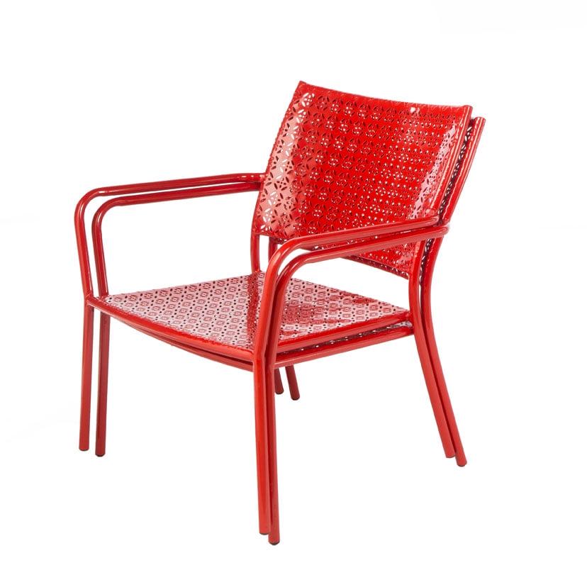 Durable wrought iron frame. Baked on powder coated finish. Generously sized for comfort. Chairs stack for convenient storage. Great for indoor or outdoor use. Stackable. Wipe clean with water and mild dish soap, do not use harsh chemicals. For prolonged life, cover and protect frames when not in use.