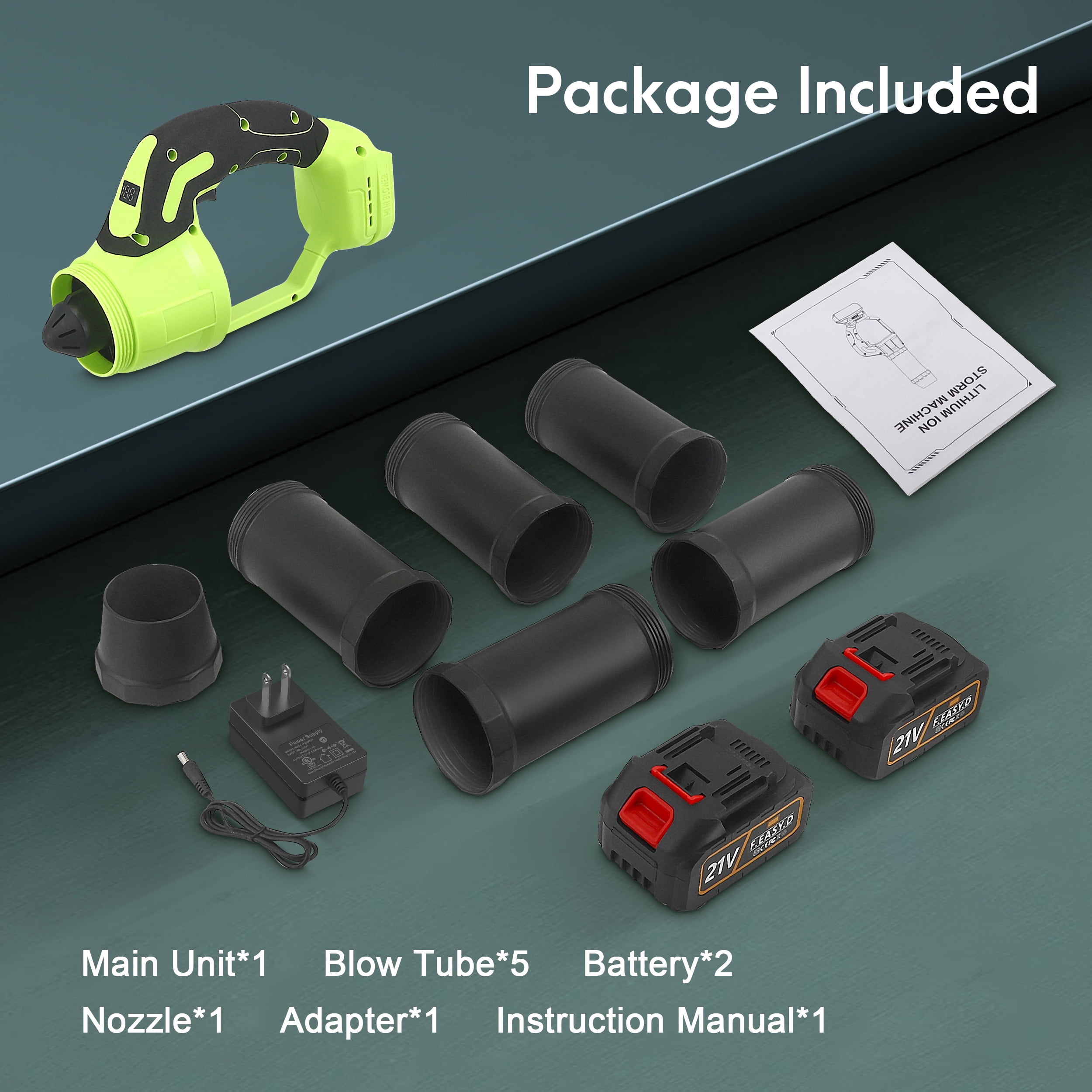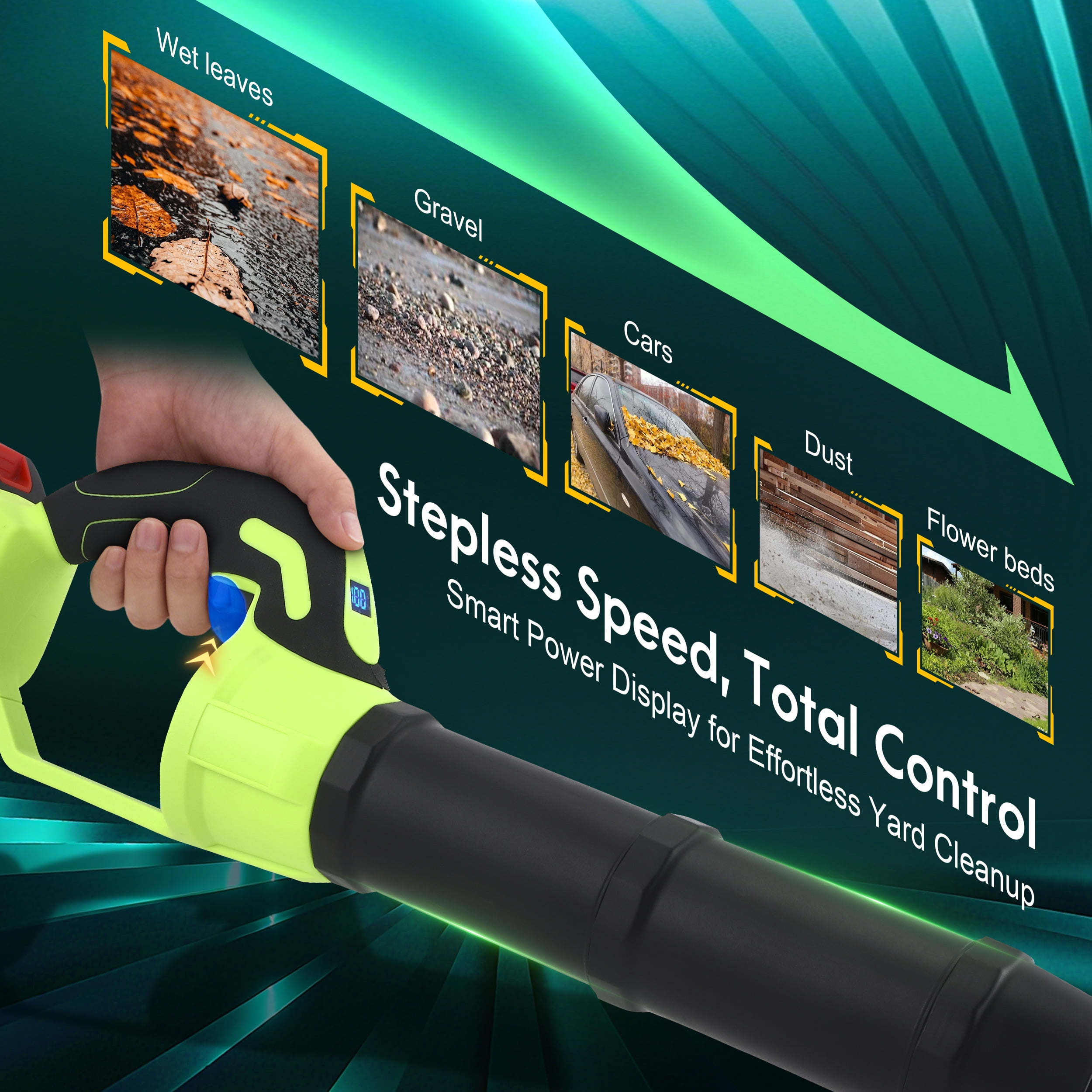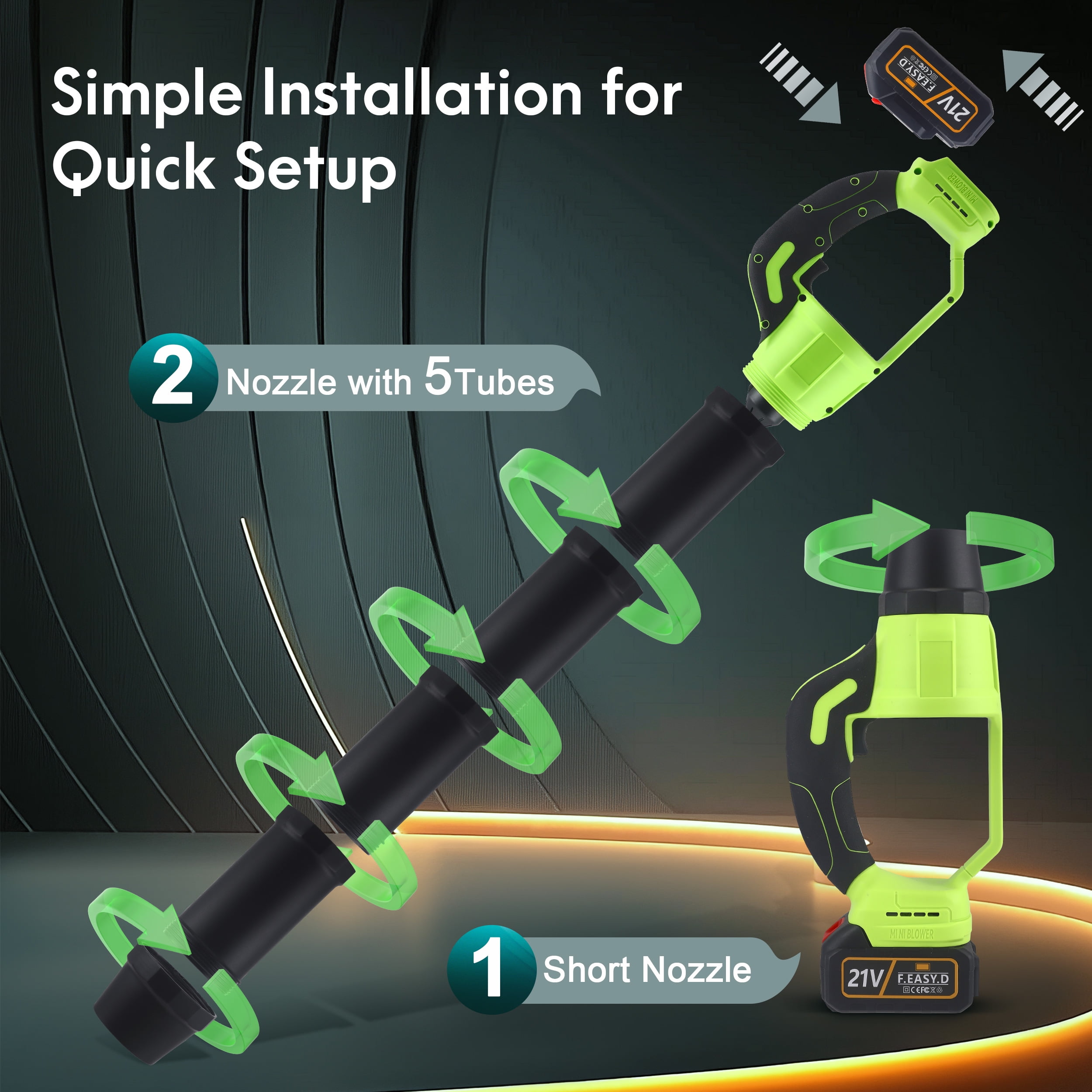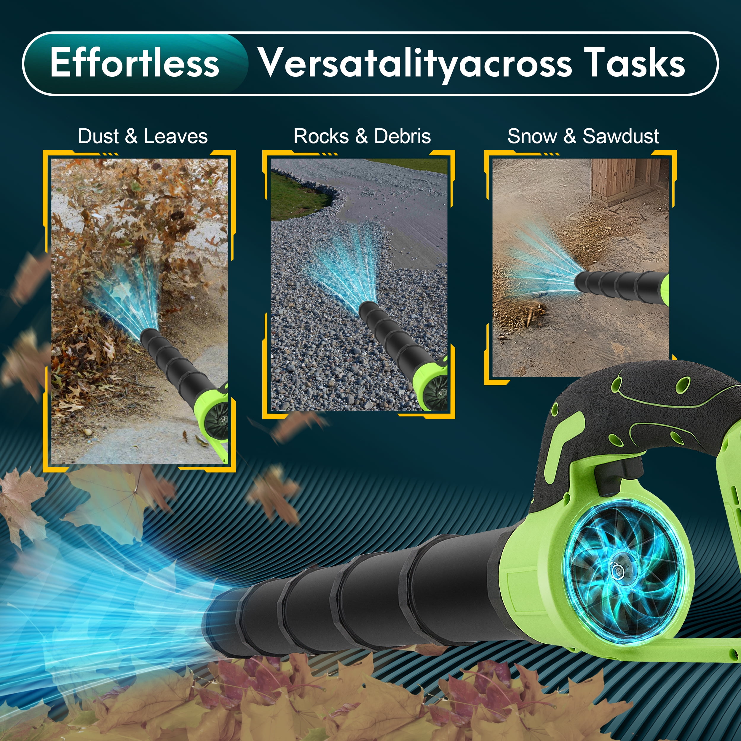 ALILYY 21V Cordless Leaf Blower with 2 X 2.0Ah Battery 230MPH 375CFM 3 Speed Mode Leaf Blower Cordless with 4 Blowing Nozzles for Lawn Care,Yard,Snow Blowing,Dust,Sawdust ALILYY powerful cordless leaf blower, New upgrade in 2024, designed to serve customers! This lightweight electric blower comes with a battery and charger, featuring a 2-in-1 inflating nozzle and three specialized blowing nozzles for maximum efficiency. With three speed settings reaching up to 230MPH and 375CFM, it effortlessly tackles leaves, light snow, and dust both indoors and outdoors. Enjoy up to 50 minutes of runtime with two 2000mAh rechargeable batteries, and navigate tight spaces with ease thanks to its 270° rotatable design. Experience a cleaner yard and home with this user-friendly, one-hand operation blower! ▶ KEY FEATURES: 【Powerful Pure Copper Motor】 Powered by an upgraded efficient pure copper motor, our leaf blower provides excellent blowing performance. With 3 adjustable speeds, it delivers up to 17000RPM high speed, 230MPH air speed and 375CFM air volume. It effectively helps to get your work done quickly with less effort. 【4 Replaceable Nozzles & Versatile Uses】 ALILYY leaf blower cordless comes with a round nozzle, flat nozzle and bend nozzle for different blowing needs and a pointed nozzle for inflating needs. It is ideal for gathering grass clippings or fallen leaves into piles, clearing dust from driveways, sidewalks, parks, patios or parking lots, removing debris from corners or joints in the house, cleaning leaves, snow or dust from vehicles, as well as inflating air beds and swim rings. 【270° Rotatable Blower】 ALILYY cordless leaf blower features an innovative rotatable blower, providing a perfect solution for corners and narrow gaps that are difficult to deal with without twisting your hands. With a comfortable and non-slip TPE handle, the leaf blower allows for one-handed operation. It achieves all-round cleaning and makes your work easier. 【50 Minutes of Runtime】 Say goodbye to traditional cord limitations. The electric leaf blower is equipped with two 21V 2A rechargeable lithium batteries which provide up to 50 minutes of runtime at low speed, 36 minutes at medium speed and 20 minutes at high speed. It includes a battery charger with a power indicator light. 【Lightweight & Compact】 ALILYY leaf blower cordless with battery and charger only takes 5 seconds to assemble. Freely assemble it to your desired length, with or without the blower tube. Weighing only 3 lbs, our battery leaf blower is light enough to be used by women and even the elderly. Its detachable design makes it easy to store and transport.