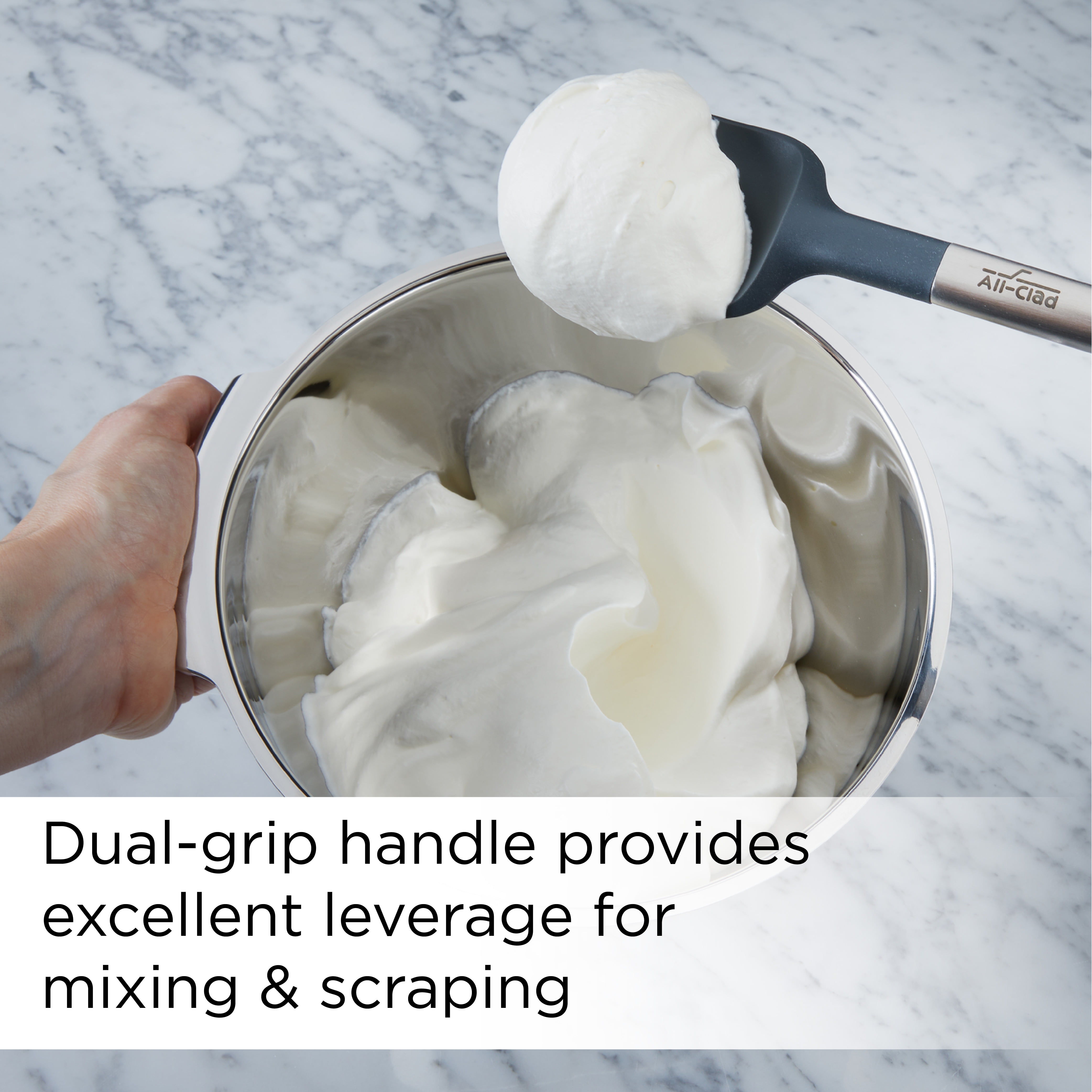 Platinum Silicone Heads: Silicone head is firm enough to scrape but can easily flex to reach into corners Durable, Heat Safe Silicone: Heat safe up to 450 degrees F and safe for use with nonstick cookware and bakeware Easy to Clean: Dishwasher safe and designed to prevent buildup in crevices Brushed stainless steel dual grip handle provides excellent leverage for mixing and scraping Dual Grip Handles