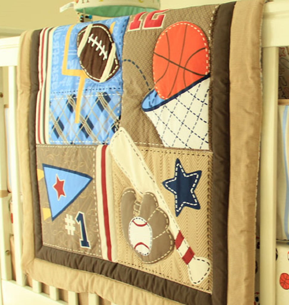 Bring sweet sport style to your baby nursery with this 4-piece Sport Dreams baby bedding set. Our multi-functional crib quilt features a brown border that surrounds tender sports equipment : football, rugby, baseball, basketball, rugby helmets as they play amid a sports field. The crib sheet is soft and stylish for the perfect universal fit, designed for a standard 28” x 52” crib mattress with snug fitting all around elastic. The thoughtfully detailed fitted crib sheet features sport equipment aligned together. The soft brown strip printed bed skirt adds even more dynamism like lying on sports field. Coordinate this set with our nursery décor like window valance, fleece blanket to complete your Sport Dreams baby bedroom.