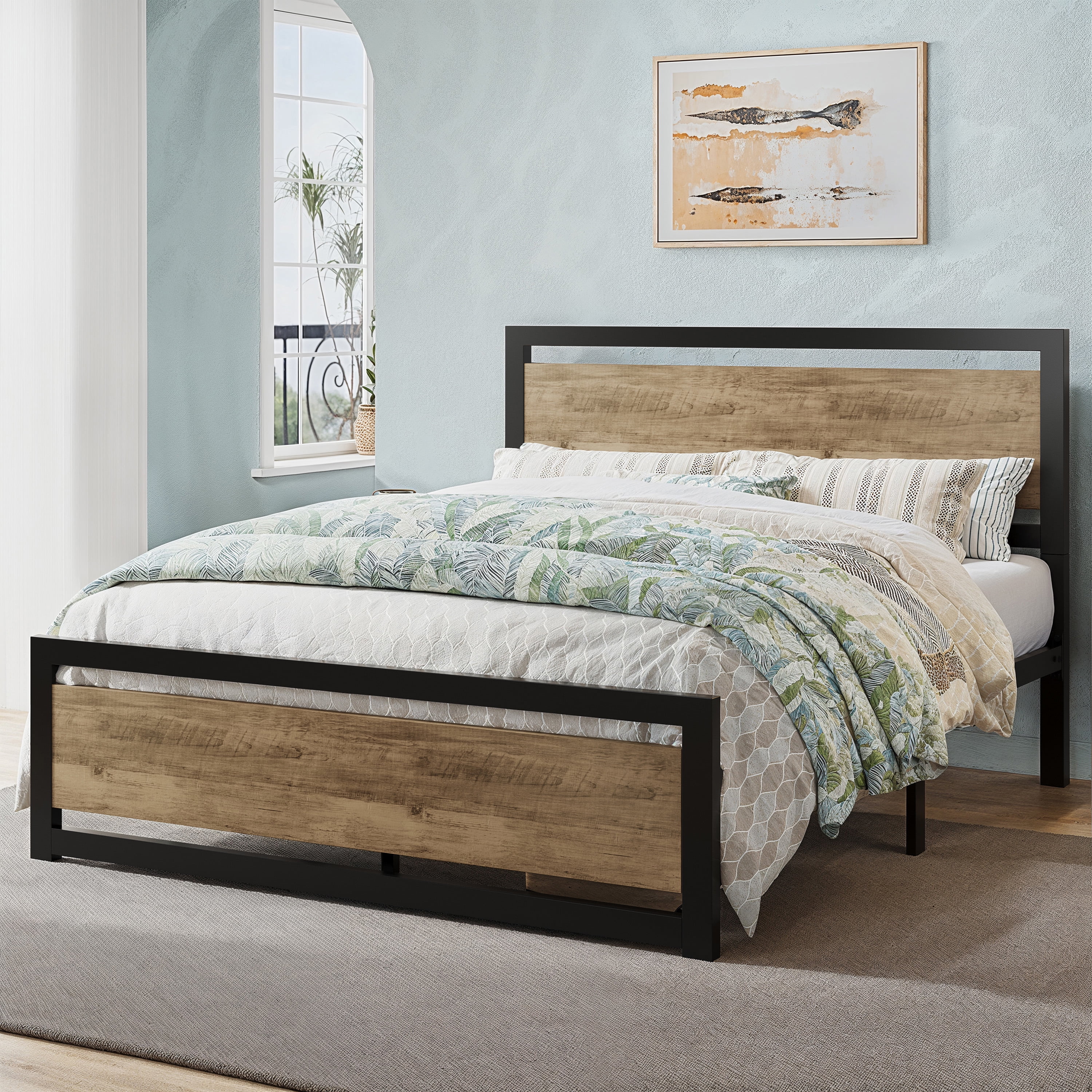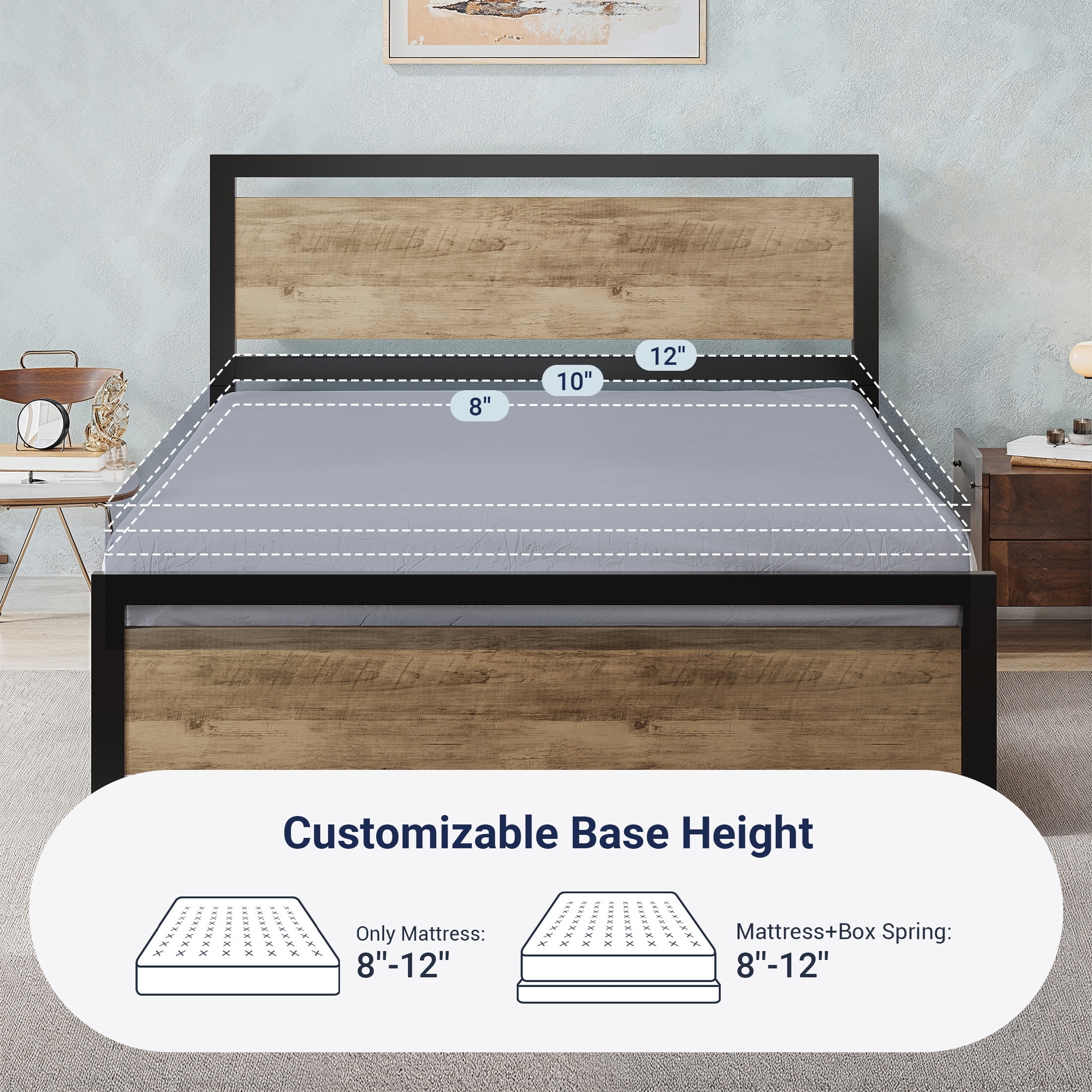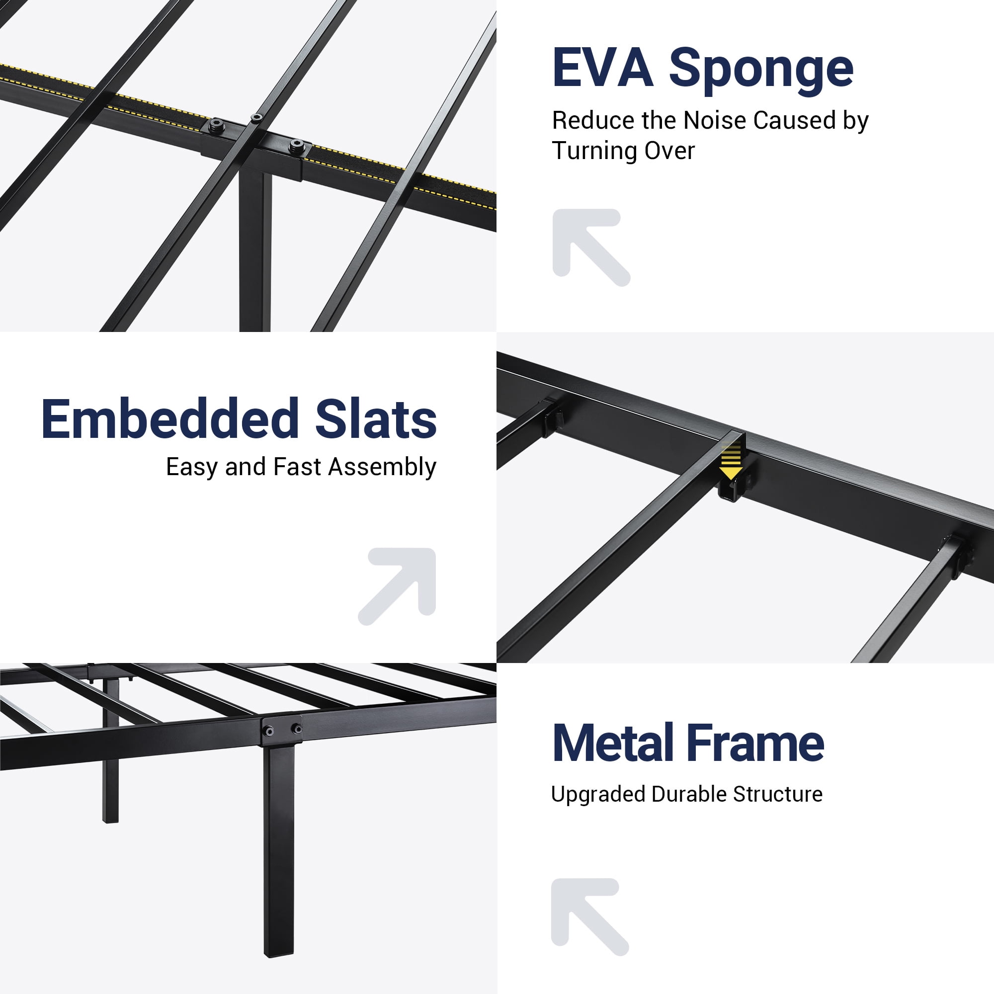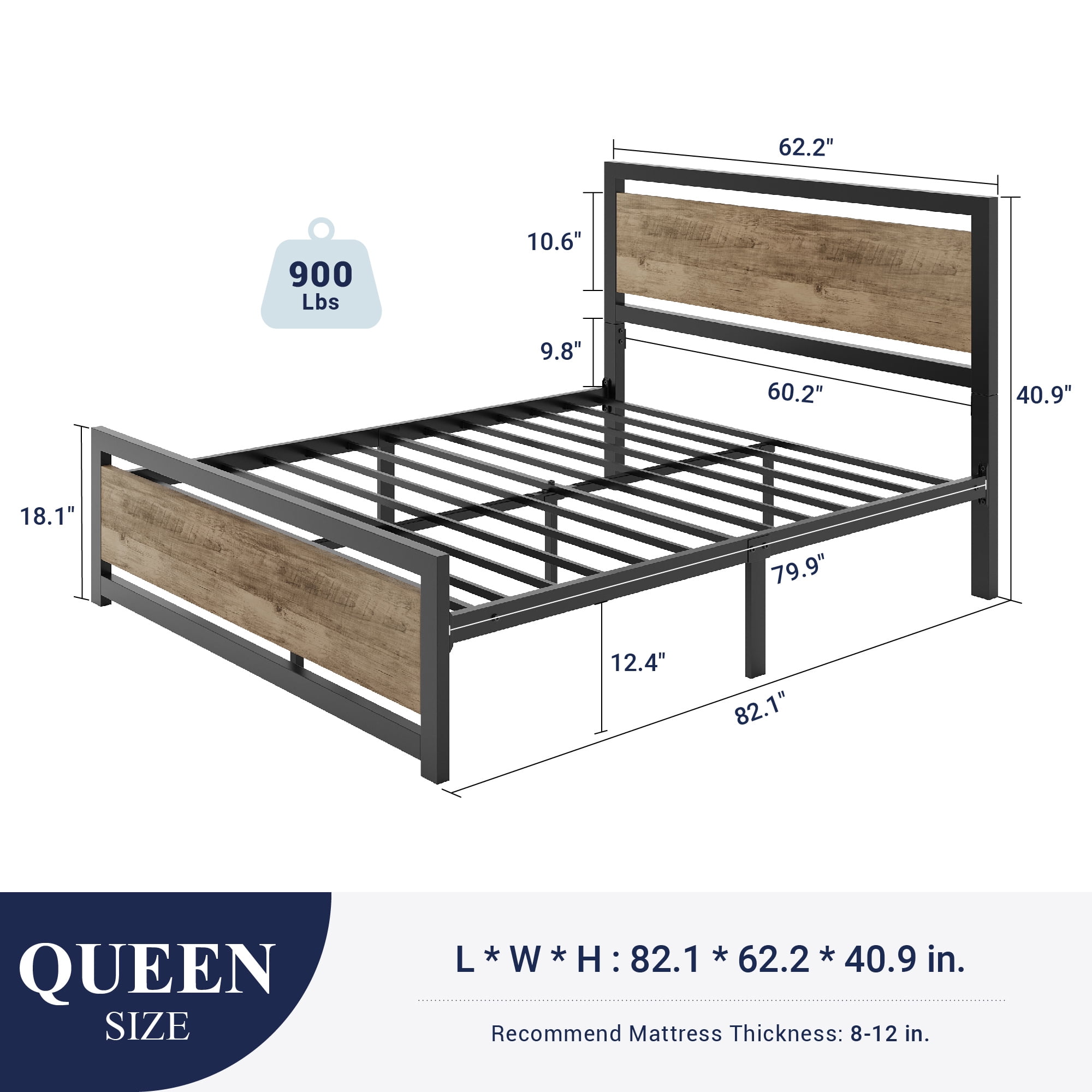 Features: Robust Construction: A heavy-duty metal platform bed frame should feature a robust and durable construction, typically made from high-quality steel or other sturdy metals. This ensures that the bed frame can support the weight of a mattress and occupants without bending or warping over time. Reinforced Support System: Look for a bed frame with a reinforced support system, such as additional support legs or a center support bar. This helps distribute the weight evenly across the frame, preventing sagging in the middle and providing long-lasting support. Ample Weight Capacity: Heavy-duty bed frames should have a high weight capacity to accommodate different mattress sizes and the weight of multiple sleepers. A reliable heavy-duty frame can often support weights well above the average to ensure stability and safety. Noise-Free Design: A quality heavy-duty metal bed frame should be designed to minimize noise and vibrations. This is especially important for couples or those who are easily disturbed by creaks and squeaks during the night. Look for features like noise-reducing joints and connectors. Easy Assembly and Disassembly: Choose a bed frame that is easy to assemble and disassemble. Look for frames with clear instructions, labeled parts, and tools included for hassle-free setup. This is particularly useful for those who may need to move or transport the bed frame at some point. Specifications: Available Color: Brown / Black Available Size: Full / Queen Weight Capacity: 900lbs. Install Required: Yes Material: Metal / Wood Package Weight: 75.17 / 82.01 lbs. Box Spring Required: No Dimension: Full Product Dimension: 77.4″L x 55.9″W x 40.9″H Full Package Dimension: 58.8″L x 22.2″W x 4.3″H Queen Package Dimension: 66.1″L x 22.2″W x 4.3″H Queen Product Dimension: 82.1″L x 62.2″W x 40.9″H Additional Features: Easy-to-clean and waterproof headboard and footboard 12.4″ Under bed storage space organizer room Embedded design facilitates slats assembly EVA sponge reduces the noise caused by turning over A combination of industrial style and modern style High-quality metal frame ensures a maximum capacity of 900 lbs Whether to use a box spring is up to you Recommended Mattress+box spring Height: 10″-14″ The Allewie team is always online Explore More for Allewie products
