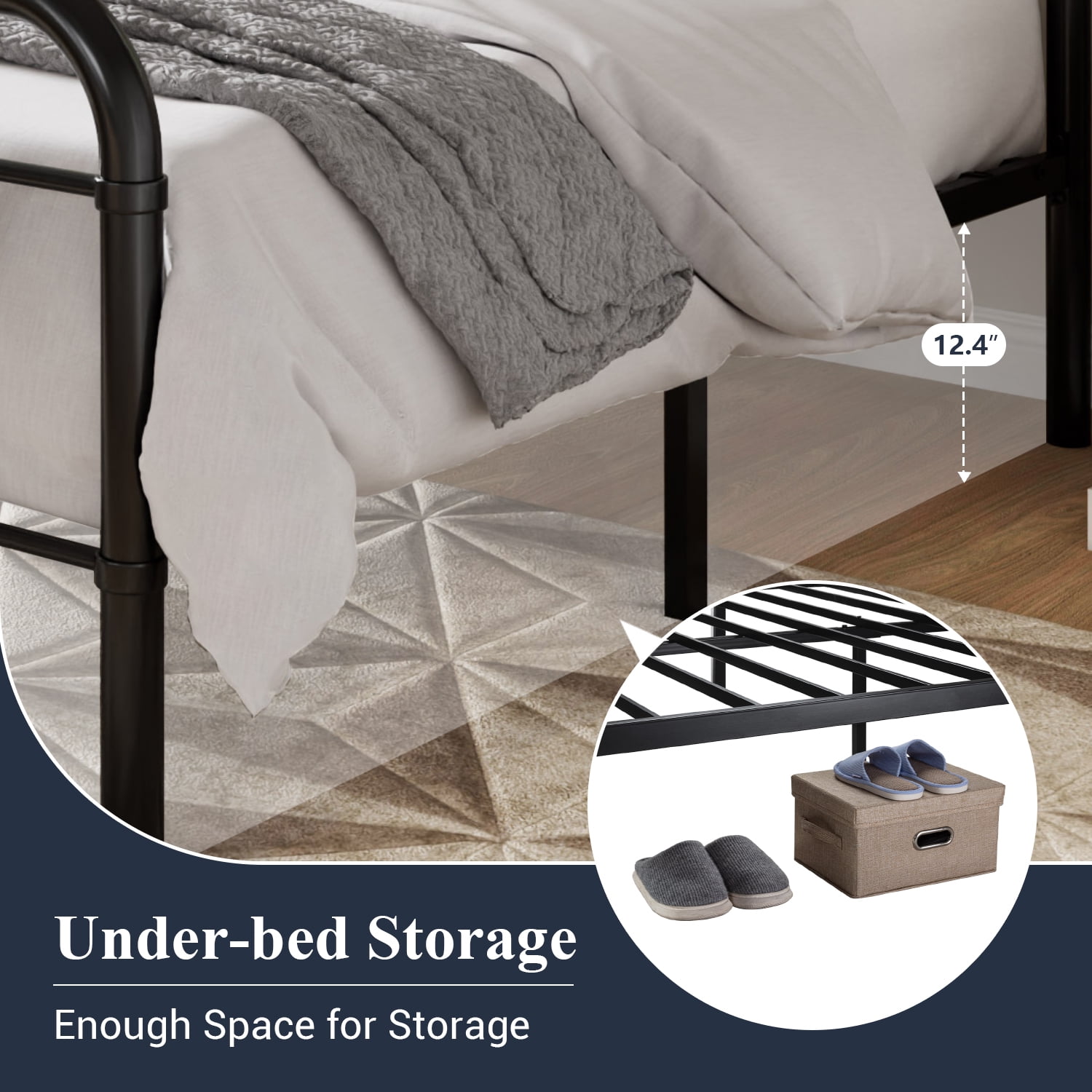 Features: Vintage and Classic Platform Bed: The bed frame is visually rustic but can be matched with different styles of home decoration to create a diverse bedroom. Slatted Support and Underbed Storage: Metal slats extend the life of the mattress, and don’t need to buy box springs. The high bed foot(12.4 inches) design frees up more space under the bed, which is good for us to store other items. High Headboard and Safety Design: The moderate height of the headboard allows you to lean against the head of the bed and the curved bed corners ensure the safety of your head. Sturdy and Durable: The sturdy metal structure has a load-bearing capacity of up to 800 pounds, and the thickened bed foot makes the bed not shake. The powder coating on the surface makes the product have a certain degree of rust resistance and wear resistance. Easy to Assemble: We have the necessary assembly tools and the installation process only takes 30 minutes and saves a lot of time. Specifications: Available Size: Full / Queen / King Available Color: Black / White Material: Metal Style: Victorian Maximum Weight Recommendation: 800 Pounds Included Components: Headboard, Assembled Tool, Slat, Instruction, Footboard (Mattress not included) Dimensions: Full Size Dimensions: 77.9″L x 54.3″W x 47.6″H Queen Size Dimensions: 82.9″L x 60.6″W x 47.6″H King Size Dimensions: 82.9″L x 76.4″W x 47.6″H Explore More for Allewie products