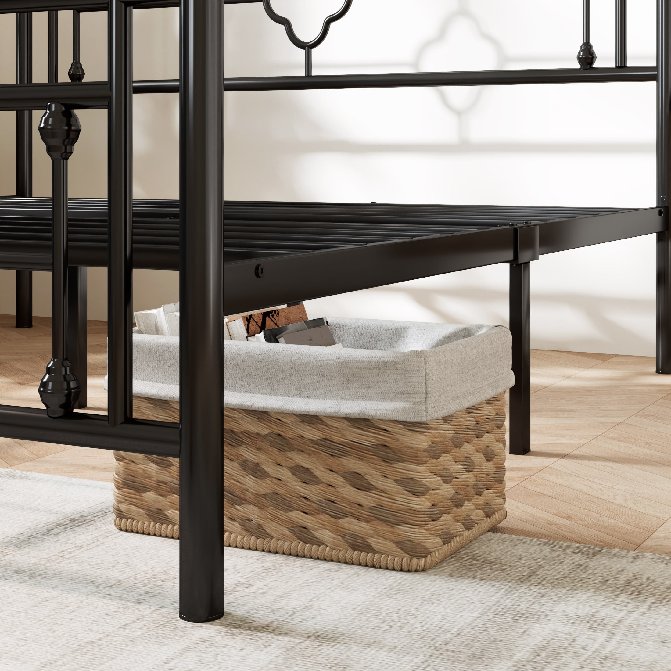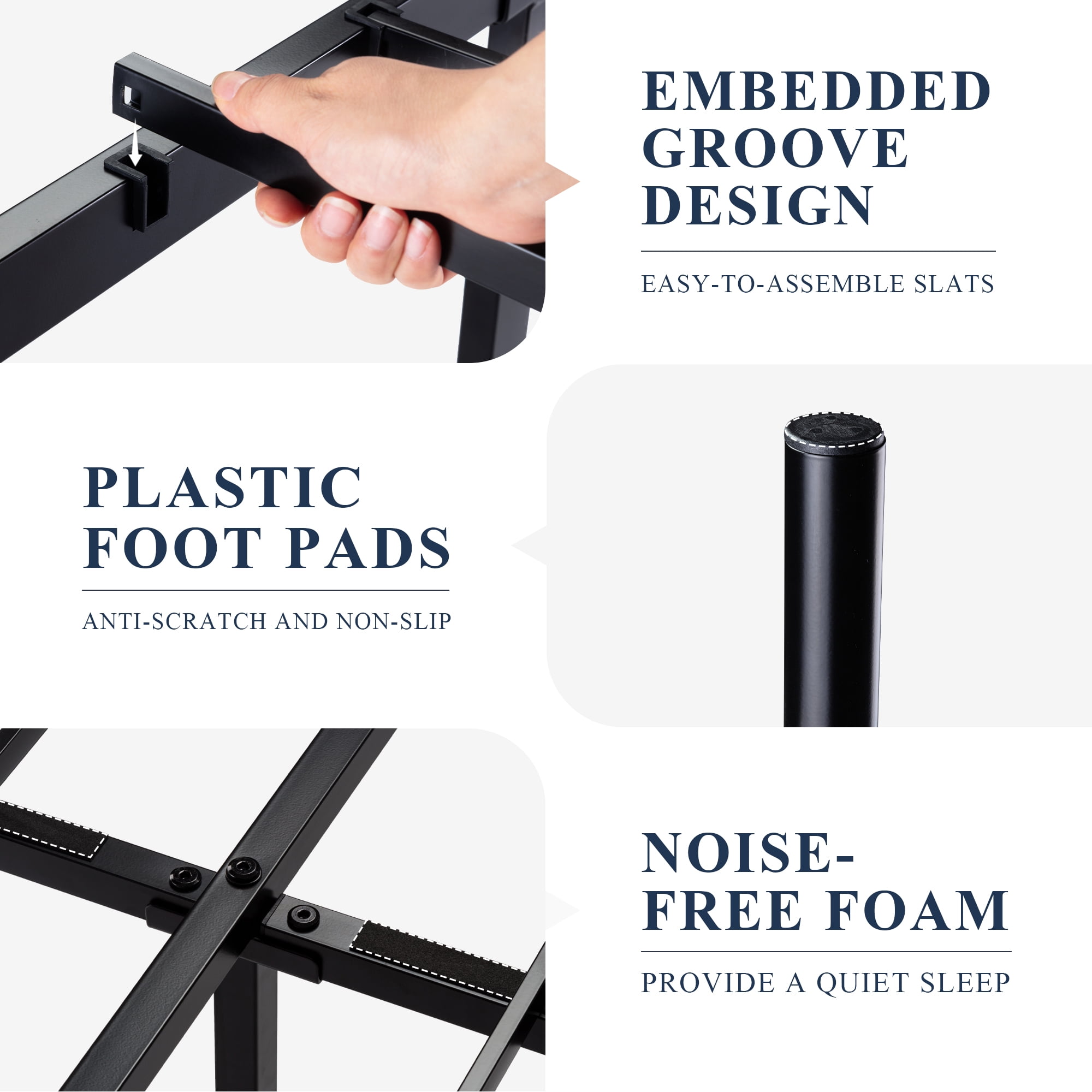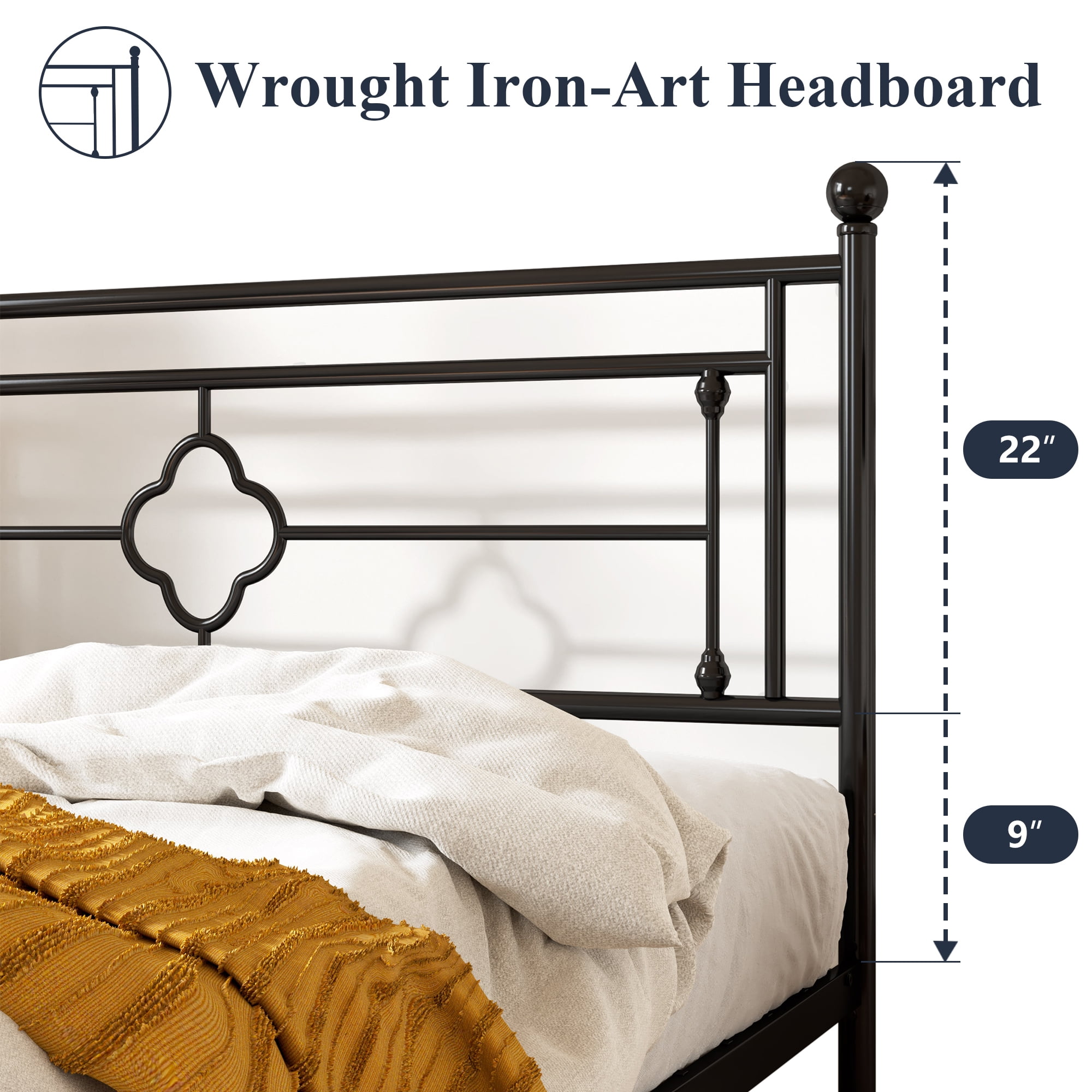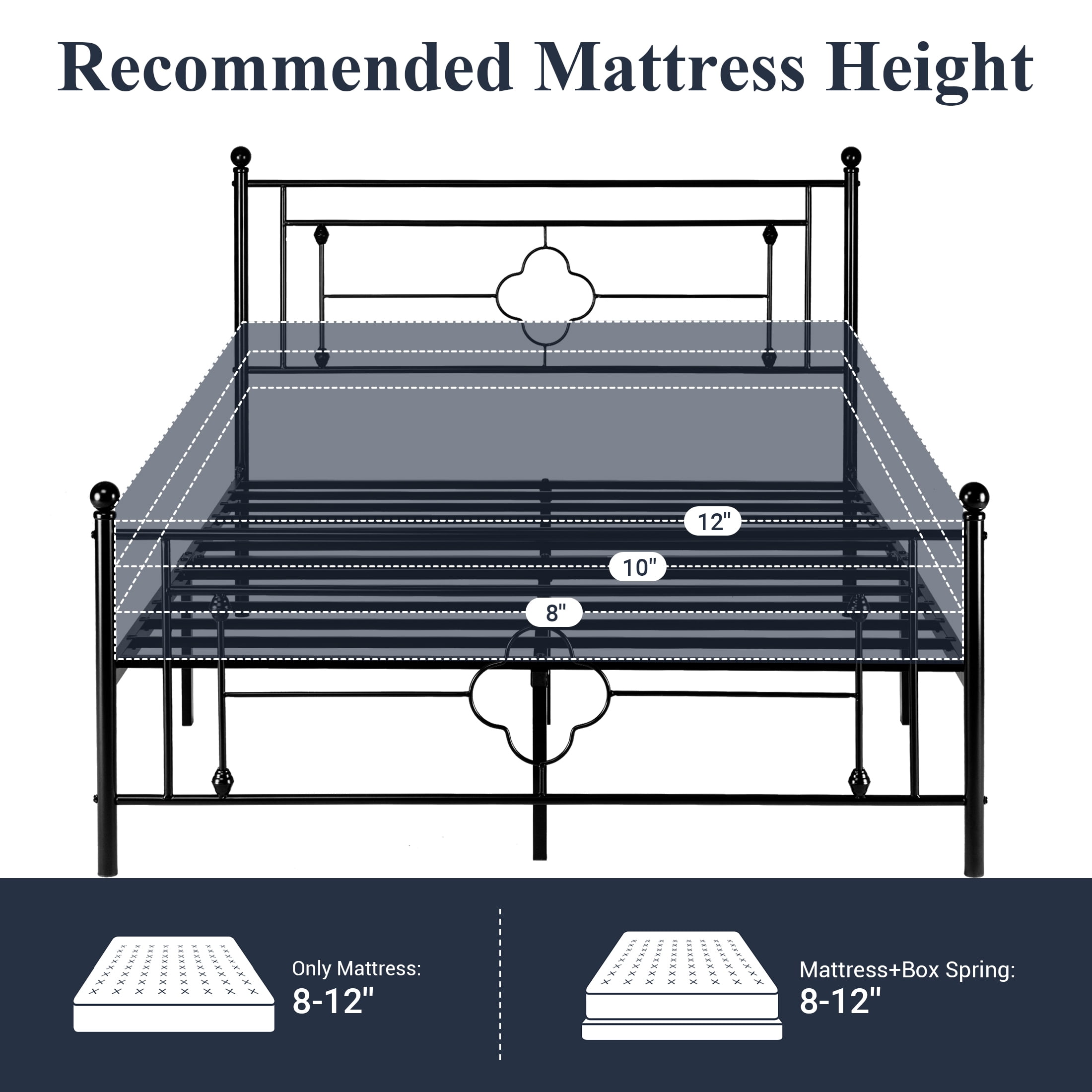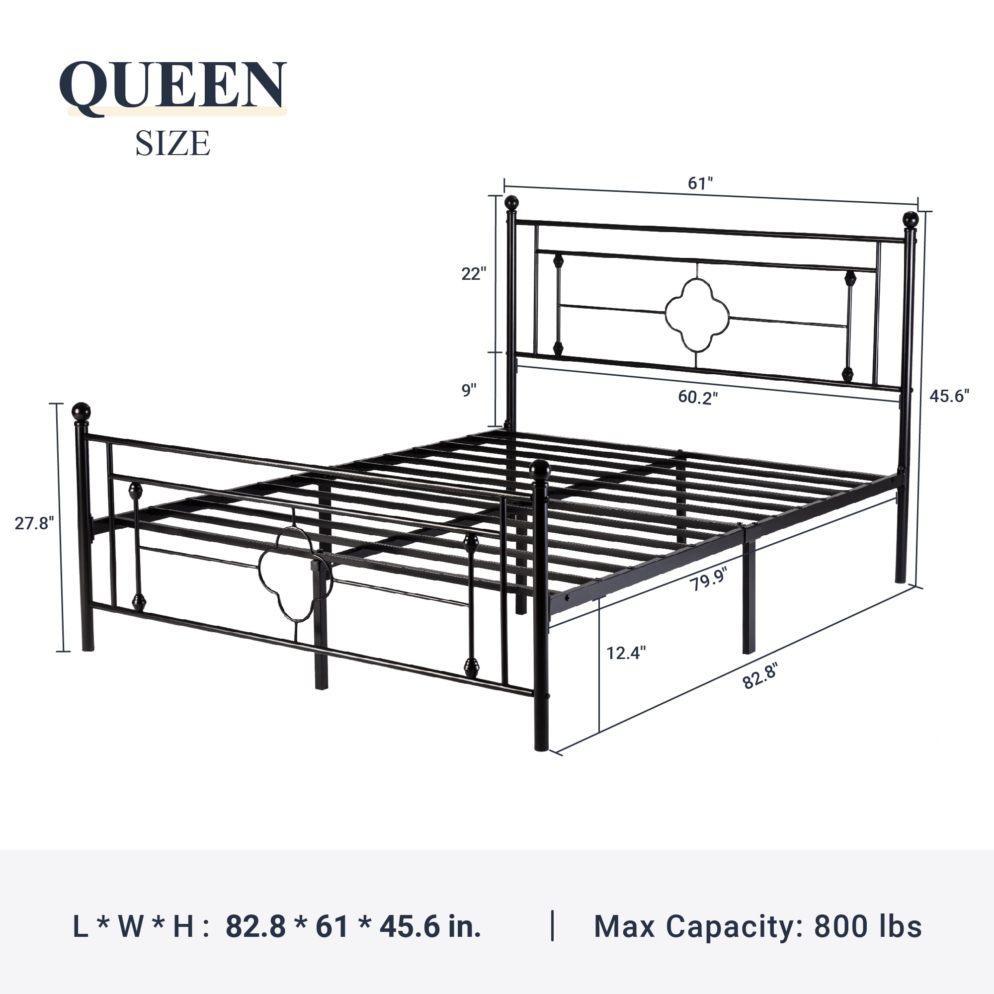 Features: Stylish Design: Crafted with classic finial bed posts and ball finial accents on headboard and footboard, easily blended with modern, traditional, farmhouse, and rustic home decor. Sturdy & Durable: This mattress foundation is constructed of a metal frame and firmly fixed metal slats to ensure stability. No box spring is needed. 800 lbs weight capacity. Space Saving: 12.4 inches of under-bed clearance for storing various stuff such as clothes, toys, or quilts. Ample hidden storage space also makes your room tidy and well-organized. Quiet Sleep: U-shaped groove and sponge on metal beams will reduce the friction from the steel frame. Any noise can be eliminated. Enjoy every silent second for a good night’s sleep. Easy Assembly: Comes with all parts, instructions, and needed tools. Please follow the instruction and the assembly will be finished in half an hour. Specifications: Available Size: Twin / Full / Queen / King Maximum Weight Recommendation: 600 / 800 / 800 / 800 Pounds Available Color: Black / White / Pink / Gold Material: Metal Assembly Required: Yes Box Spring Needed: No Special Feature: Squeak Resistant Included Components: Headboard, Slat, Footboard, Instruction, Hardware, Tools Explore More for Allewie products Dimension: Twin Size: 78″L x 39.8″W x 46.6″H Full Size: 78″L x 54.7″W x 46.6″H Queen Size: 82.8″L x 61″W x 46.6″H King Size: 82.8″L x 76.8″W x 45.6″H