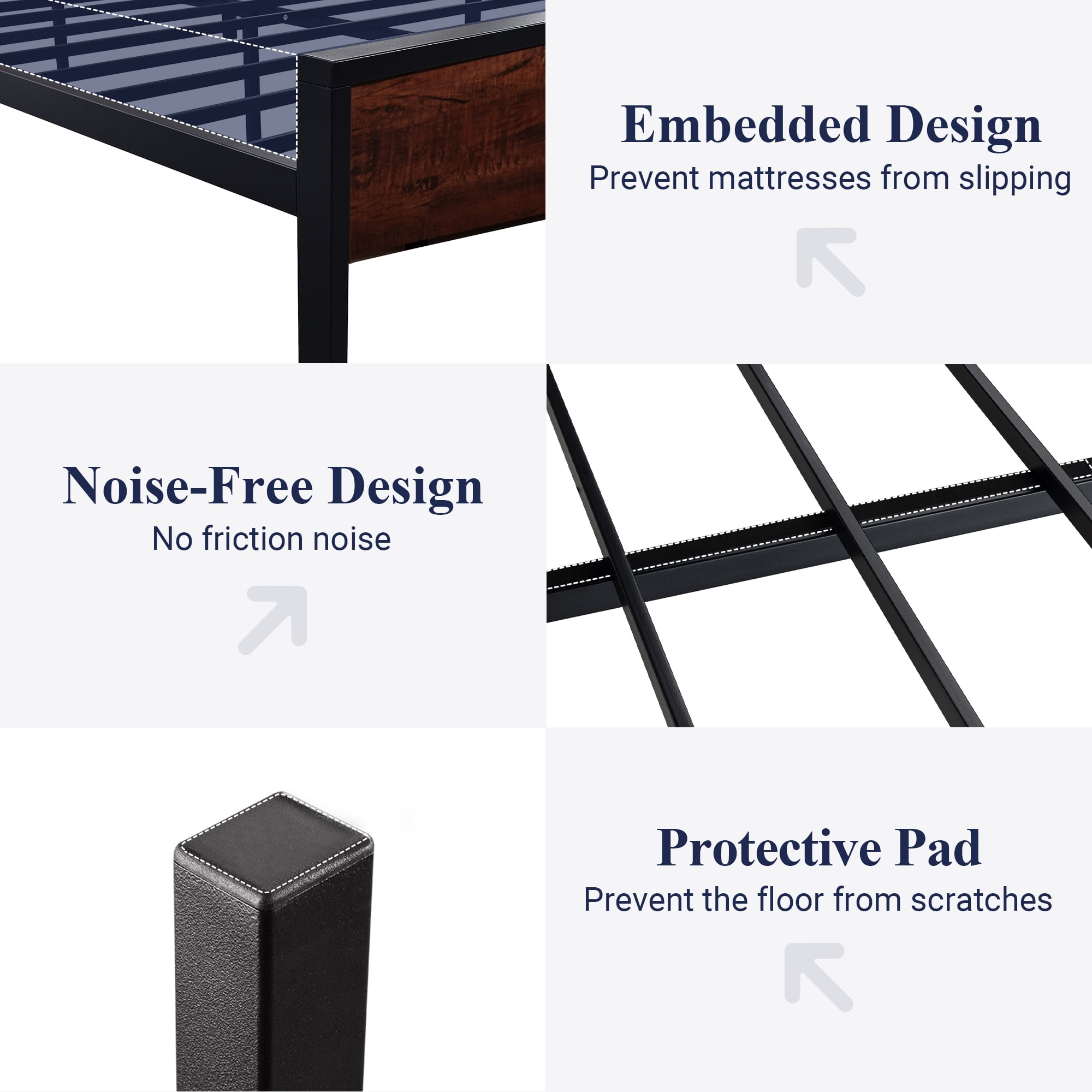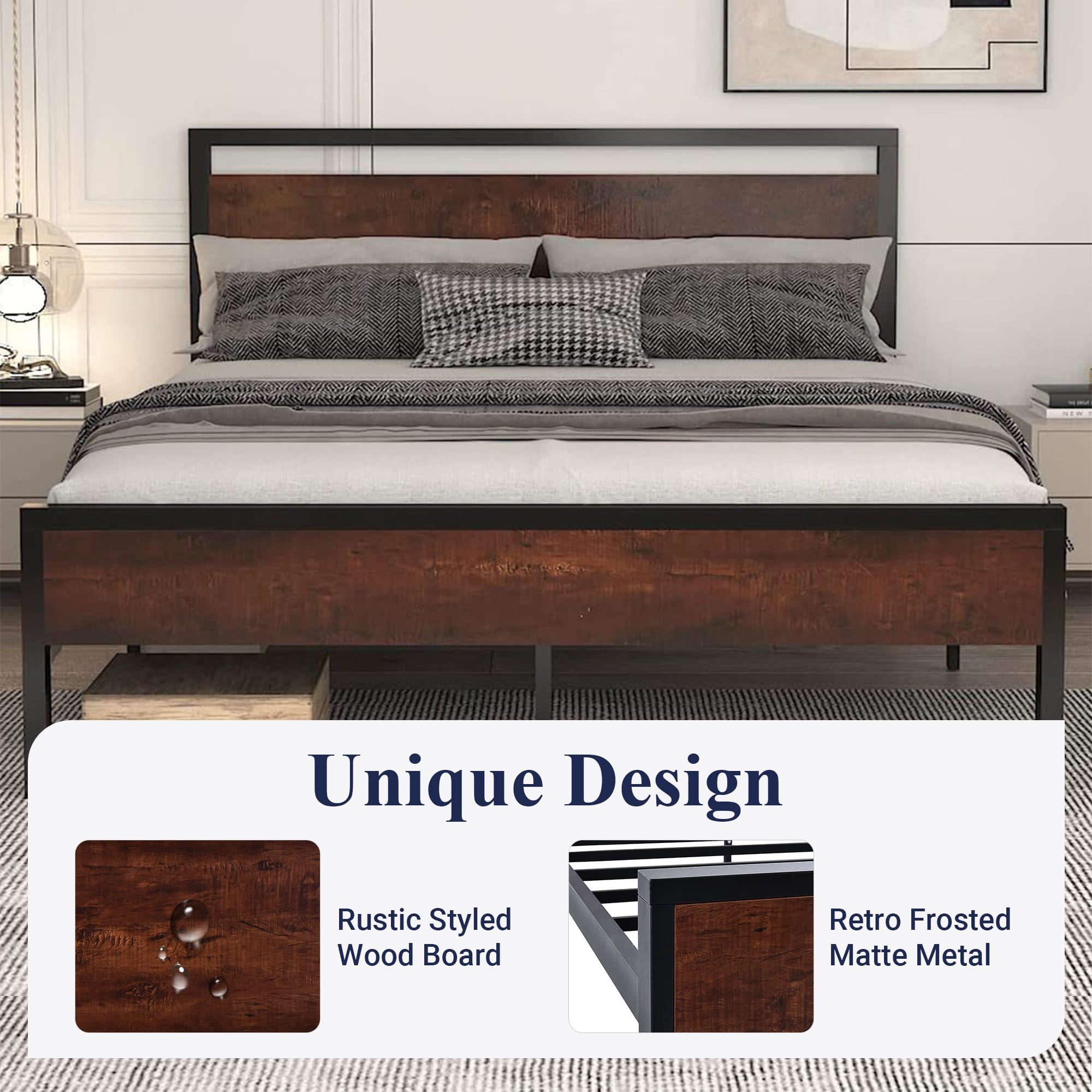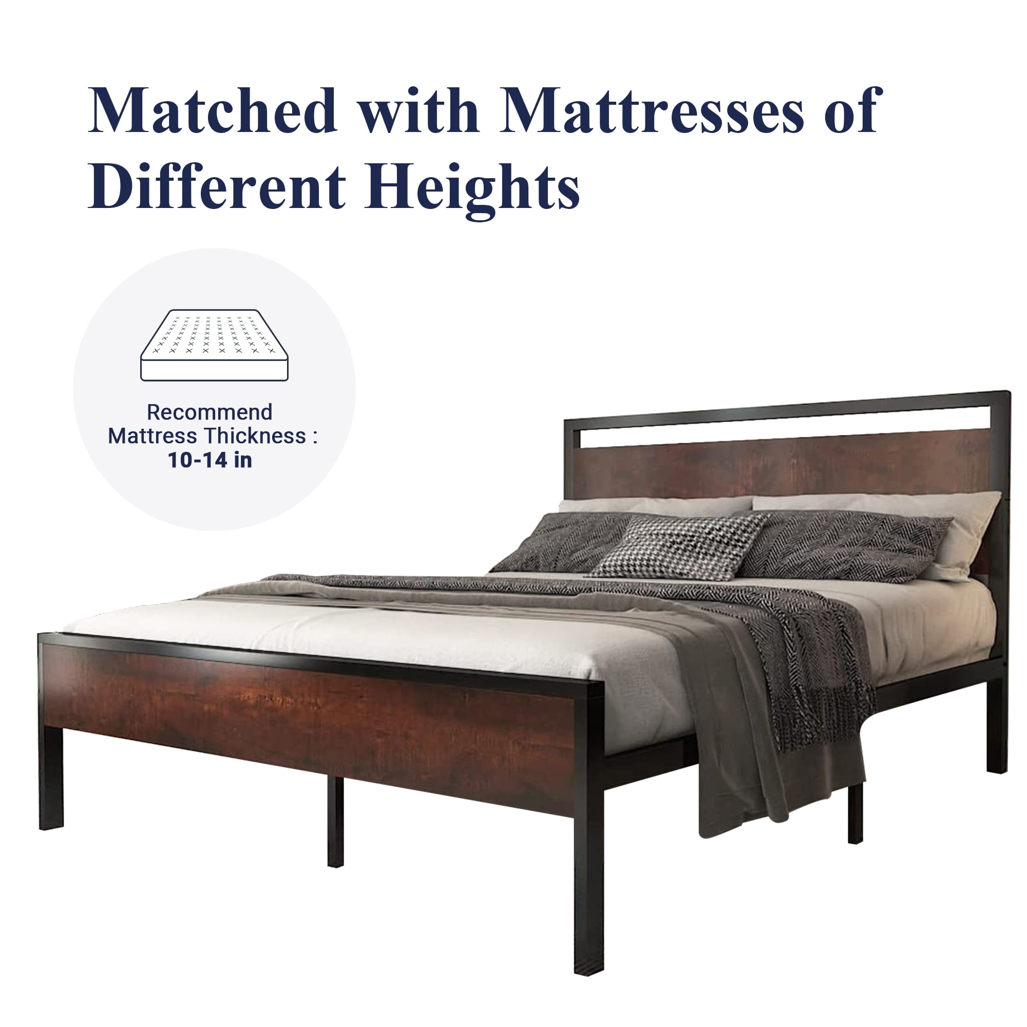 Allewie Queen Size Bed Frame, Heavy Duty Metal Platform Bed with Wooden Industrial Headboard & Footboard, No Box Spring Needed, Mahogany