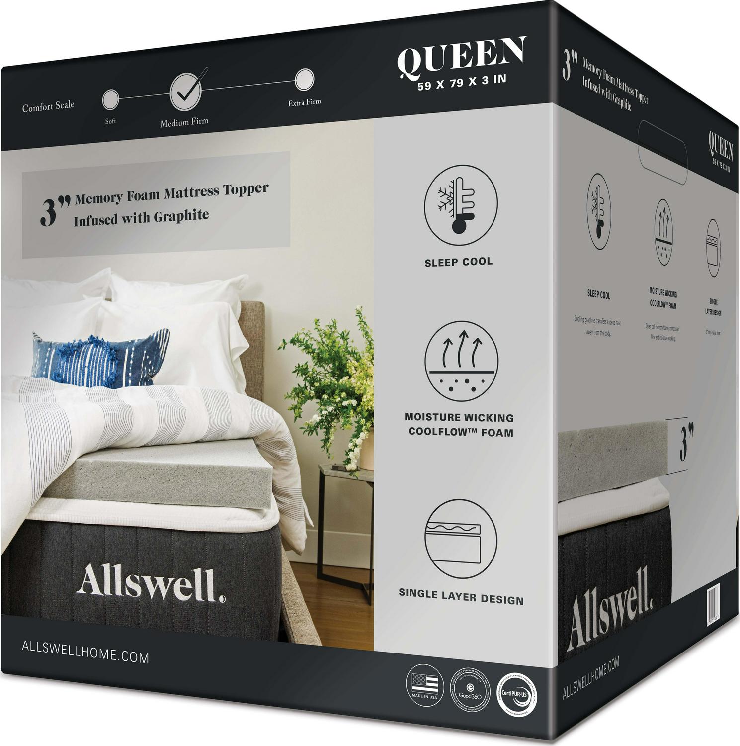 The Allswell 3-Inch Sleep Cool Memory Foam Mattress Topper Infused with Graphite offers extra comfort and support at an exceptional value. Infused with cooling graphite particles, this trusty toppers layer of plush memory foam will upgrade your sleep situation without upending your budget. We’ve spent lots of time and effort and forfeited quite a few full nights of sleep to make sure our mattresses are as supportive and comfortable as we can possibly make them. And we’ll keep working to make them better. But, we figured, why stop there As we pursue our goals of building ever-more-fabulous mattresses in the hopes of providing great sleep for all, we asked ourselves: What about those who currently have and love their new Allswell What if they could get an even better mattress without buying a new mattress Enter our line of toppers. Just like our mattresses themselves, they’re a cushy testament to our passion for great sleep, blending state-of-the-art materials and smart technology but at a price that’s downright retro. With their layers of luxe memory foam and a refreshingly cooling feel, the Allswell 3-Inch Sleep Cool Memory Foam Mattress Topper Infused with Graphite is designed to take your mattress a level up and make your Allswell dreams even sweeter.