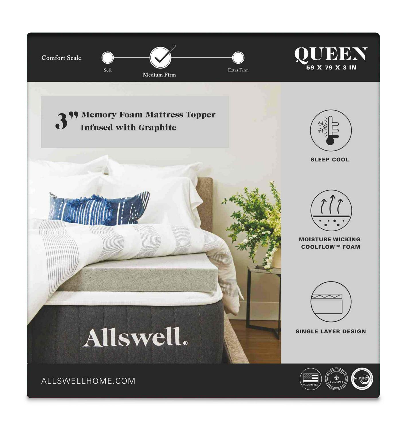 Allswell 3 Sleep Cool Memory Foam Mattress Topper Infused with Graphite, Queen