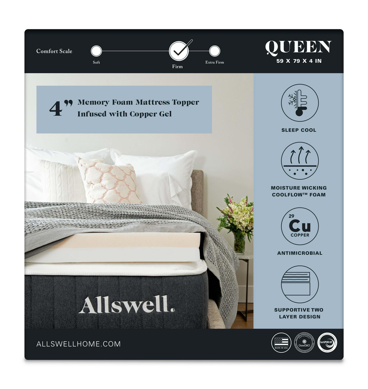 Allswell 4 Memory Foam Mattress Topper Infused with Copper Gel, Queen