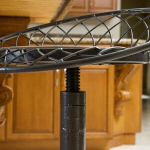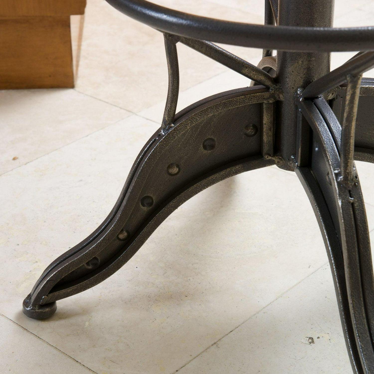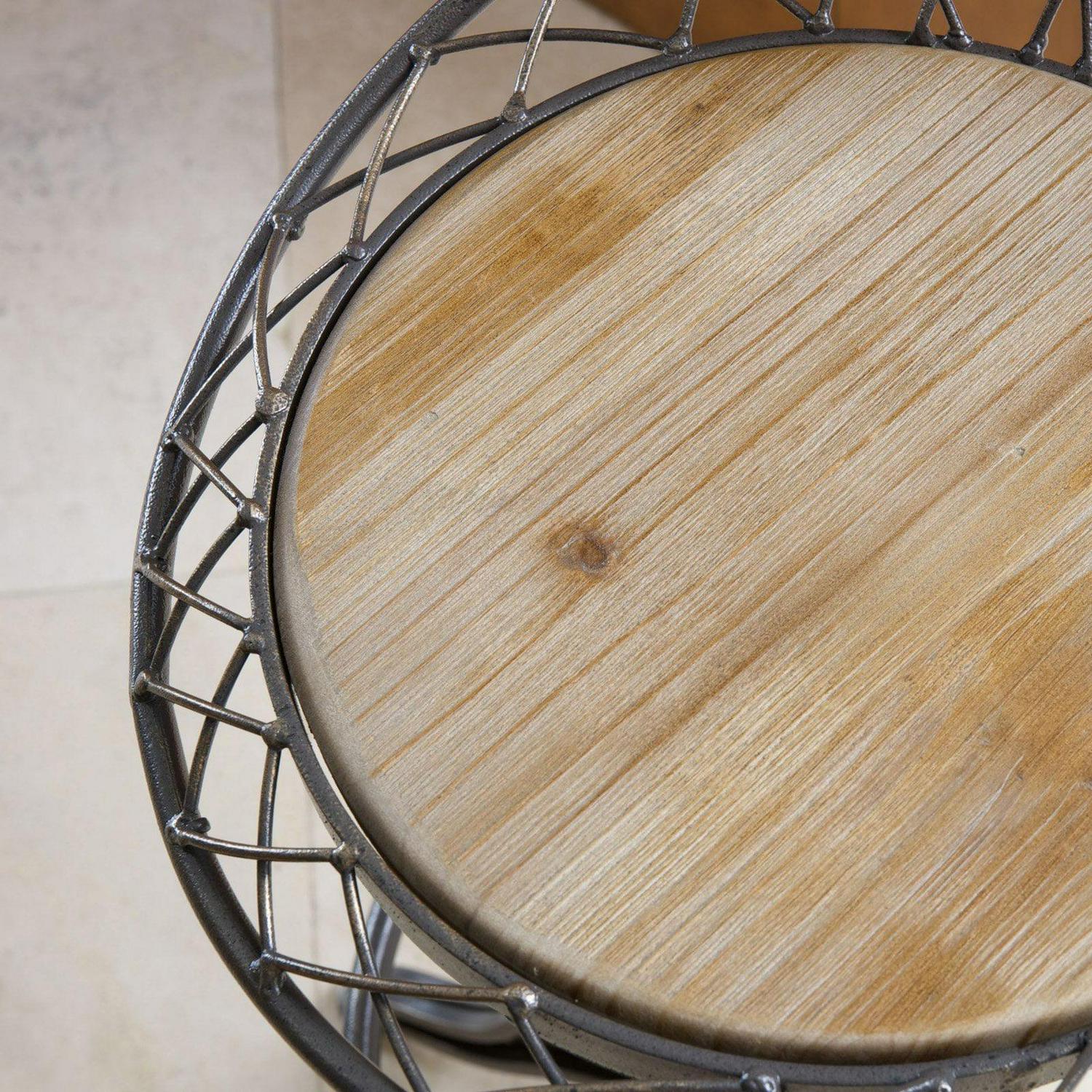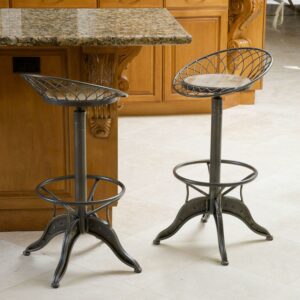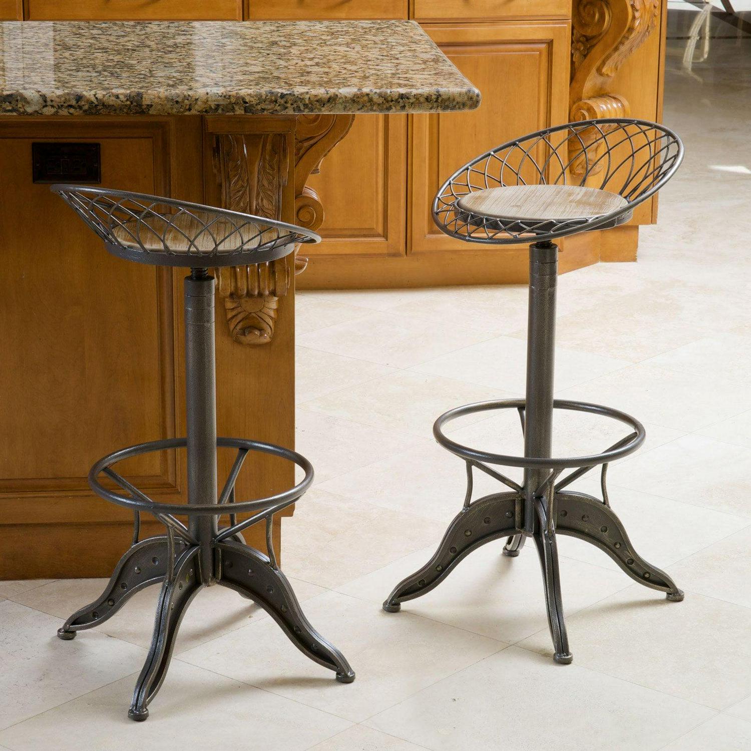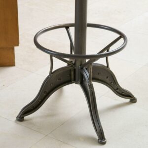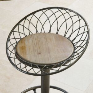 Add steampunk sizzle to your décor with the Alonso Swivel Counter Stool. Crafted of gray-finished iron with an open-grained round wooden seat framed by a tilted, latticed “hoop skirt,” this counter height stool is built to impress and to last. The seat features a weathered oak finish and swivels for comfort. A 360-degree footrest railing sits just above the heavy, sturdy tripod base with edgy rivet detailing. Lift or lower the seat with ease; seat height can range from 26 to 30 inches