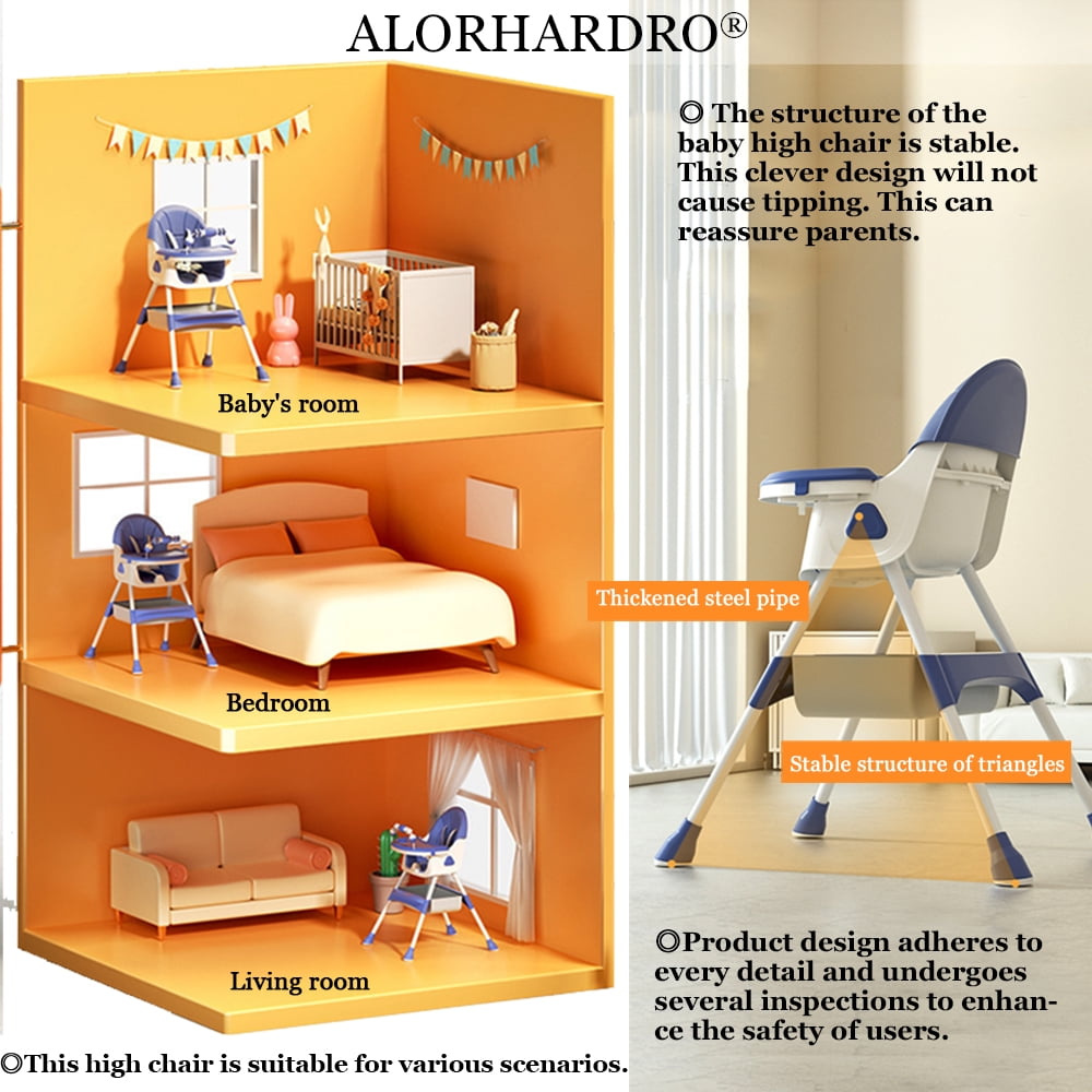 4 IN 1 HIGHCHAIR – The high chair with adjustable height can be matched with tables with different heights. It can be assembled into a high chair, which enables children from 6 months to 5 years old to eat at the table. It can also be assembled into a small stool to accompany unisex children’s growth. In addition, it can also be folded and placed in a very narrow space. At the same time, the classic and exquisite appearance will add luster to your house. Simple and modern style is suitable for any decoration of your living room, dining room or bedroom. REMOVABLE PU CUSHION – The soft and thickened seat cushion is made of skin-friendly PU material. Hygienic and safe materials can be suitable for children ages 6 months to 5 years. The waterproof surface is easy to wipe. Simple stains can be cleaned directly with paper towels. This is a parent-friendly product. However, it is not recommended to wash the seat cushion with a washing machine, which will easily deform the seat and shorten the service life of the seat. The seat adopts a non-displacement design and ergonomic design, and the seat cushion will not slide or shift, so children can change their posture at will and sit more comfortable. At the same time, it also reduces a lot of trouble for parents to feed children. STABLE STRUCTURE – It is designed as an A-shaped structure. The special horseshoe foot of the chair provides four angles of support. The feet are made of rubber, which can not only protect the floor of the home, but also increase the friction with the ground and play a greater non-slip role. The support of the chair is adjustable in height. The seat also adds a strap, which is a five-point safety belt to regulate your baby’s sitting posture. This reflects our protection awareness and safety consideration for children. In addition, 4 pulleys were also given as gifts. The pulley can be locked to stay still. If you want the high chair to be more stable and safe, parents are advised not to use pulleys. Installing the pulley is just more convenient for it to change its position. VARIOUS UPGRADED ACCESSORIES – The high chair comes with detachable tray, detachable toy rack, bowl with suction cup, bib and storage basket. This will bring more convenience to parents. The removable tray can be removed for cleaning at any time.The detachable toy rack can make children eat more happily. Bowls with suction cups can prevent children from playing and spilling food. A bib can solve the problem of food dirtying clothes. The storage basket can store some commonly used things to save space. HIGH QUALITY – Safety is an important consideration as well, we seriously declare that it is BPA free.This material will not affect human health. Your children is ready for the journey from bottle feeding to independent eating. EXCELLENT SERVICE – If you encounter difficulties during installation, please contact customer service in time. We will provide you with video or picture installation instructions within 12 hours. Please pay attention to the size of the product and clarify your requirements before purchasing. Due to the large volume and weight of the product, we hope to avoid causing unnecessary after-sales trouble to the buyer and carrier. Thank you for your understanding! All images and videos were designed and filmed by ALORHARDRO. Unauthorized use is not allowed. If any discovery is made, it will be held accountable.
