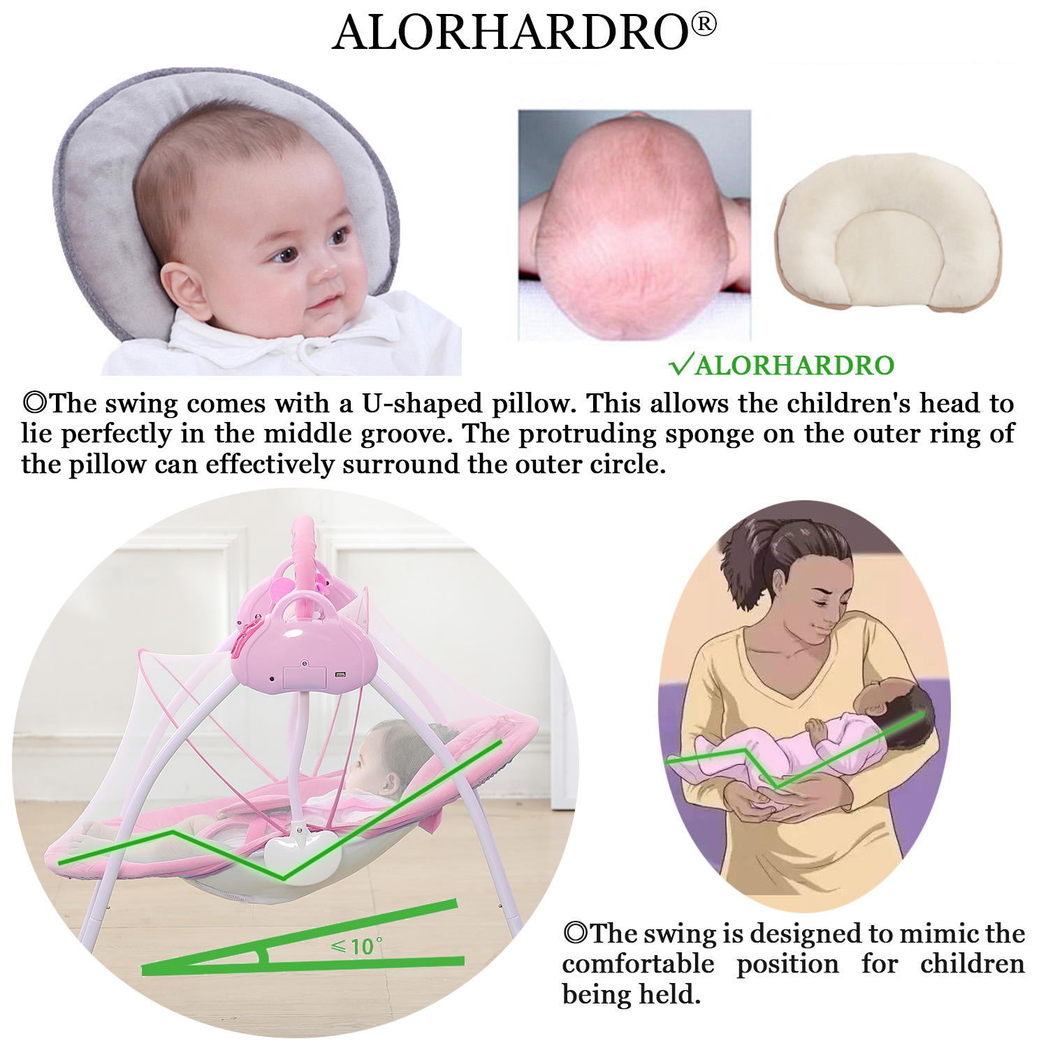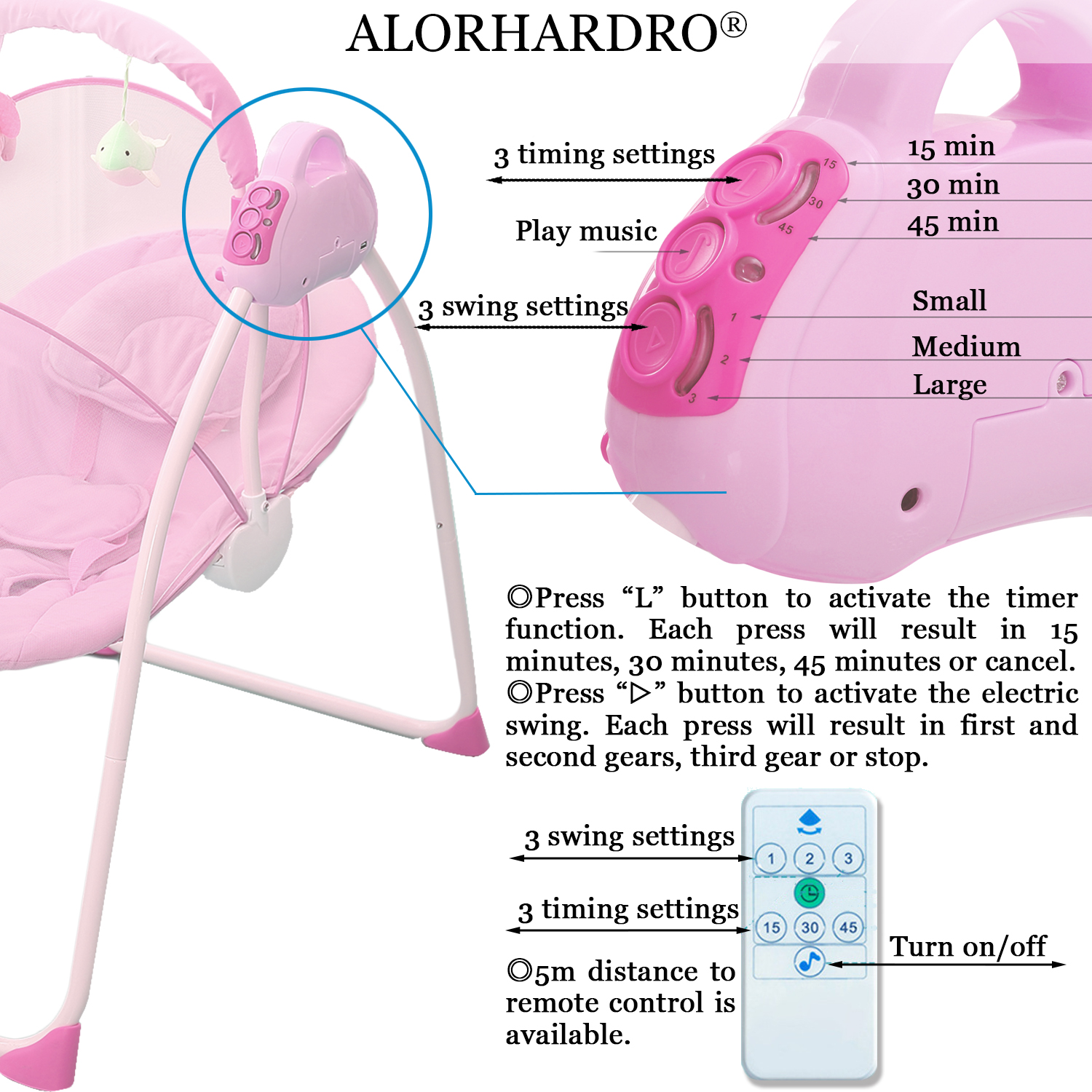 Great Relief for New Parents – Featuring 3 swing angles and 3 timing settings, this smart swing moves at a constant speed so kids can quickly get familiar and fall in love with its pace.It relieves parents from holding the kids all day and especially at midnight. Anytime needed, it swings your child, comfortably and soothingly.In addition, 3 swinging speeds are all very gentle and smooth, not significant,do not cause discomfort. Sweet Lullabies & Timing Function – This swing comes with 12 built-in lullabies to lull your child to rest. It also supports connecting to your phone so you can play whatever you want your child to listen to, a piano piece or a lullaby that you’ve heard when you are a child. Let it soothe your child to sweeter rest while swinging gently. Ergonomics for Comfort – With the arc-shaped design, it makes the child feel like it is in the arms with enough comfort .The seat can fit baby’s back well, allowing body to relax.The baby swing is made of metal bracket, streamlined arc, and solid support.The incline angle between back and seat is less than 10°. 5-point Harness System – Equipped with an adjustable 5-point harness system, this compact baby swing for infants can firmly hold on your baby.This makes baby and parents enjoy a more relaxed time. Easy to Power Up & Control- Made for easy use, it can work once connected to a power outlet, requiring no batteries or charging. With a convenient control panel and remote control, you can play lullabies, set a timer, adjust the swing angles with just a press when you’re doing housework or busy in your e-meeting. Detachable & Machine Washable – The detachable fly-net, pillow, and seat cover add great convenience for machine wash. It measures 33.46*32.67*20.47 in, fitting in most rooms easily. Product Information Material: Alloy Steel/ Polyester Fiber/ ABS Type: Baby Swing Applicable Age: 0-18 Months Weight: Below 30 lbs Size: 33.46*32.67*20.47 in Color: blue,pink Power Supply: 5V/1A Power: 1-3W Weight: 8.8lbs Packing: 1 Piece All images and videos were designed and filmed by ALORHARDRO. Unauthorized use is not allowed. If any discovery is made, it will be held accountable.