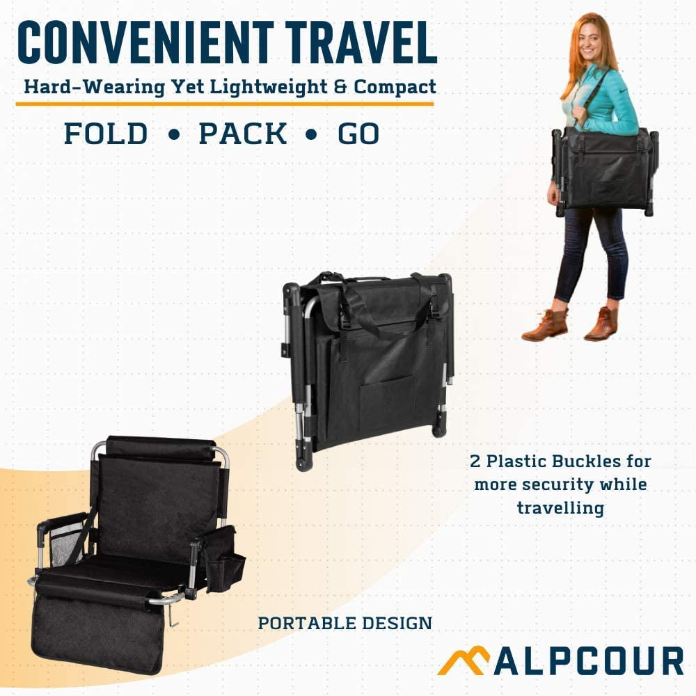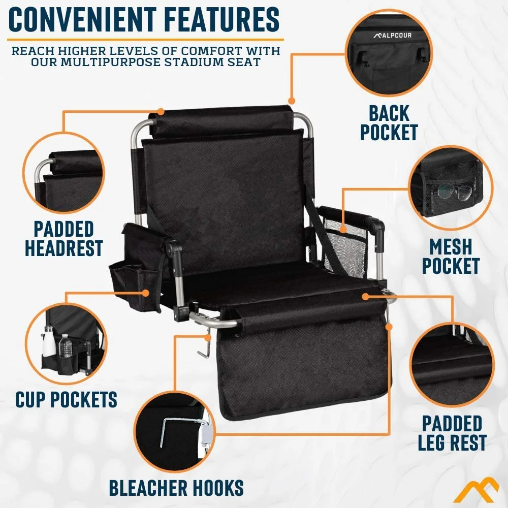 DURABLE CONSTRUCTION: The Alpcour Foldable Stadium Bleacher Seat is built to last with high-quality alloy frames and a thick Oxford fabric. The sturdy alloy frames provide robust support to the seat base, armrest, and backrest, ensuring long-lasting durability. The Oxford fabric is known for its resilience and sturdiness, guaranteeing a comfortable seating experience. PORTABLE AND CONVENIENT: This stadium seat is designed for portability and convenience. It is lightweight and features quality plastic joints that enable folding, making it easy to transport and store. Whether you’re heading to a stadium, concert, outdoor event, or camping trip, you can easily bring this seat along in your car trunk or while traveling. ENHANCED COMFORT: The Alpcour stadium seat prioritizes user comfort with its thick cushions on the backrest and seat. These cushions provide extra padding and support, ensuring a comfortable seating experience even during long events. The armrests are also wrapped with padded Oxford fabric for a soft feel, and the padding is removable for easy cleaning. FUNCTIONAL DESIGN: This stadium seat features hooks on the base frame to secure it in place on bleachers or stadium seats, ensuring stability during use. It also has buckles to keep the seat folded when not in use, making storage and transportation hassle-free. AMPLE STORAGE: The convenience-centered design of the Alpcour stadium seat includes four pockets. There is a cup holder on one side for keeping your drinks upright, a side mesh pocket for storing gadgets securely, and two larger pockets behind the backrest for storing bigger items like magazines and personal belongings. These pockets provide convenient storage options, keeping your essentials within reach during events or outings.
